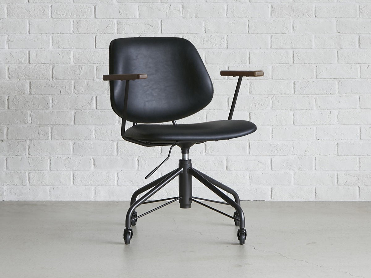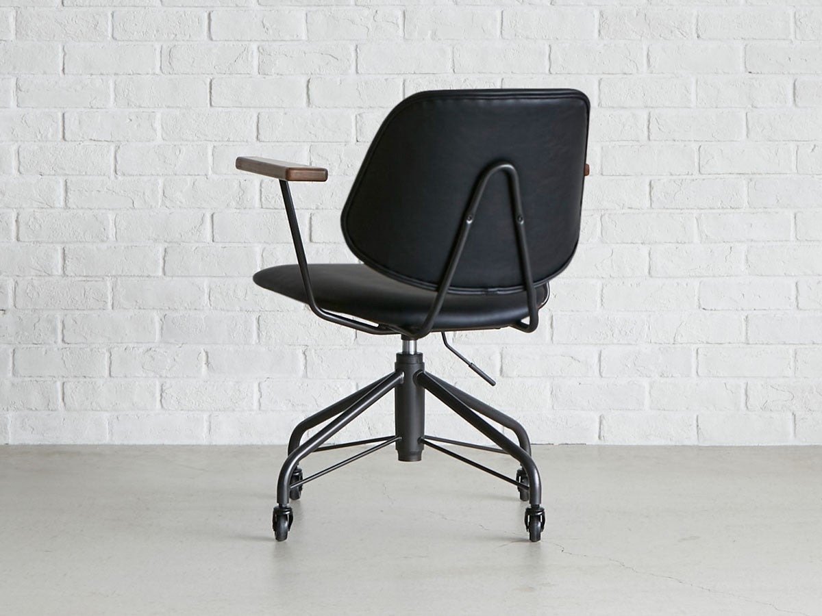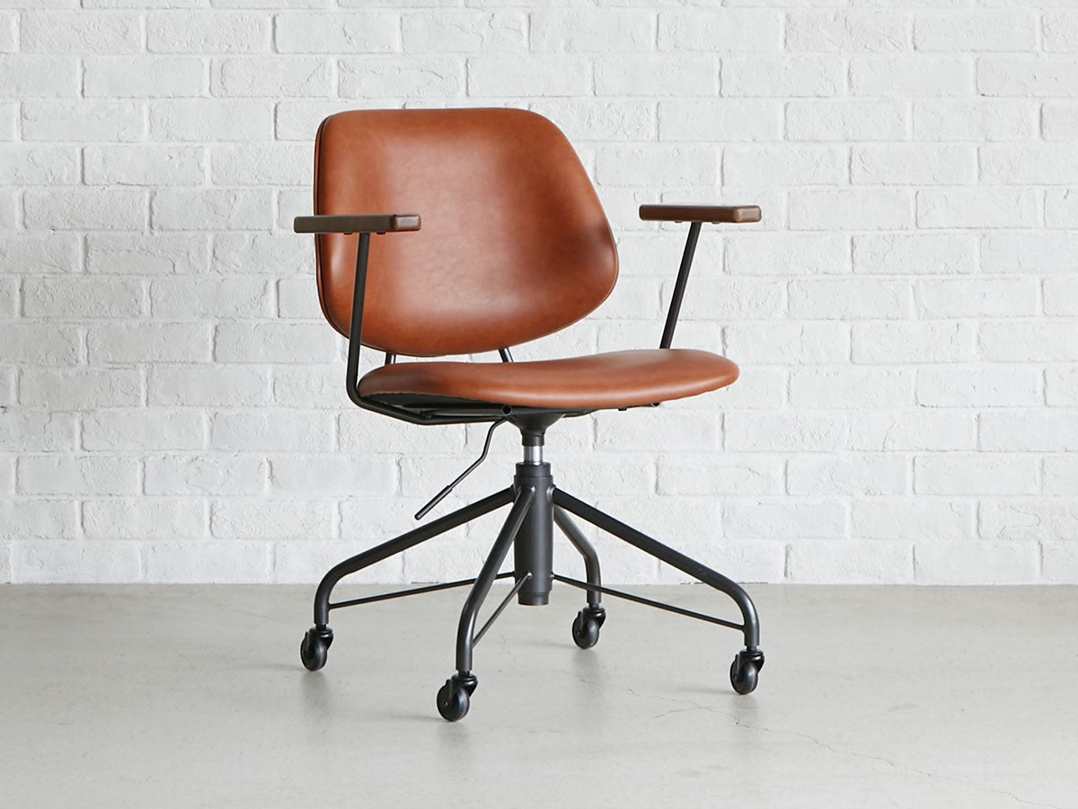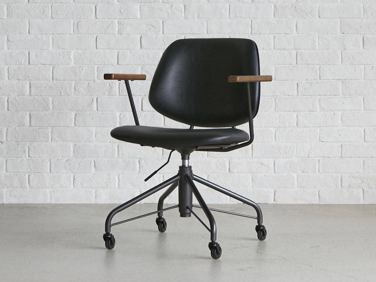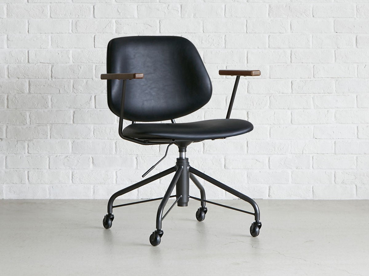 ミッドセンチュリーデザインをベースにしたワークチェア。当時をイメージしたレトロさとモダンな雰囲気を取り入れて、エッジの効いたスチール脚と木製の肘置き、背のパイピングなど細部のディテールもこだわっています。背と座のシートが優しく、しっかりとホールドする座り心地です。