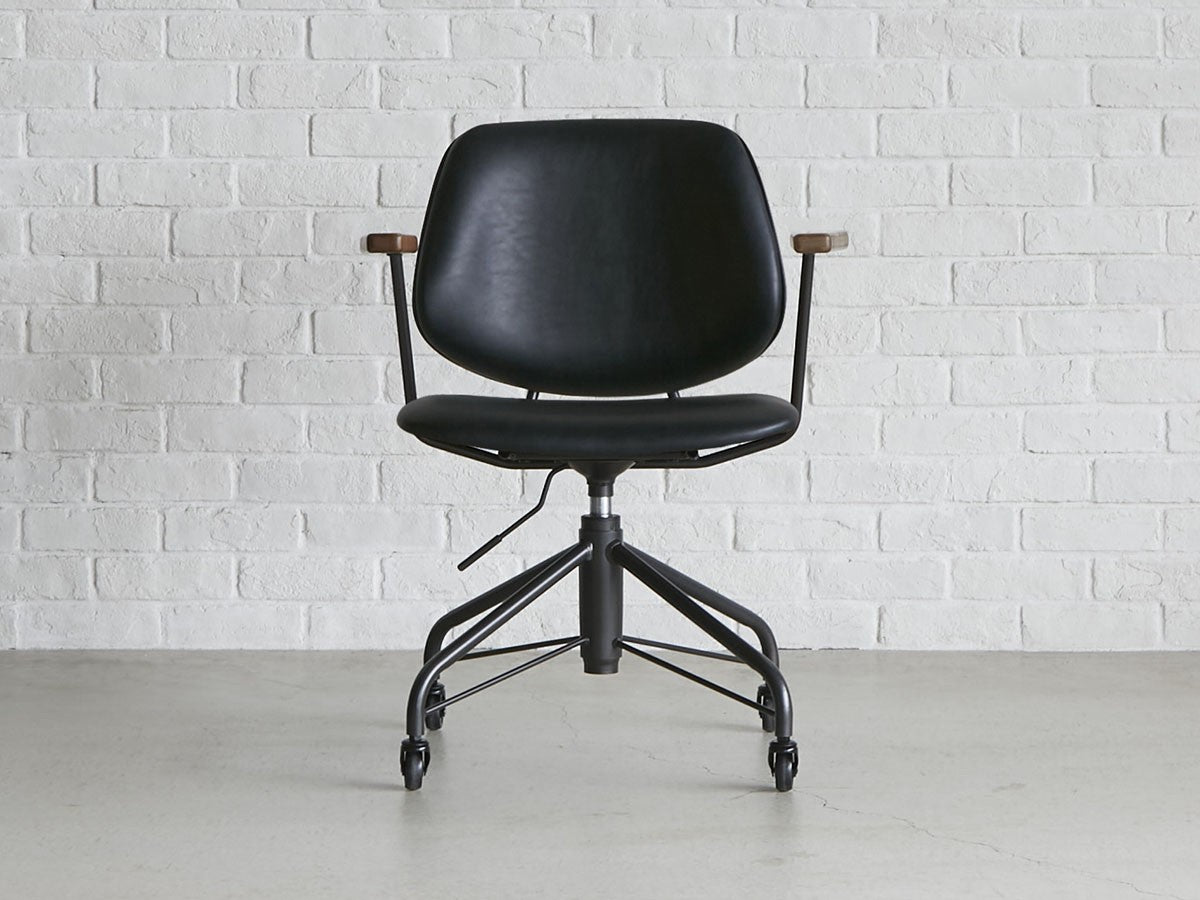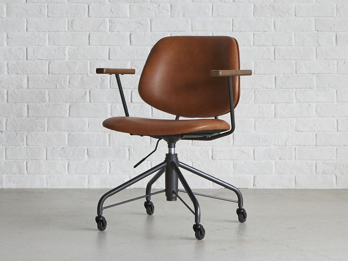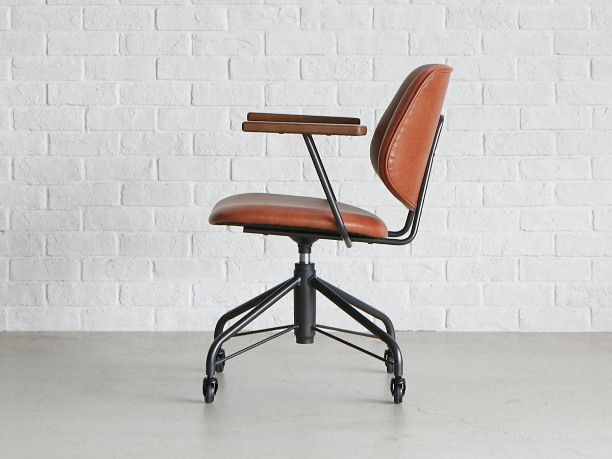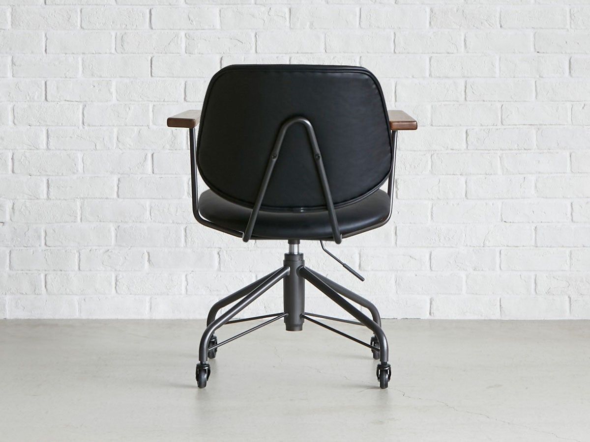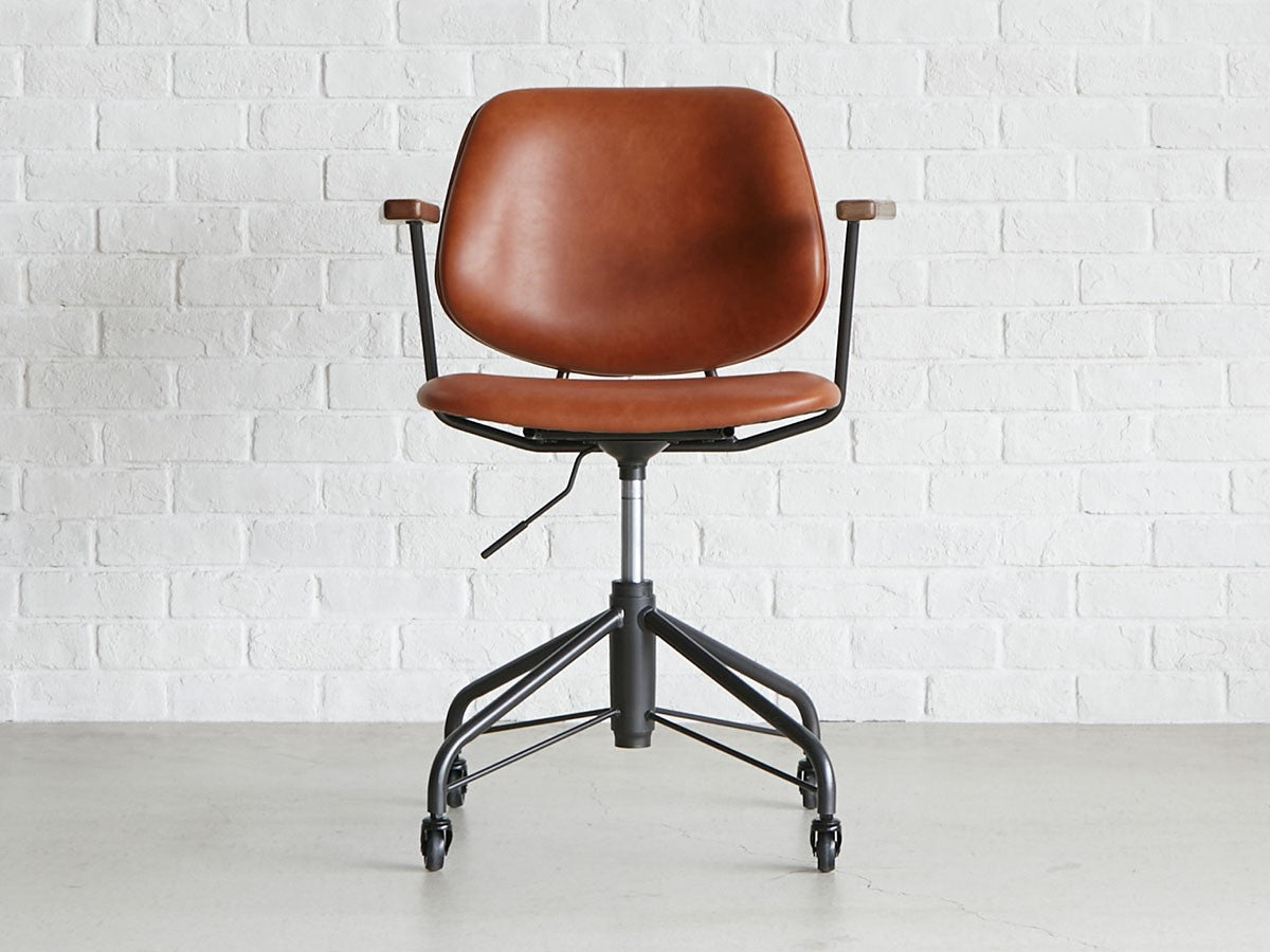 ミッドセンチュリーデザインをベースにしたワークチェア。当時をイメージしたレトロさとモダンな雰囲気を取り入れて、エッジの効いたスチール脚と木製の肘置き、背のパイピングなど細部のディテールもこだわっています。背と座のシートが優しく、しっかりとホールドする座り心地です。