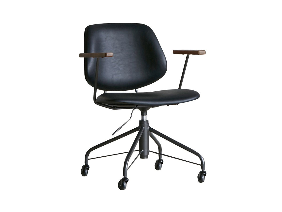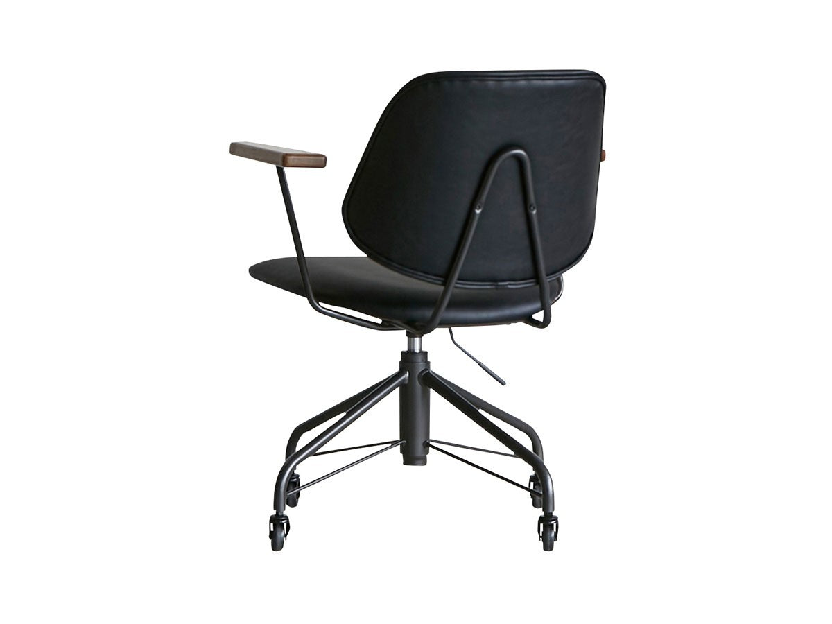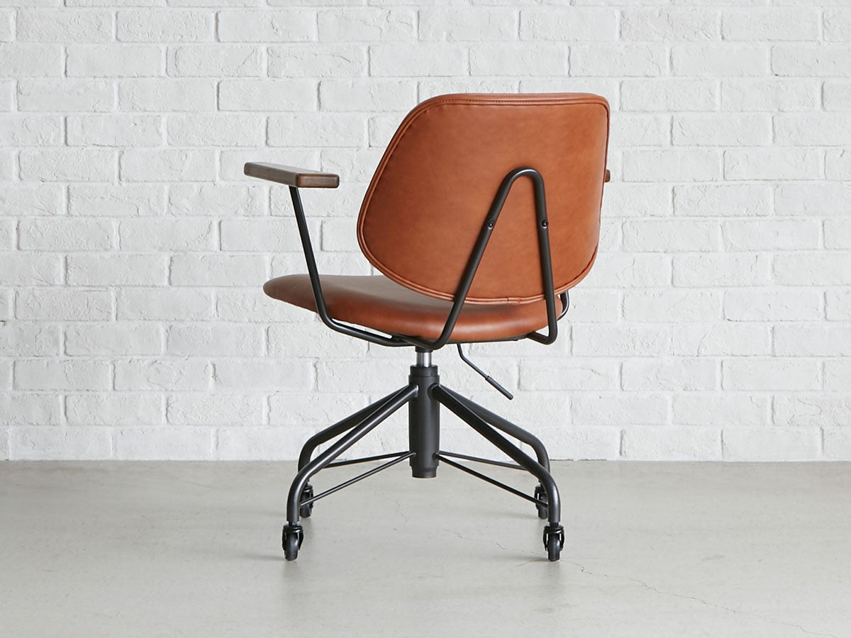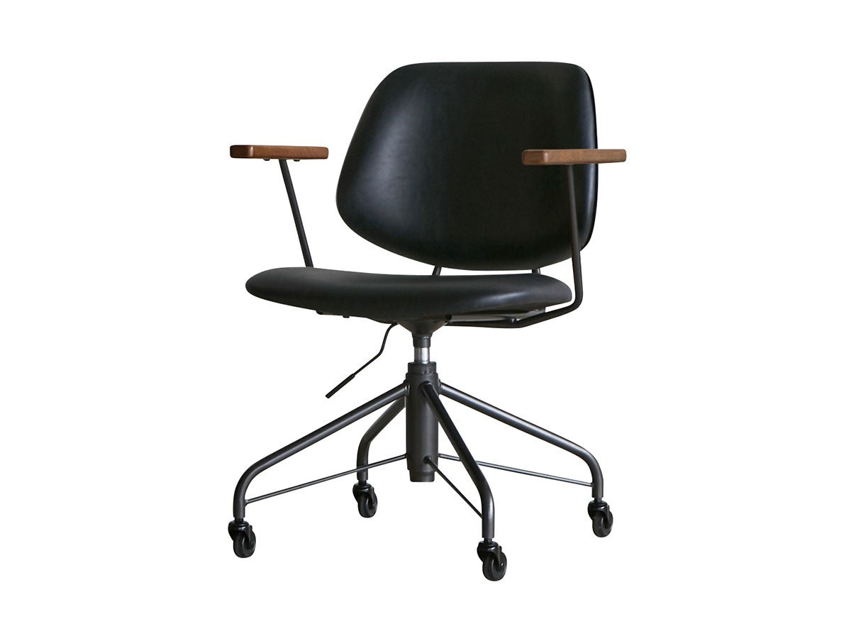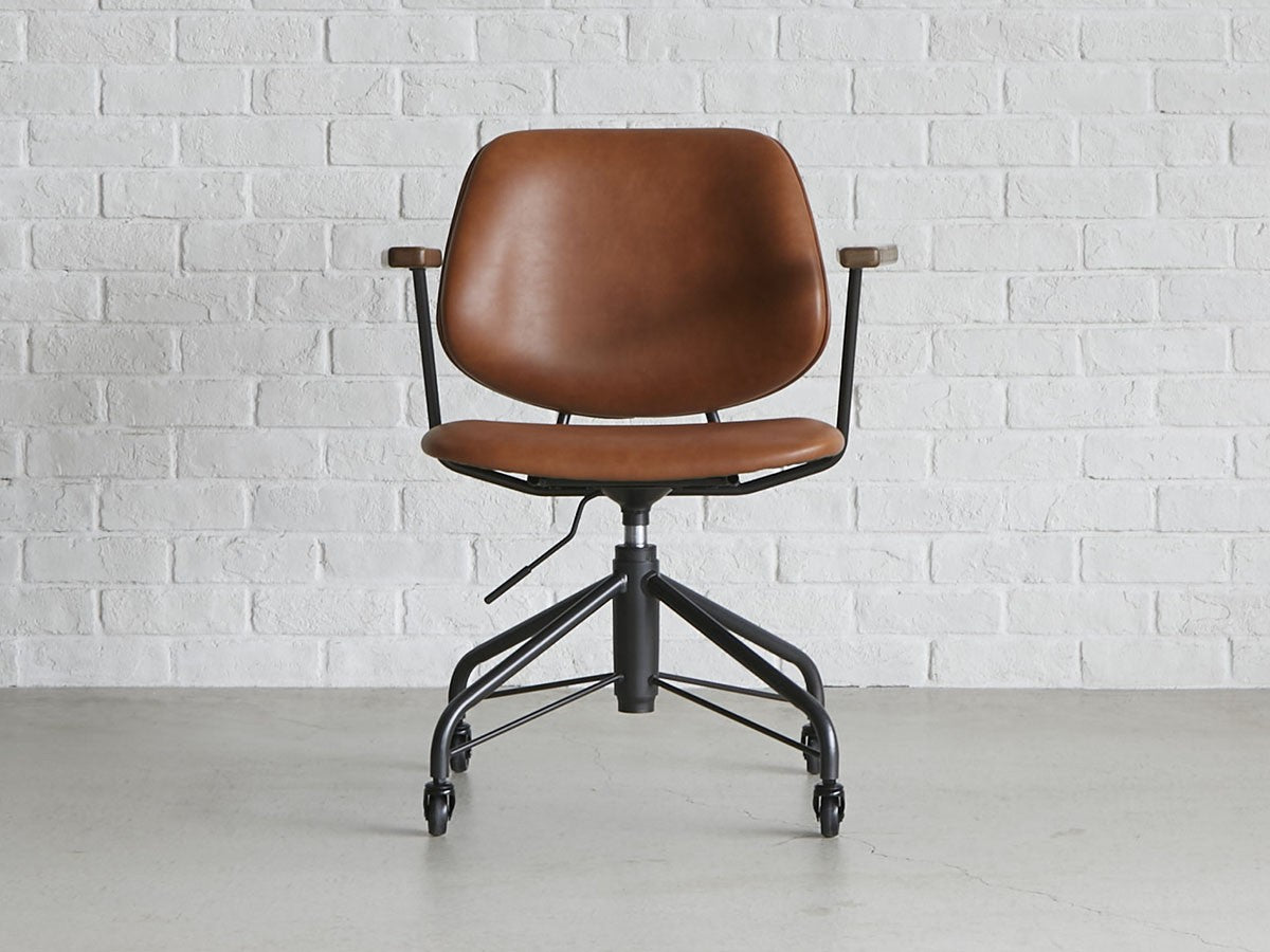 ミッドセンチュリーデザインをベースにしたワークチェア。当時をイメージしたレトロさとモダンな雰囲気を取り入れて、エッジの効いたスチール脚と木製の肘置き、背のパイピングなど細部のディテールもこだわっています。背と座のシートが優しく、しっかりとホールドする座り心地です。