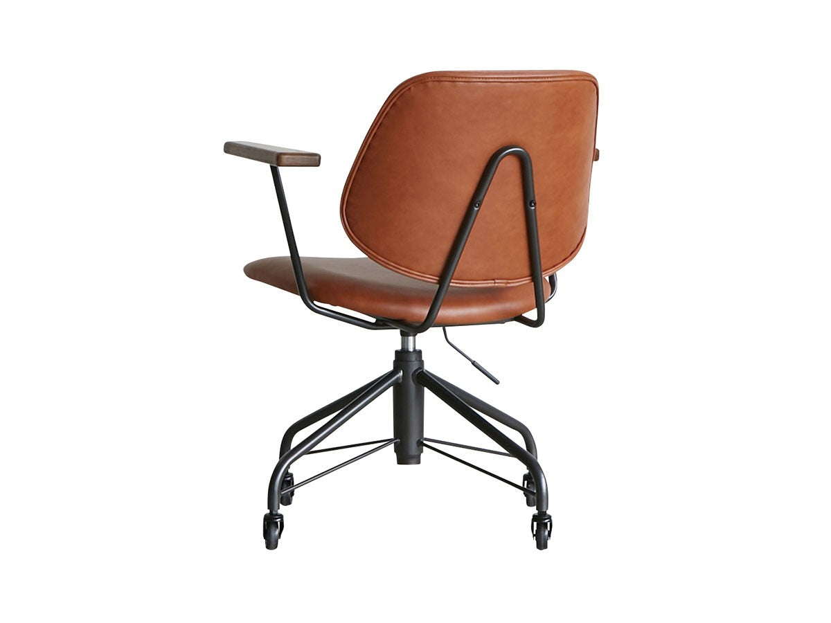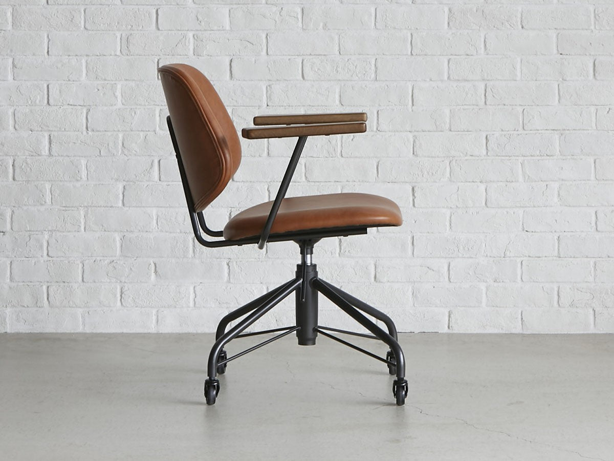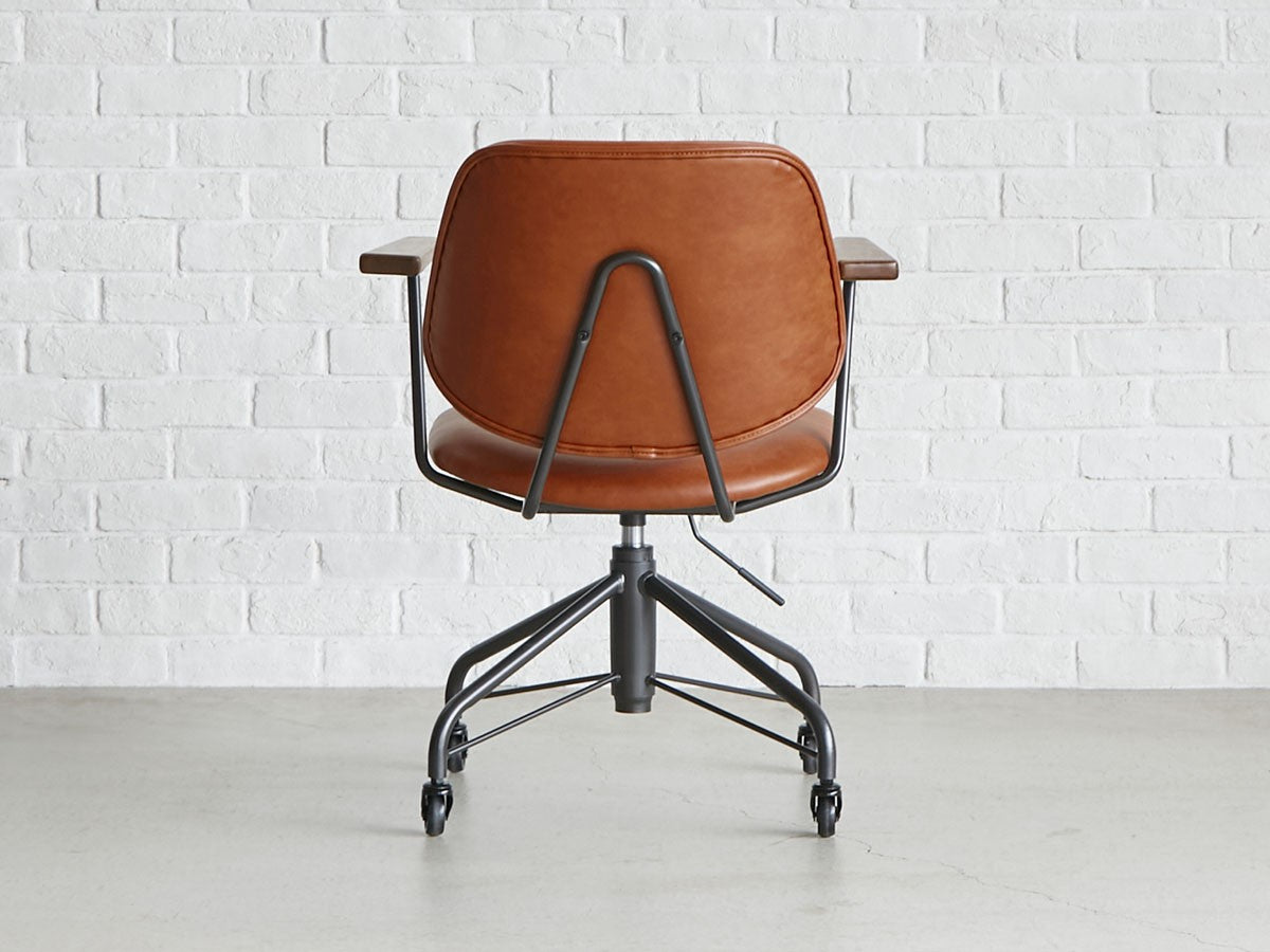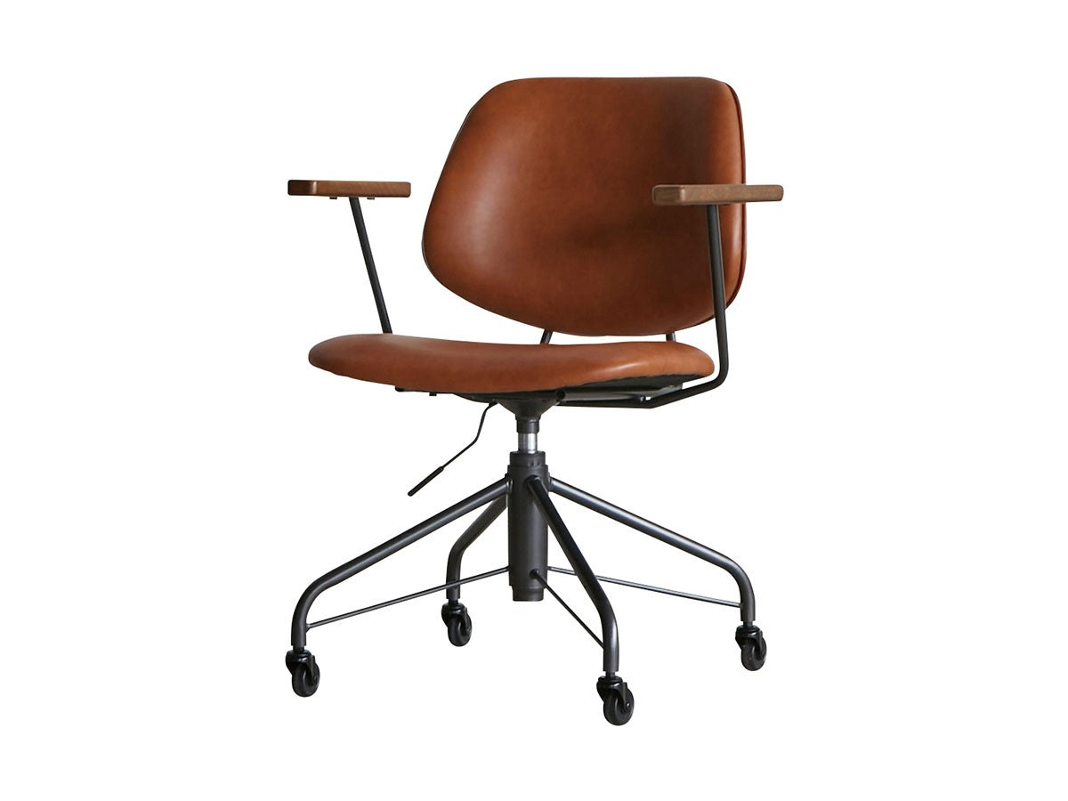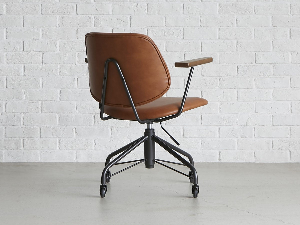 ミッドセンチュリーデザインをベースにしたワークチェア。当時をイメージしたレトロさとモダンな雰囲気を取り入れて、エッジの効いたスチール脚と木製の肘置き、背のパイピングなど細部のディテールもこだわっています。背と座のシートが優しく、しっかりとホールドする座り心地です。