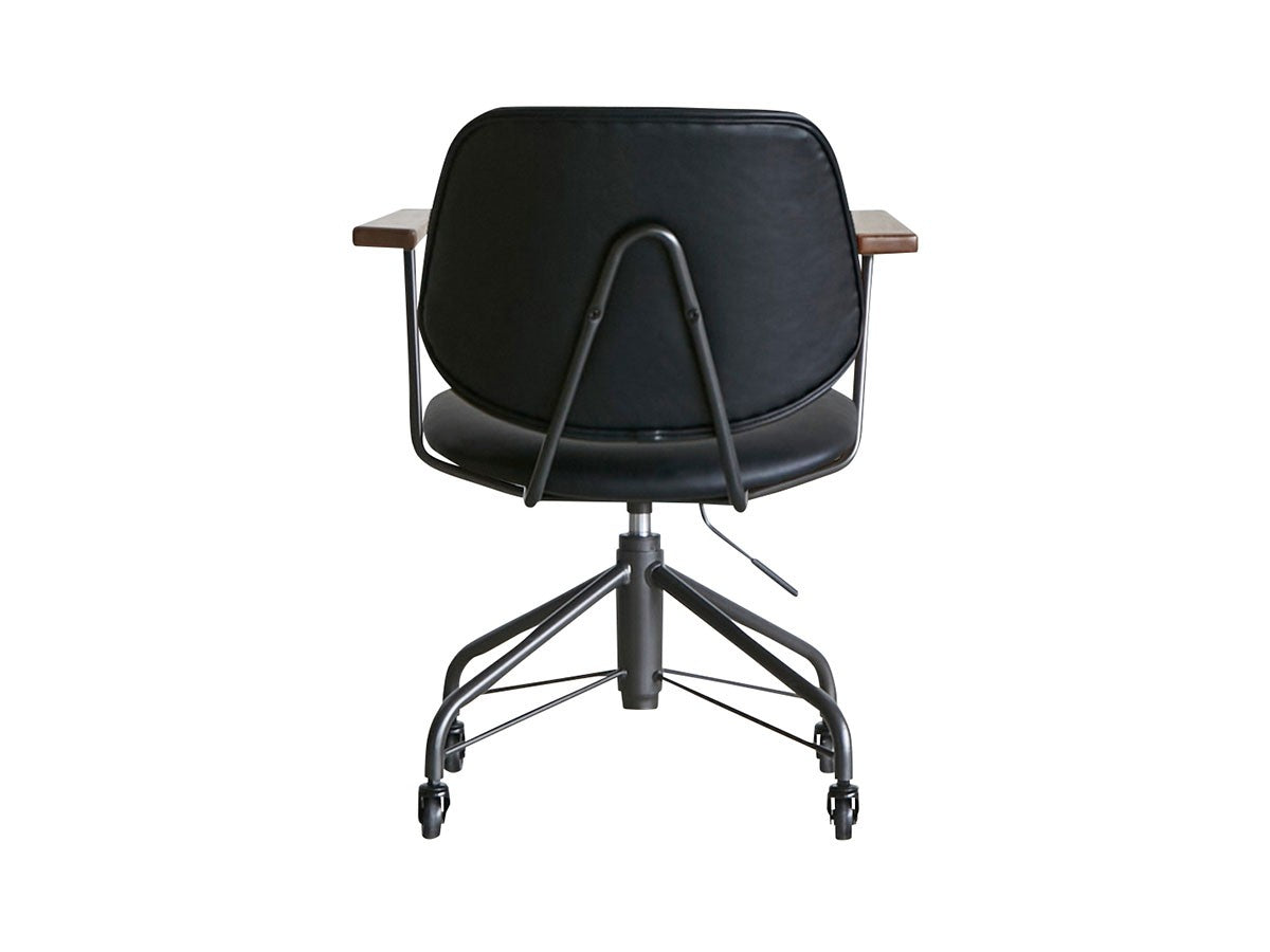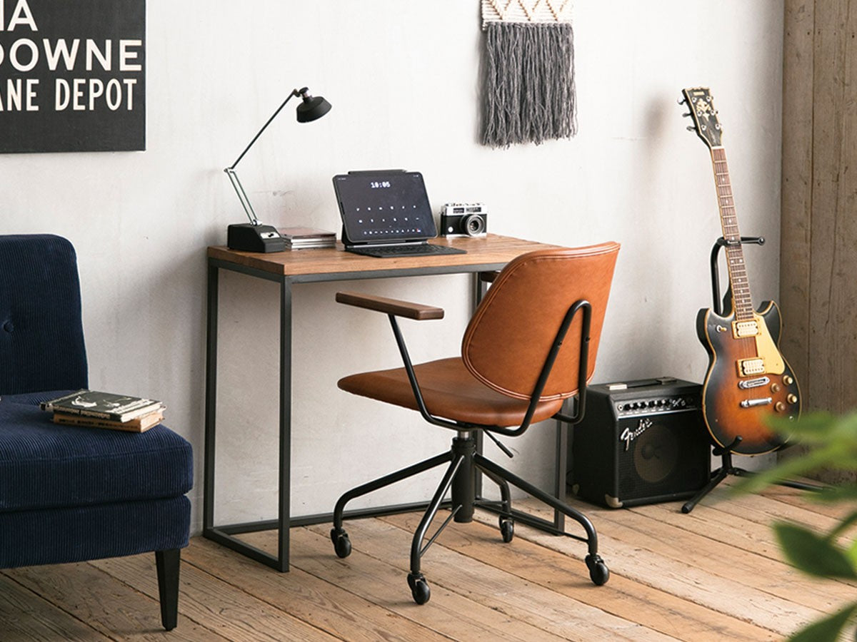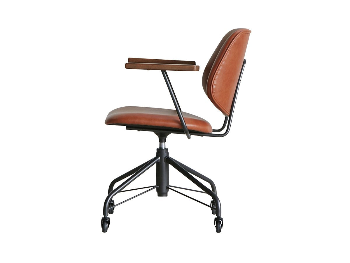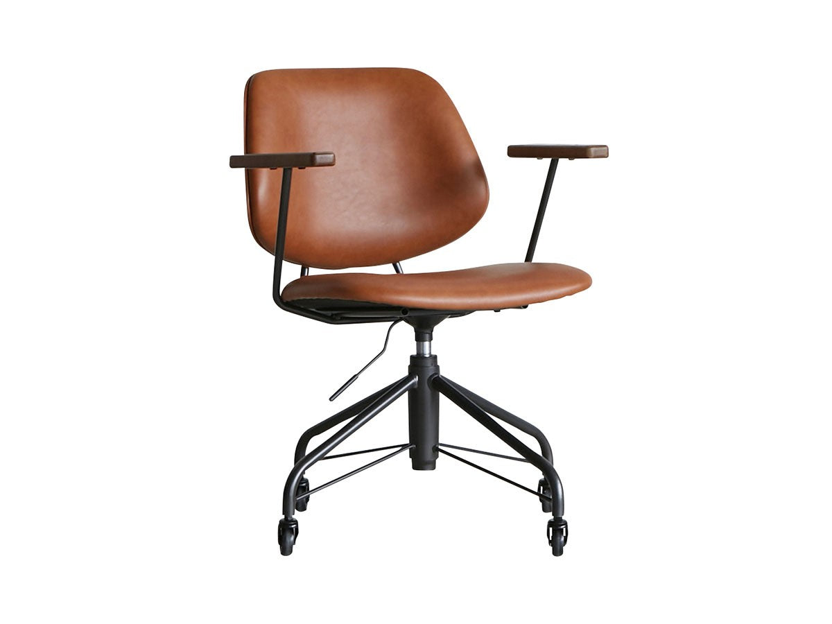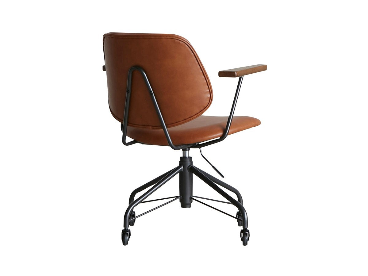 ミッドセンチュリーデザインをベースにしたワークチェア。当時をイメージしたレトロさとモダンな雰囲気を取り入れて、エッジの効いたスチール脚と木製の肘置き、背のパイピングなど細部のディテールもこだわっています。背と座のシートが優しく、しっかりとホールドする座り心地です。