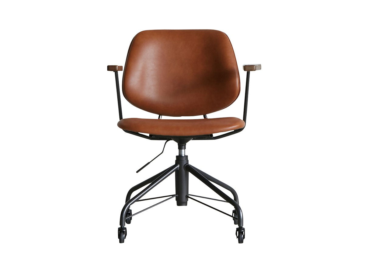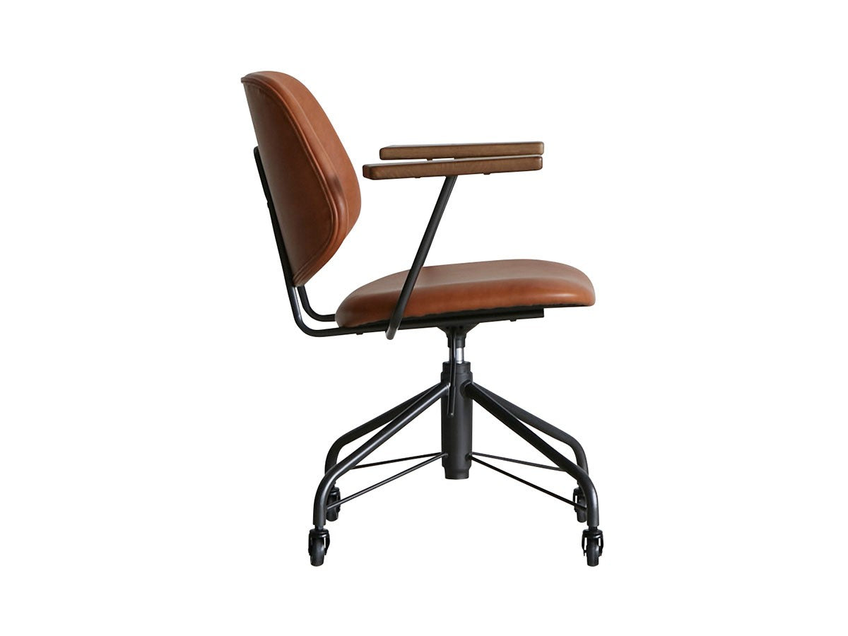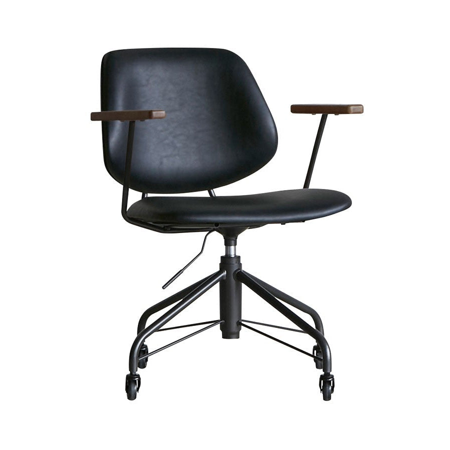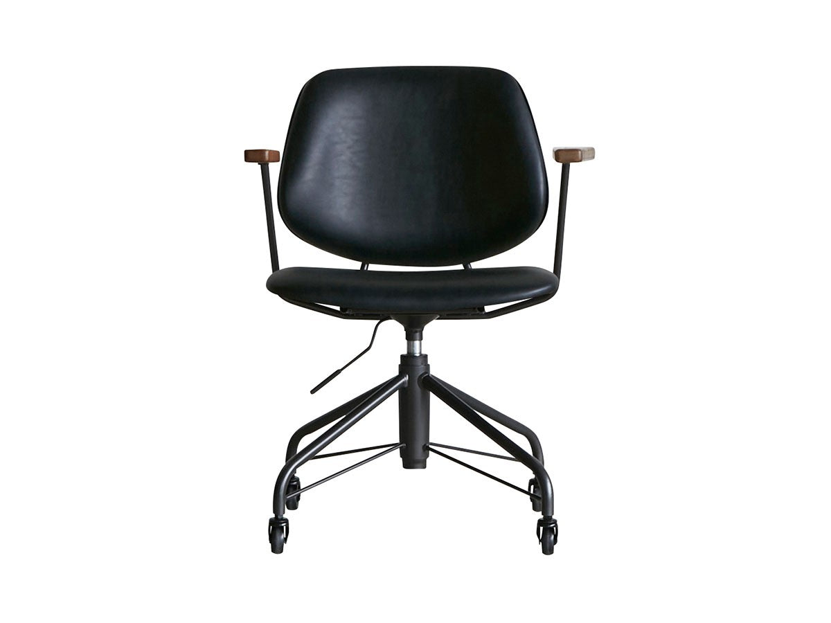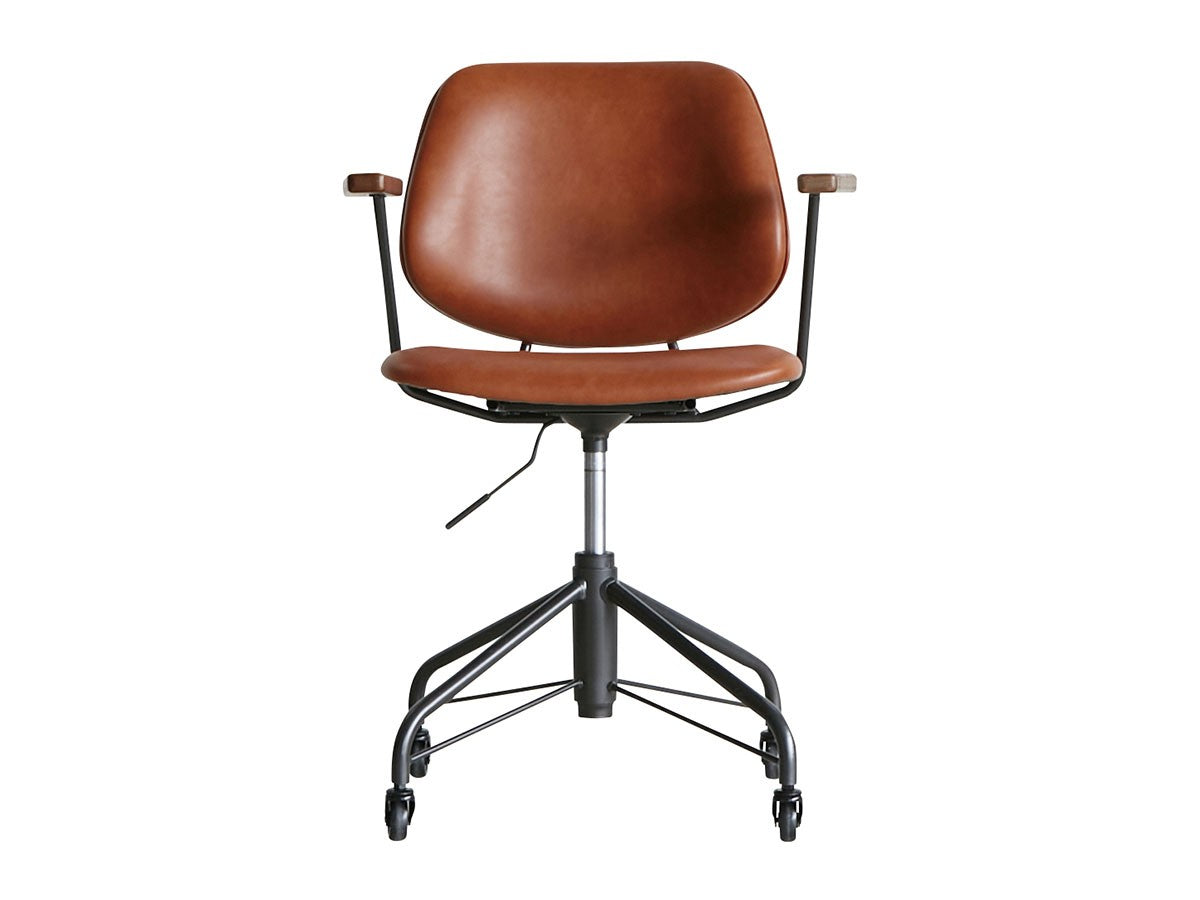 ミッドセンチュリーデザインをベースにしたワークチェア。当時をイメージしたレトロさとモダンな雰囲気を取り入れて、エッジの効いたスチール脚と木製の肘置き、背のパイピングなど細部のディテールもこだわっています。背と座のシートが優しく、しっかりとホールドする座り心地です。