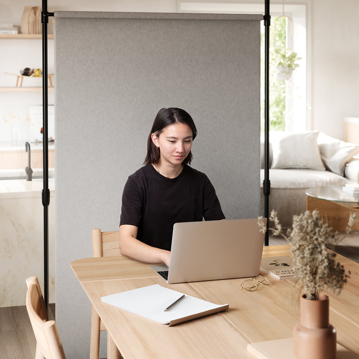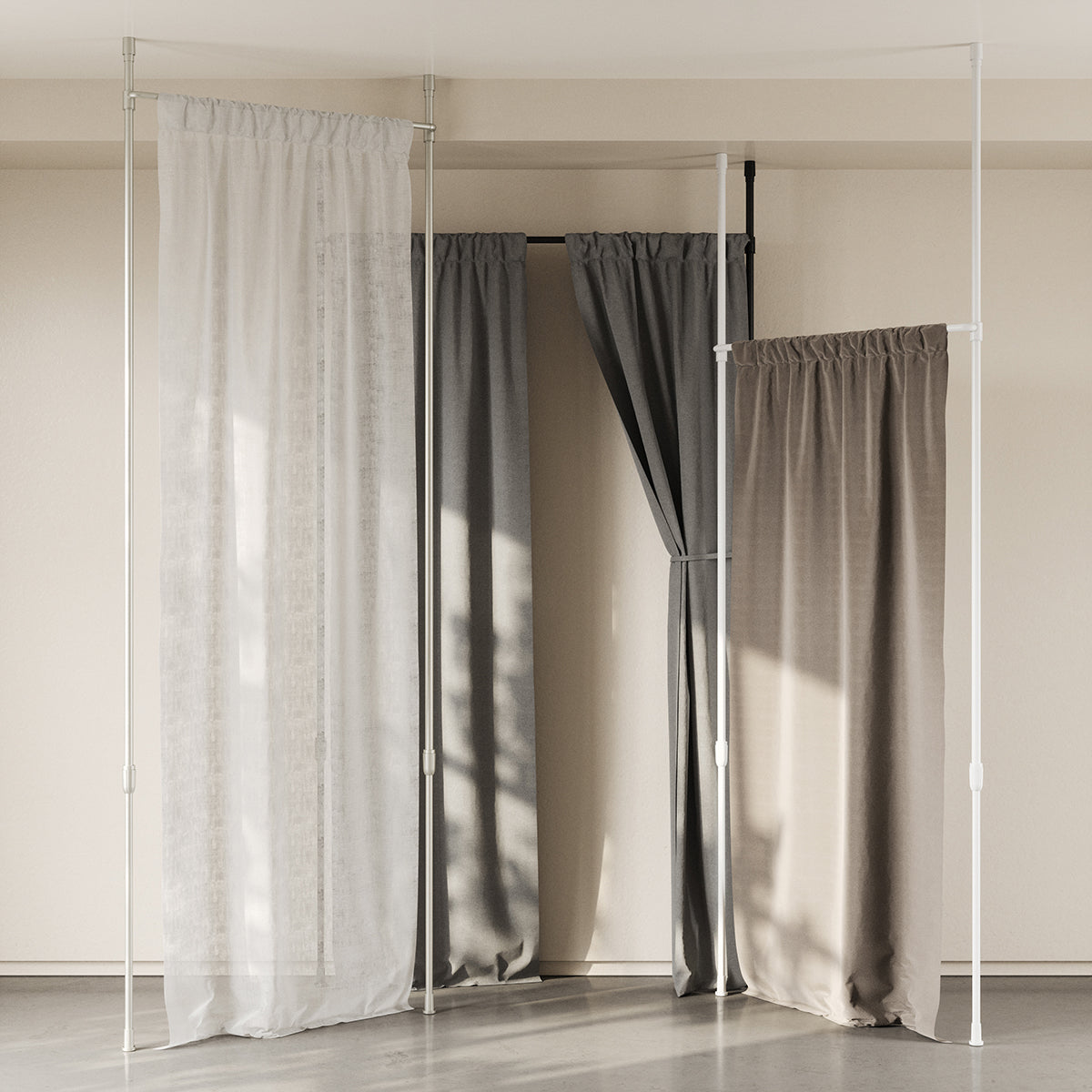 エニウエアロッドは、カーテンをとても簡単にかける事ができます。ユニークなテンション カーテン ロッド システムは、これまで取り付けが難しいとされていた場所でも設置できるように設計されています。穴あけができない賃貸住宅、プライバシーを確保したいスタジオ、または部屋を区切る必要がある寮の部屋などです。カーテンを壁にぴったりと密着させるラップアラウンドデザインを採用しており、遮光性も考えられています。高さは215cm ~ 317cmまで伸ばすことができ、幅は97cm ~ 179cmまで調整できるため、あらゆるスペースに合わせてカスタマイズできます。設置は穴など空ける必要もなく、工具も不要です。組み立てにかかる時間は、20 分以内です。高さと幅を調整して、所定の位置にロックするだけです。スペースを区切ったり、プライバシーをさらに高める部屋の間仕切りとしても最適です。リビング ルームの間仕切りや部屋の仕切りの間仕切りとしてもお使いいただけます。ロフト、アパート、オフィス、寮の部屋など。最大耐荷重6.8kgで直径25 mmのロッドです。また、こちらの商品は環境に優しい仕上げで作られており、従来の生産方法より水と固形廃棄物の発生量が 85% 少なくなっています。人通りの少ない場所で、固い床やタイルなどの滑らかで水平な表面での使用に適しています。