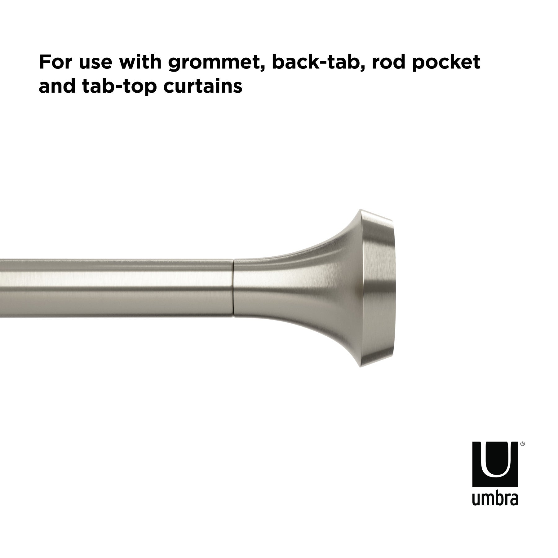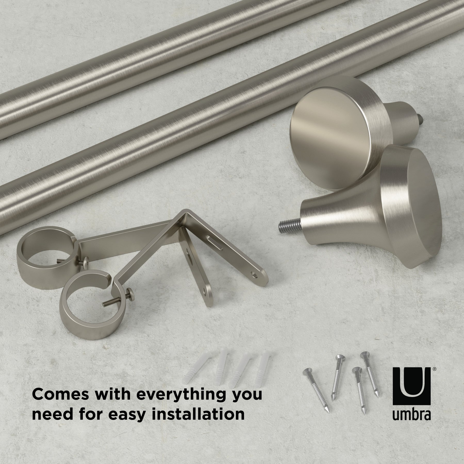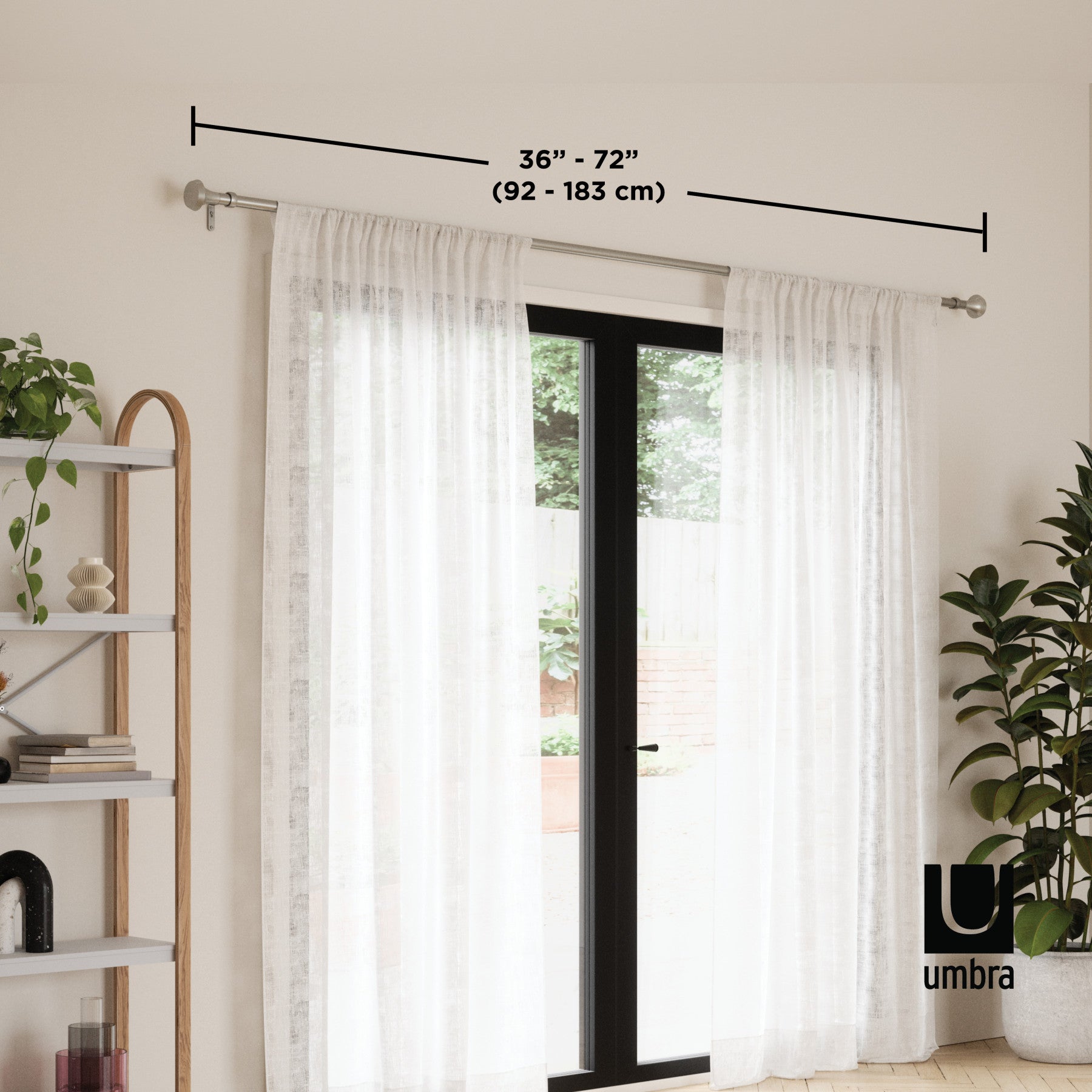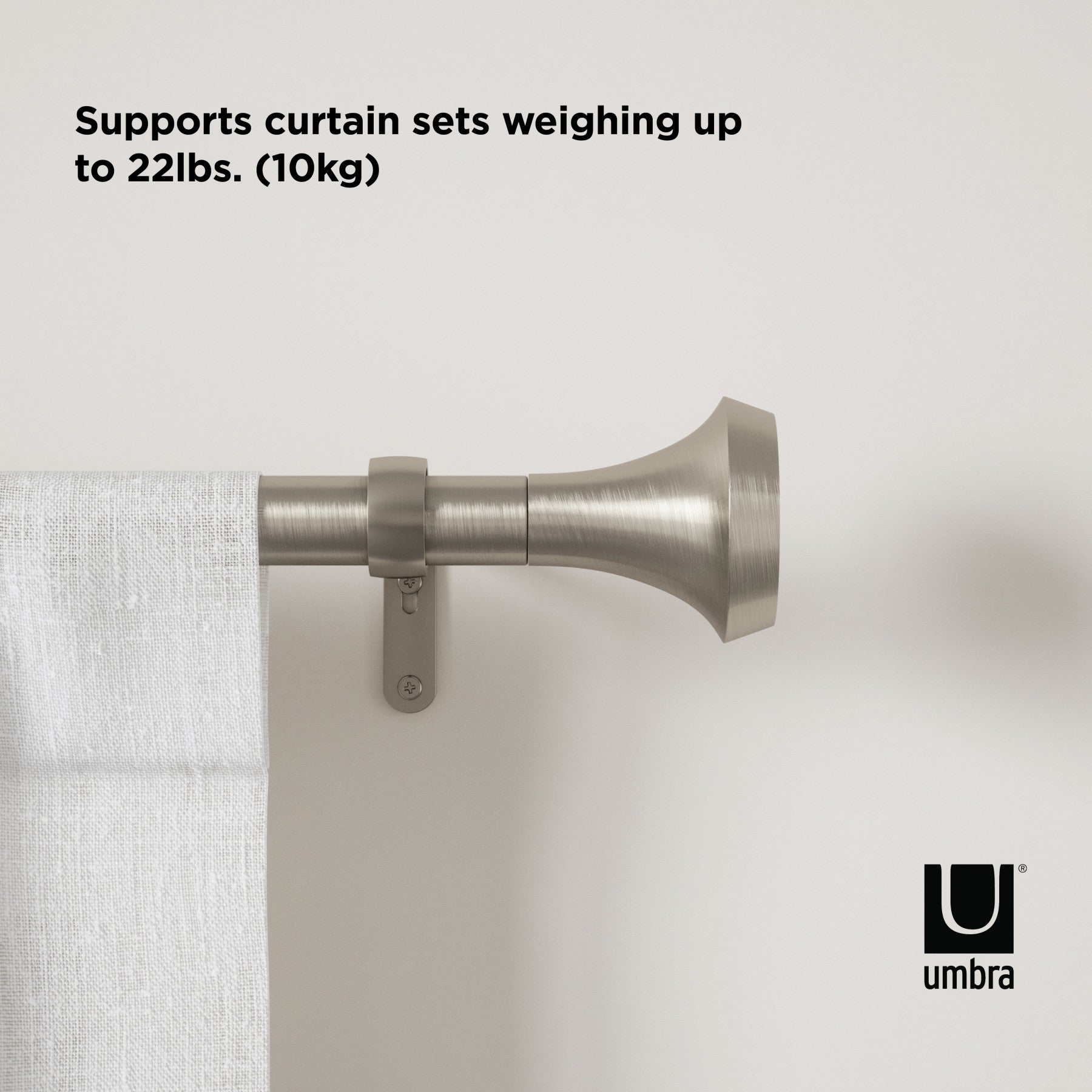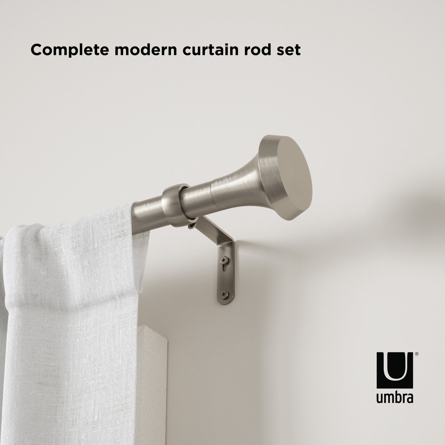 端のパーツがトランペット形で球体のカーテンロッド。長さが調節できる伸縮式。壁面に取り付けブラケットと設置し、ブラケットにロッドをセットして使います。