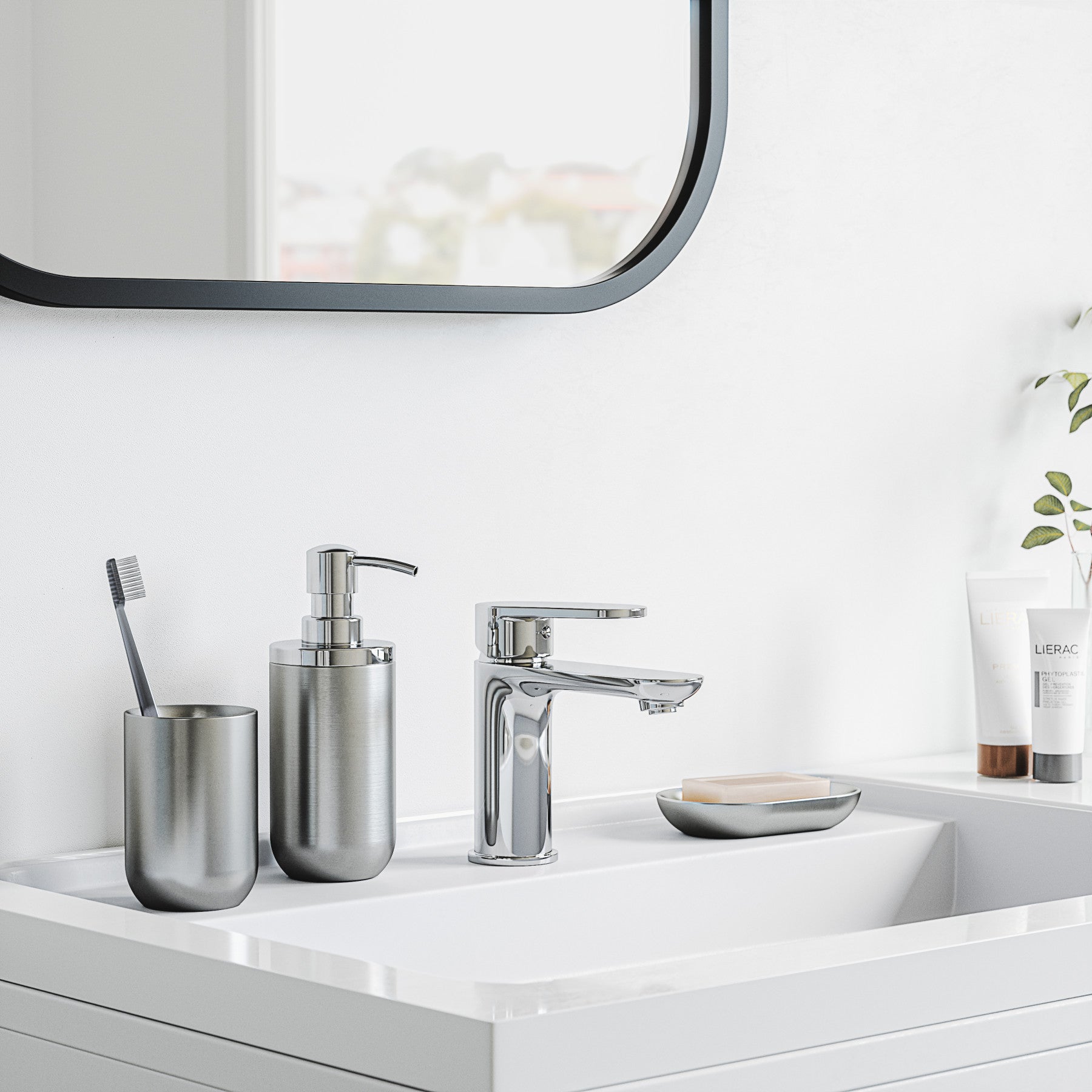 Genslerデザインです。マット仕上げの白い樹脂性のソープポンプ。滑らかな小石のような感じの白いマットな仕上がりで、浴室や家全体に馴染みます。世界有数のデザイン会社であるGenslerと手を組み製作した、高級ホテルに合うバスコレクションです。ジュニップコレクションはラインと仕上げを共通する一方で、多様なスタイルでもあり、厳密には全く一致するのではなく、絶妙に調整され、洗練されたフォルムになっています。また、モダンなデザインで、樹脂素材ですが、コレクション全体は丸みを帯びているので、やわらかい印象で、魅力的なのも特徴です。