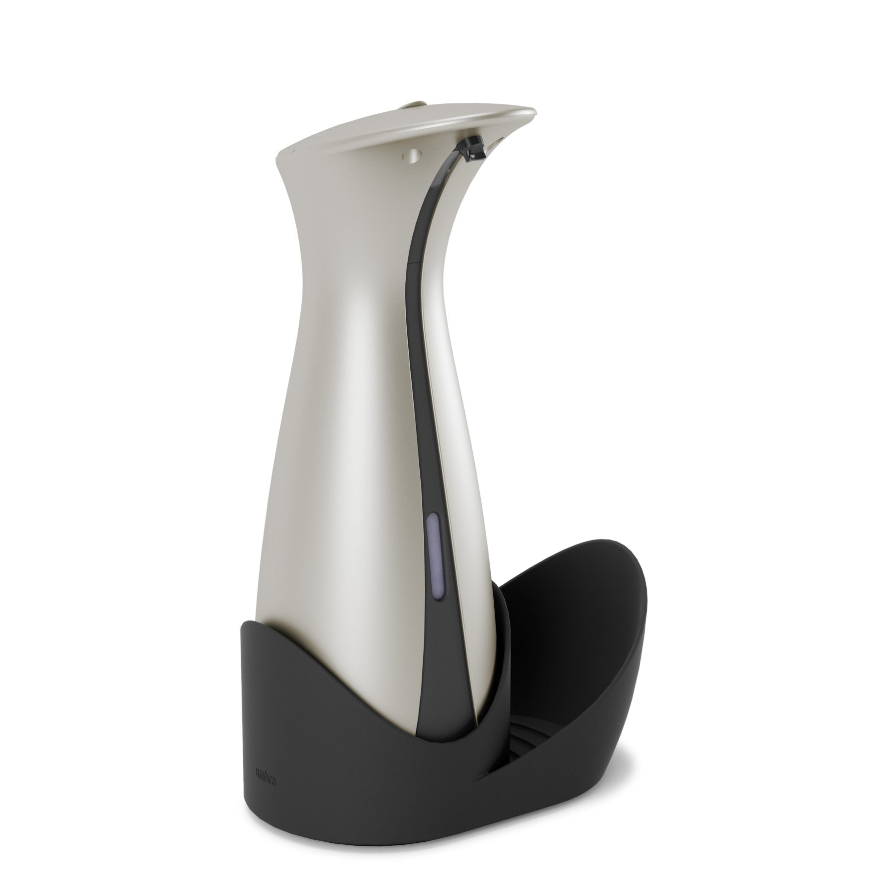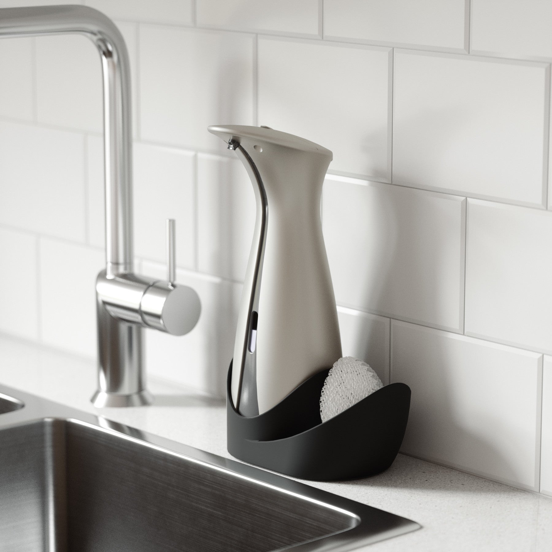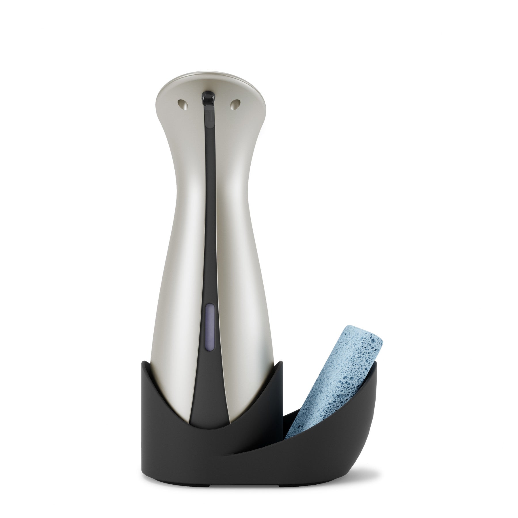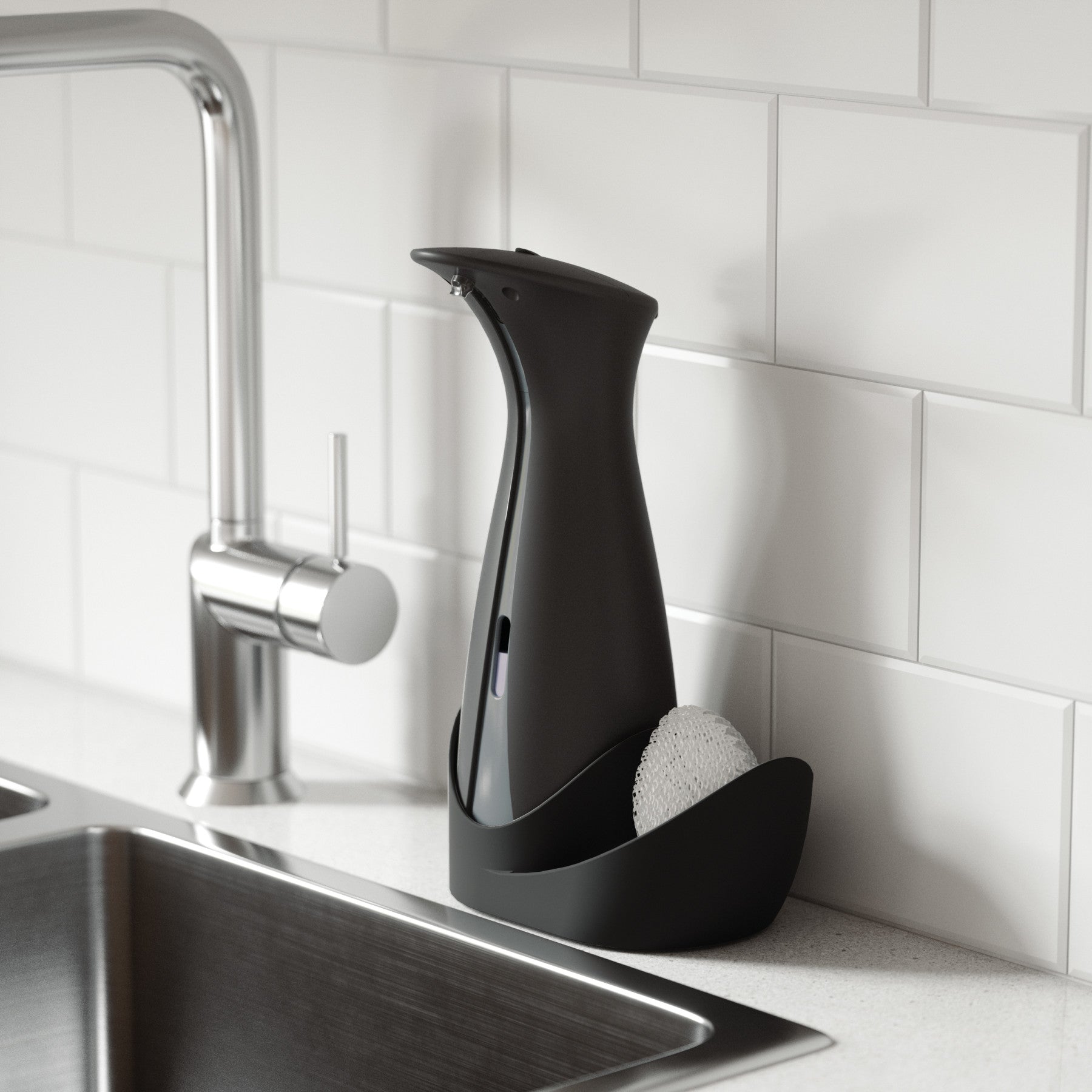 ハンドソープ、食器用洗剤、除菌ジェルに使用できる人気のオートディスペンサーとスポンジを収納できるキャディが付属されたセットです。洗練されたフォルム、高級感のあるマット仕上げ、クロムラインのアクセントが、キッチンやバスルームのデコレーションを引き立てます。食品を調理している時でも、オートセンサーでポンプに直接触れる事なく、ハンドソープや食器用洗剤が一定量でますので衛生的です。オットLは既存のオット(177ml)より大きな容量(250ml)になっており、モーターも改善され、洗剤の出る時間が短く、センサーの反応が早くなりました。電池残量が少なくなるとセンサーが赤くなり、お知らせしてくれます。液の残量も正面についた窓から容易に確認ができ、補充口が広く設計されているので液剤を簡単に補充することができます。