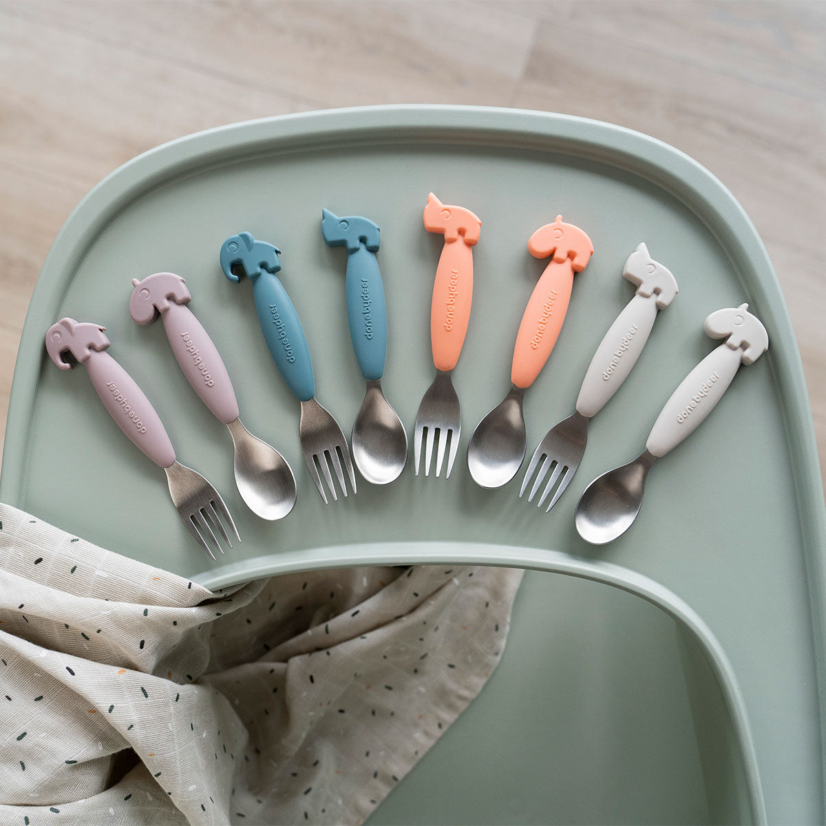 使い勝手の良さで人気のカトラリーシリーズ。4色展開で、シーンに合わせてお選びいただけます。ふっくら丸みを帯びた持ち手はシリコン製で滑りにくく、離乳食を始めたベビーが握りやすい形状。ちょこんと乗ったキャラクターがとってもキュート。