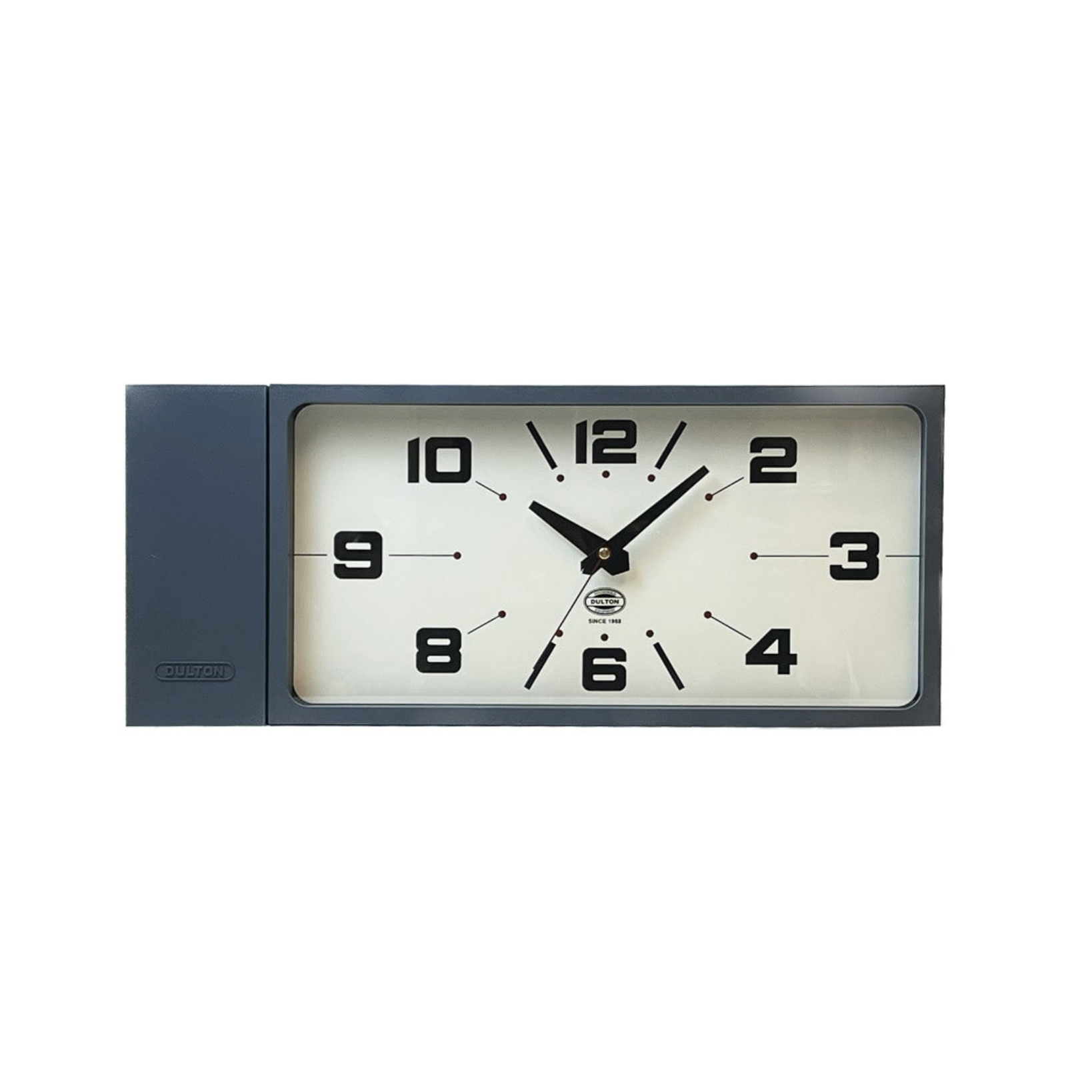 駅構内などの公共施設で使用されている両面時計を家庭用にアレンジしたDULTON/ダルトンの「DOUBLE FACE WALL CLOCK / ダブルフェイスクロック」です。天井の低い住空間でも取り入れやすいレクタングルタイプになります。エンボス加工で施されたロゴや角の仕上げなど、随所に散りばめられた樹脂ならではのディテールとこだわり文字盤のデザインが絶妙なバランスで存在感を演出。リビングや書斎のインテリアとして、お店の顔として、様々なテイストに馴染むウォールクロックです。