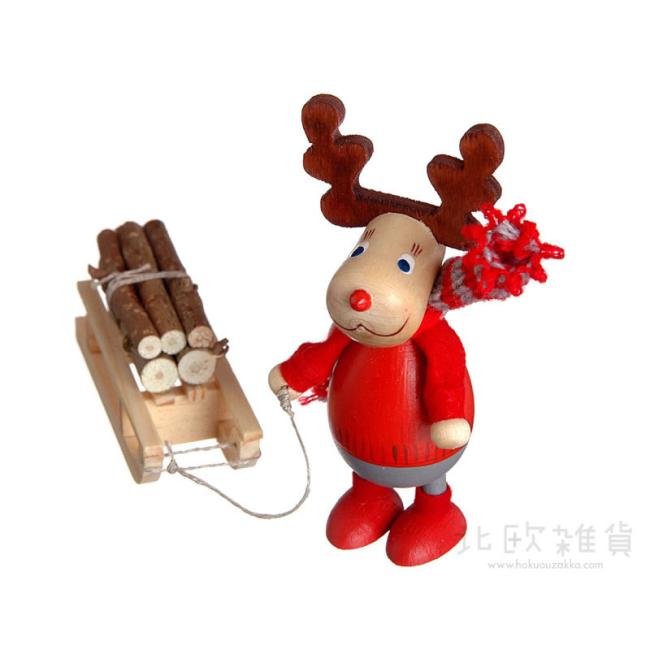 クリスマス 木製人形 丸太をひいた胴長トナカイ