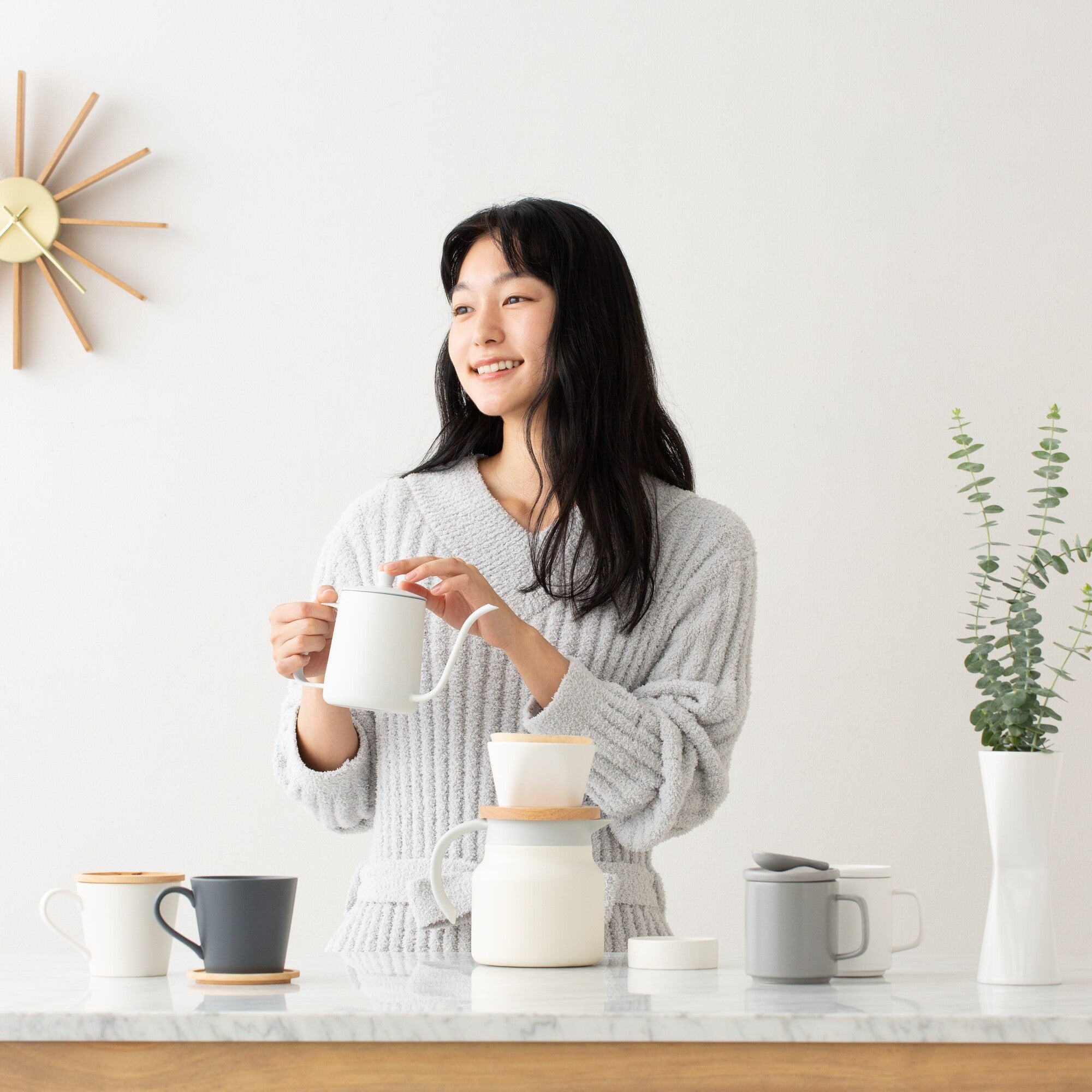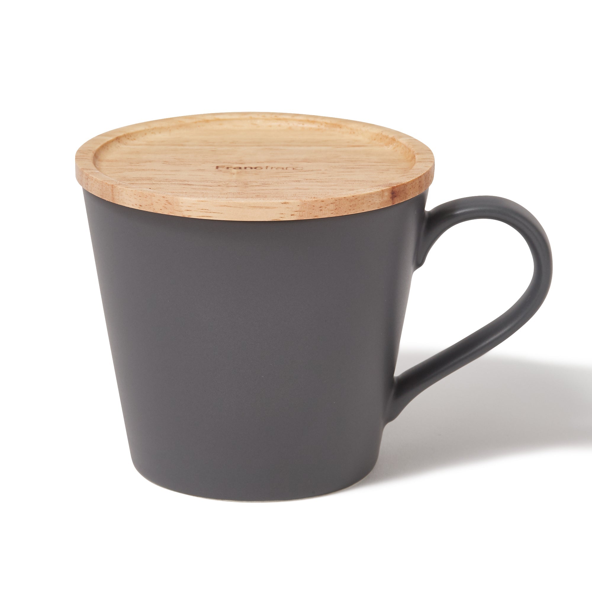 木のフタがついた、マットな質感の釉薬で仕上げたマグです。木のフタはコースターとしてもお使いいただけます。普段使いやすいシンプルなデザインで、かわいい箱に入っていますのでギフトにもおすすめです。お求めになりやすい価格も魅力です。