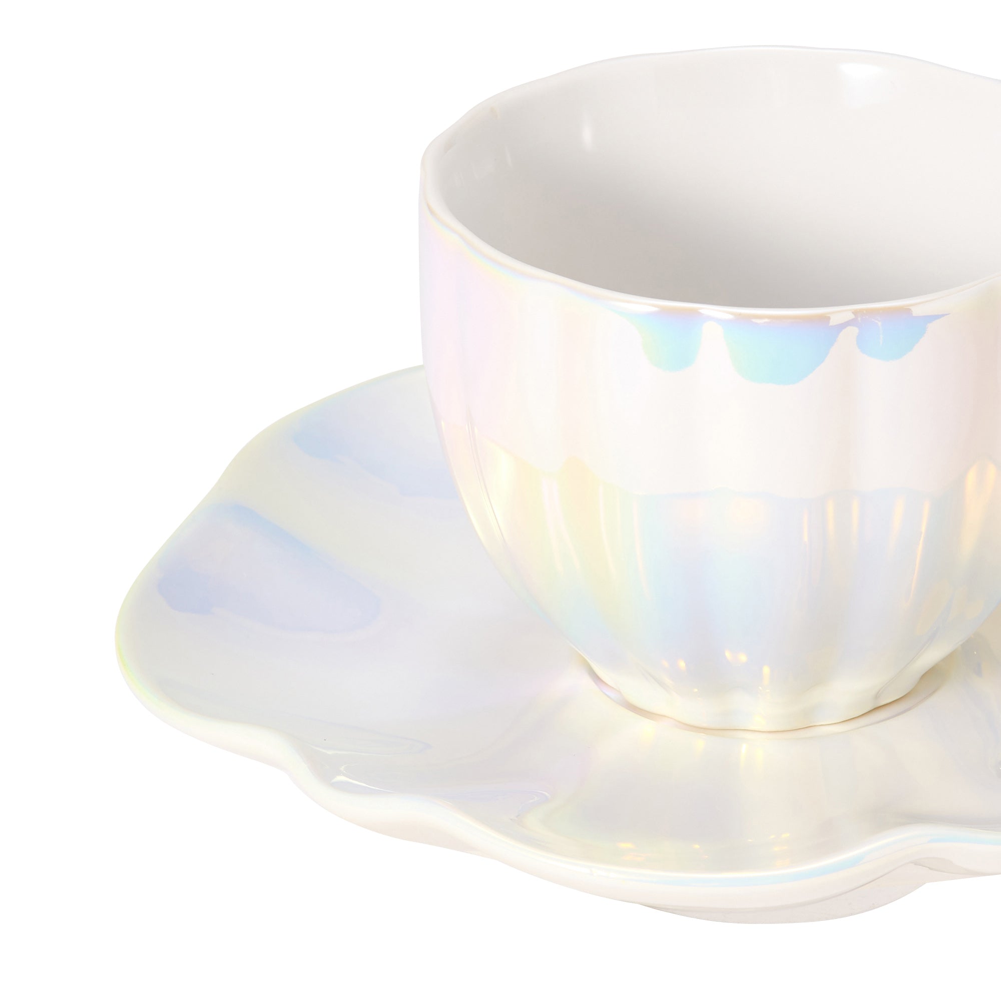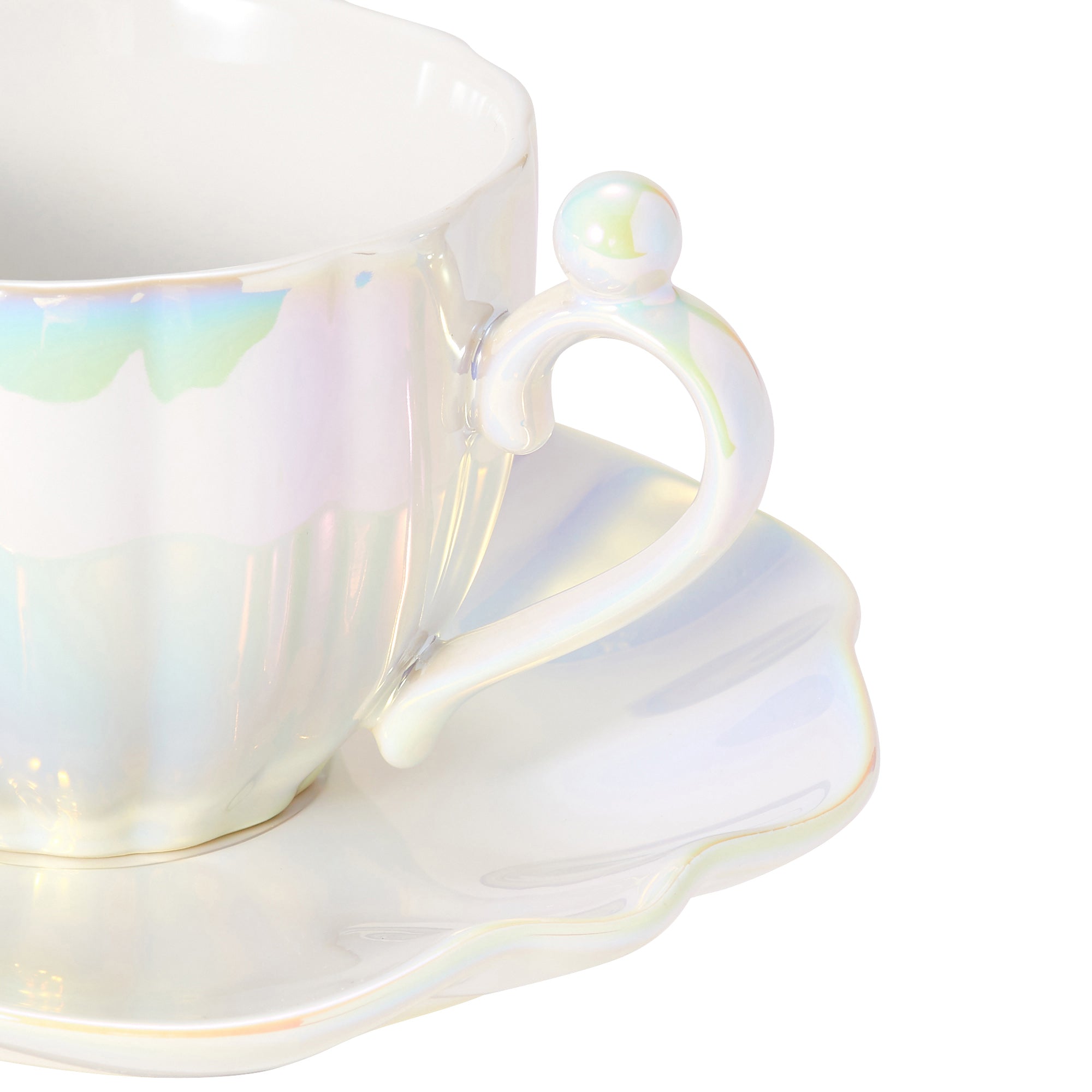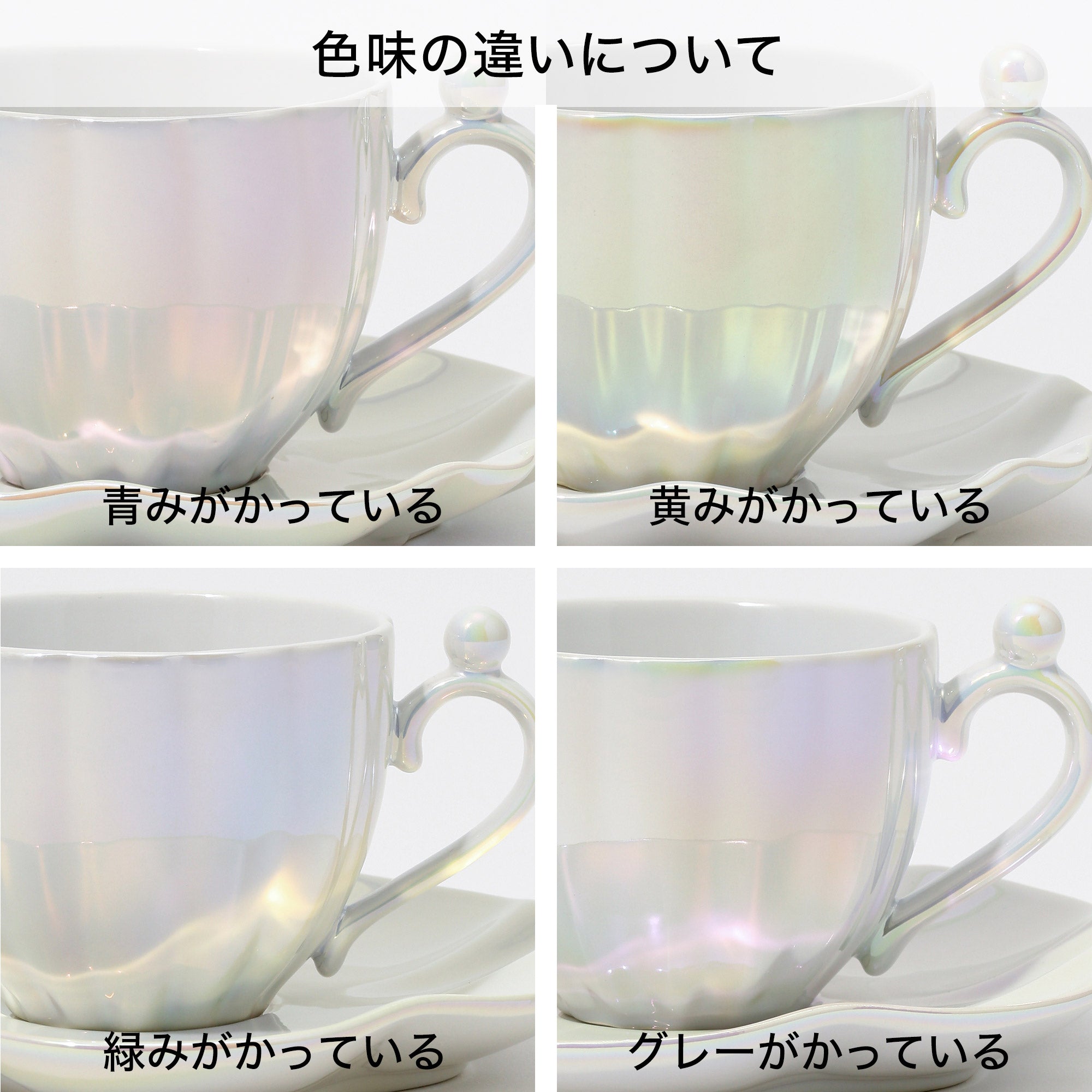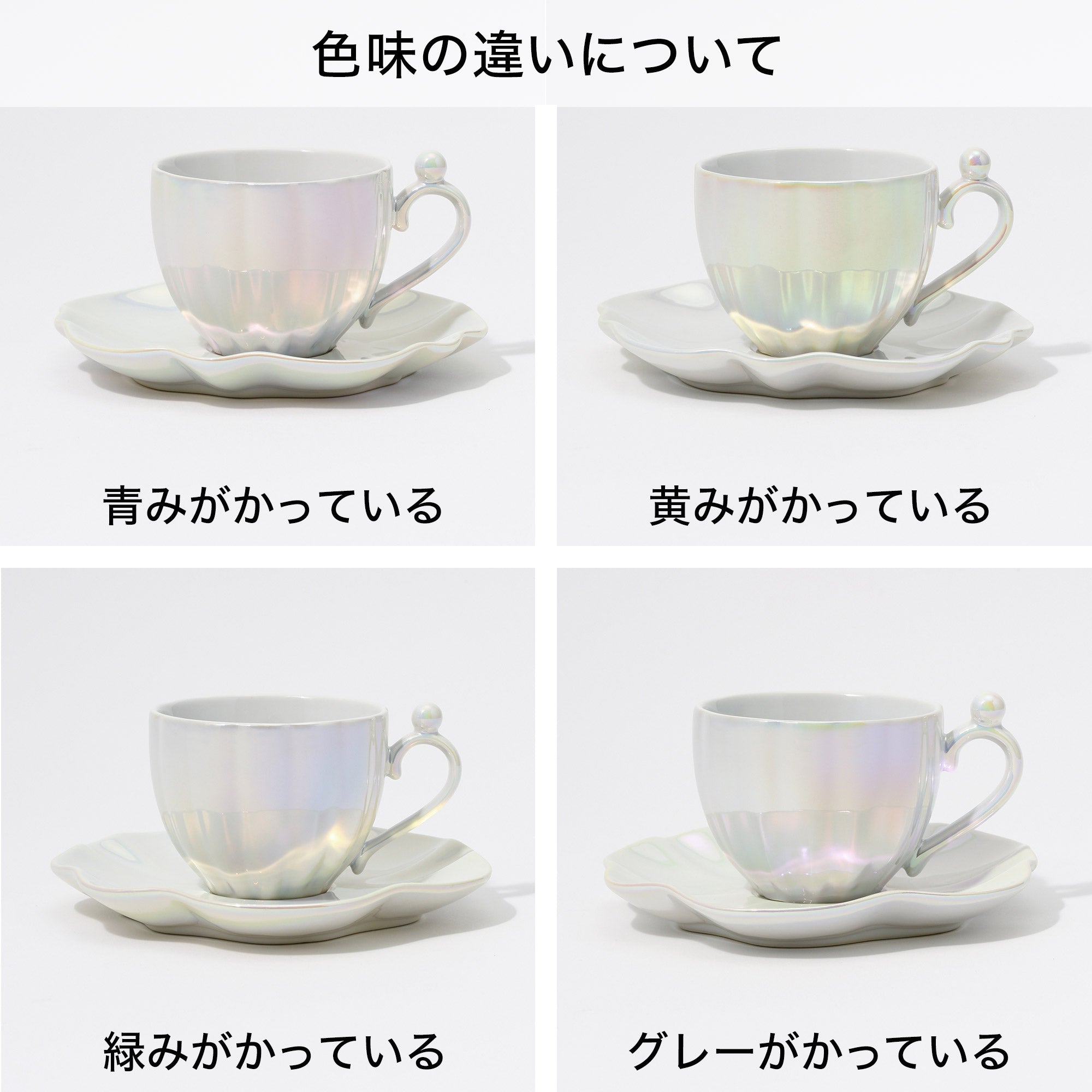 シェルモチーフ×オパール加工でかわいいがぎゅっと詰まったカップ&ソーサーです。ハンドルにあしらわれたパールモチーフがキュートなアクセントに。波をイメージさせるソーサーのカーブは七色に光って目を惹きます。おもてなしの気持ちが伝わるこだわりのカップ&ソーサーは、ホームパーティーでも大活躍。おうち時間を鮮やかに彩るアイテムで、素敵なひと時をお過ごしください。