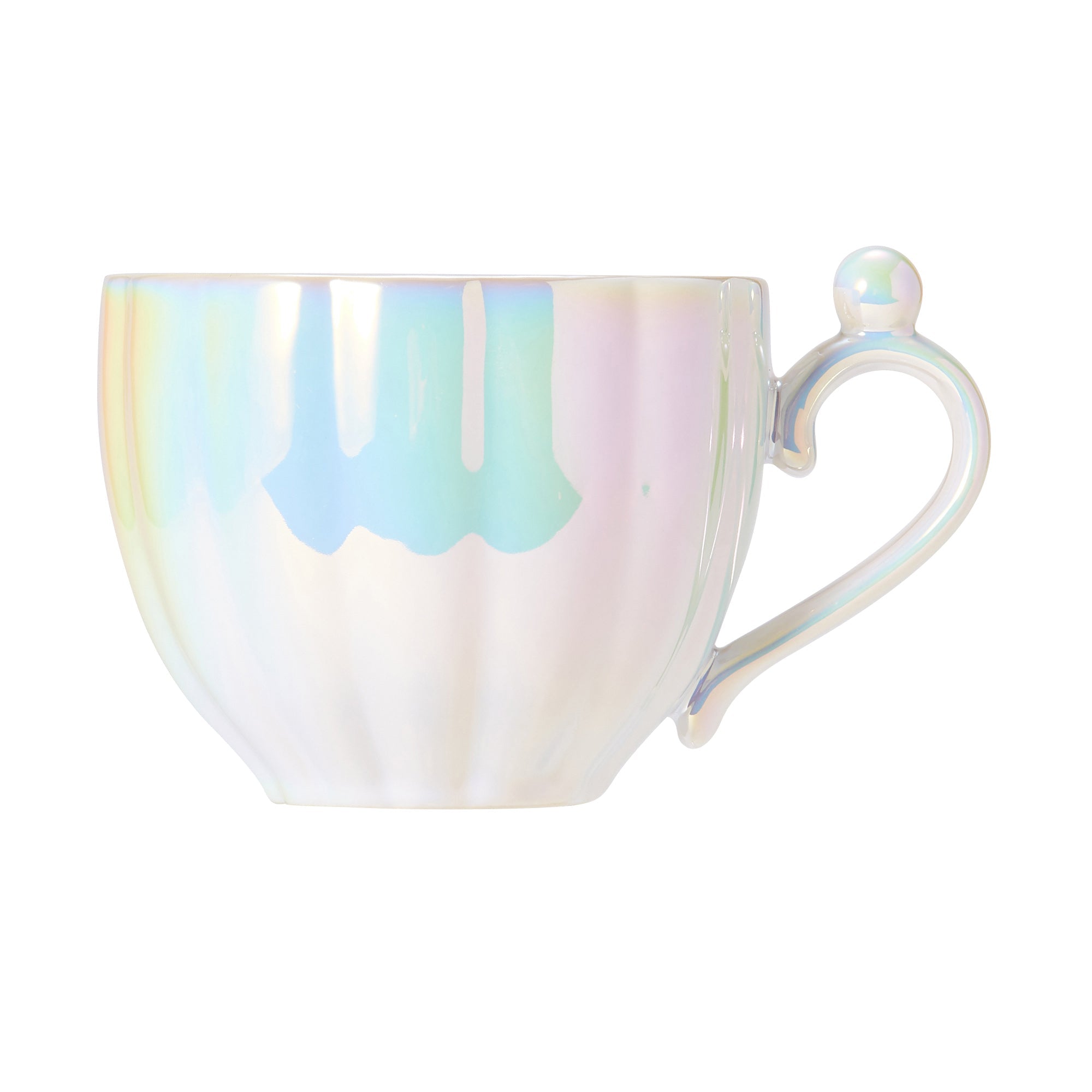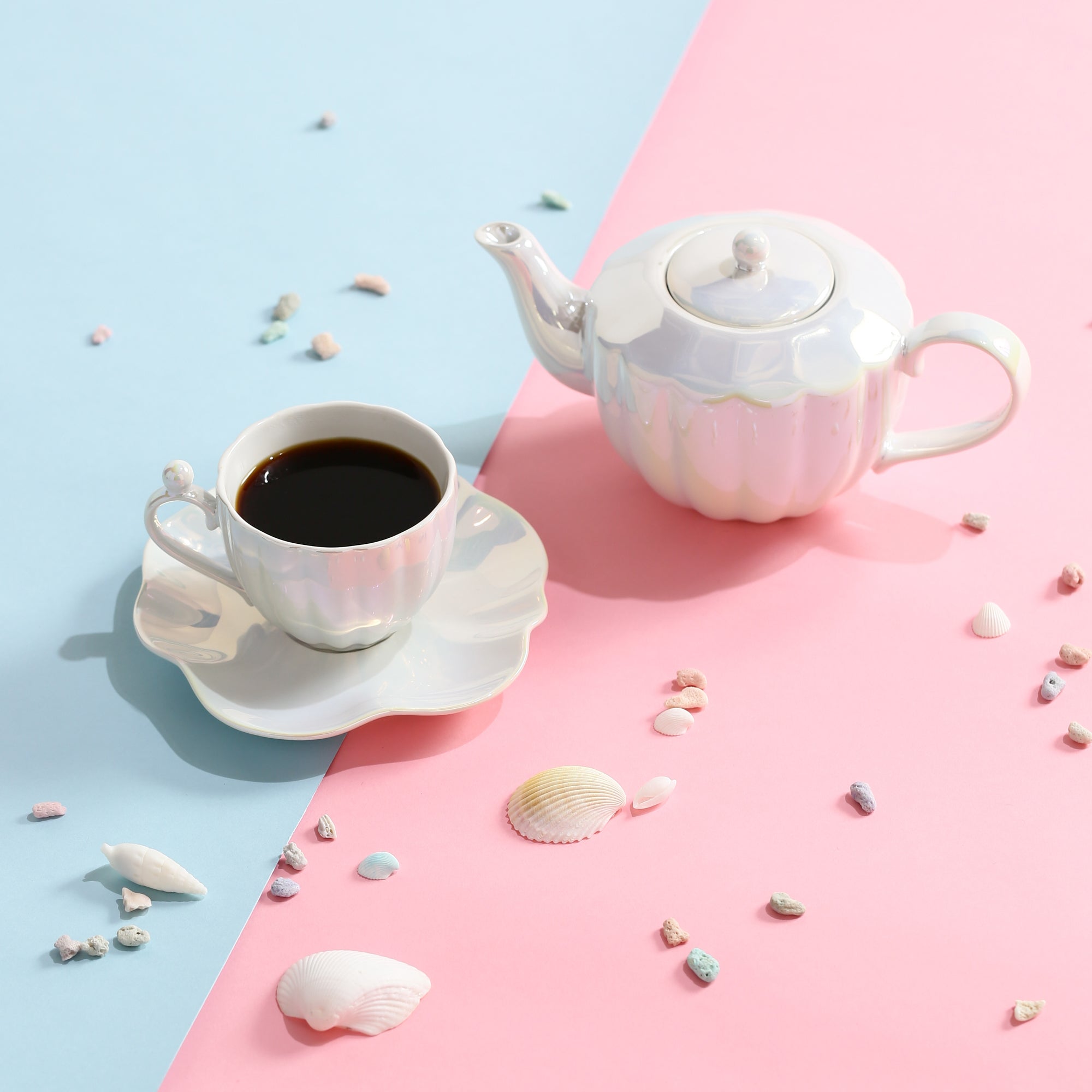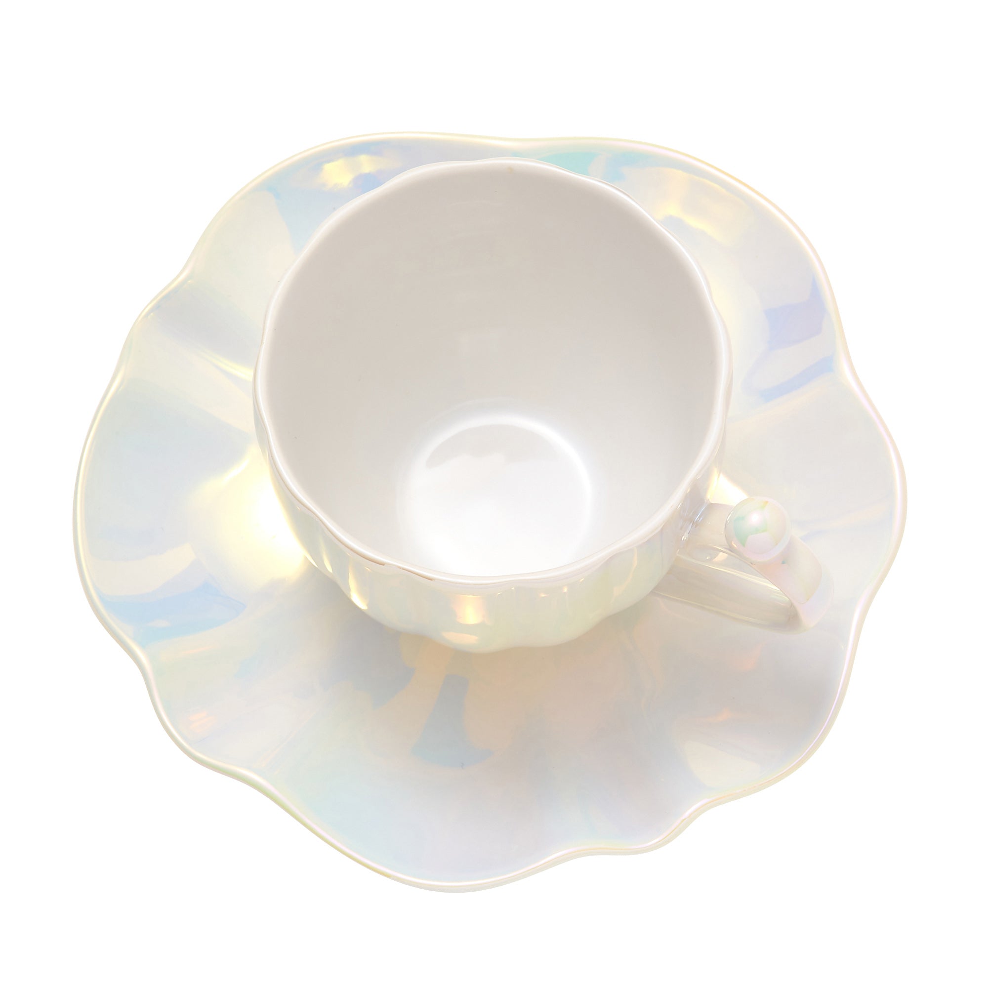 シェルモチーフ×オパール加工でかわいいがぎゅっと詰まったカップ&ソーサーです。ハンドルにあしらわれたパールモチーフがキュートなアクセントに。波をイメージさせるソーサーのカーブは七色に光って目を惹きます。おもてなしの気持ちが伝わるこだわりのカップ&ソーサーは、ホームパーティーでも大活躍。おうち時間を鮮やかに彩るアイテムで、素敵なひと時をお過ごしください。