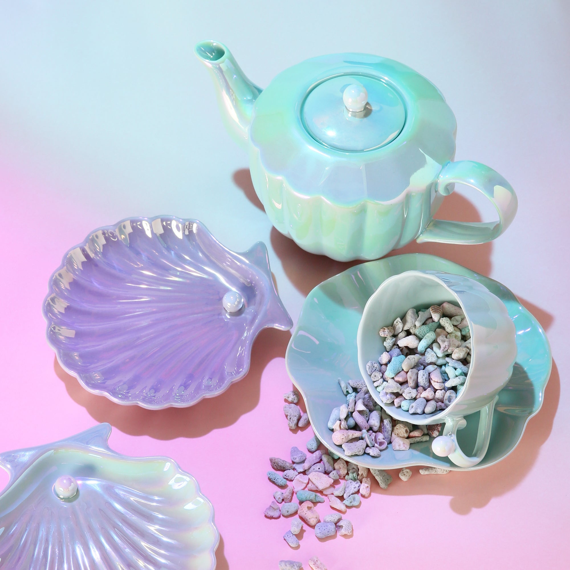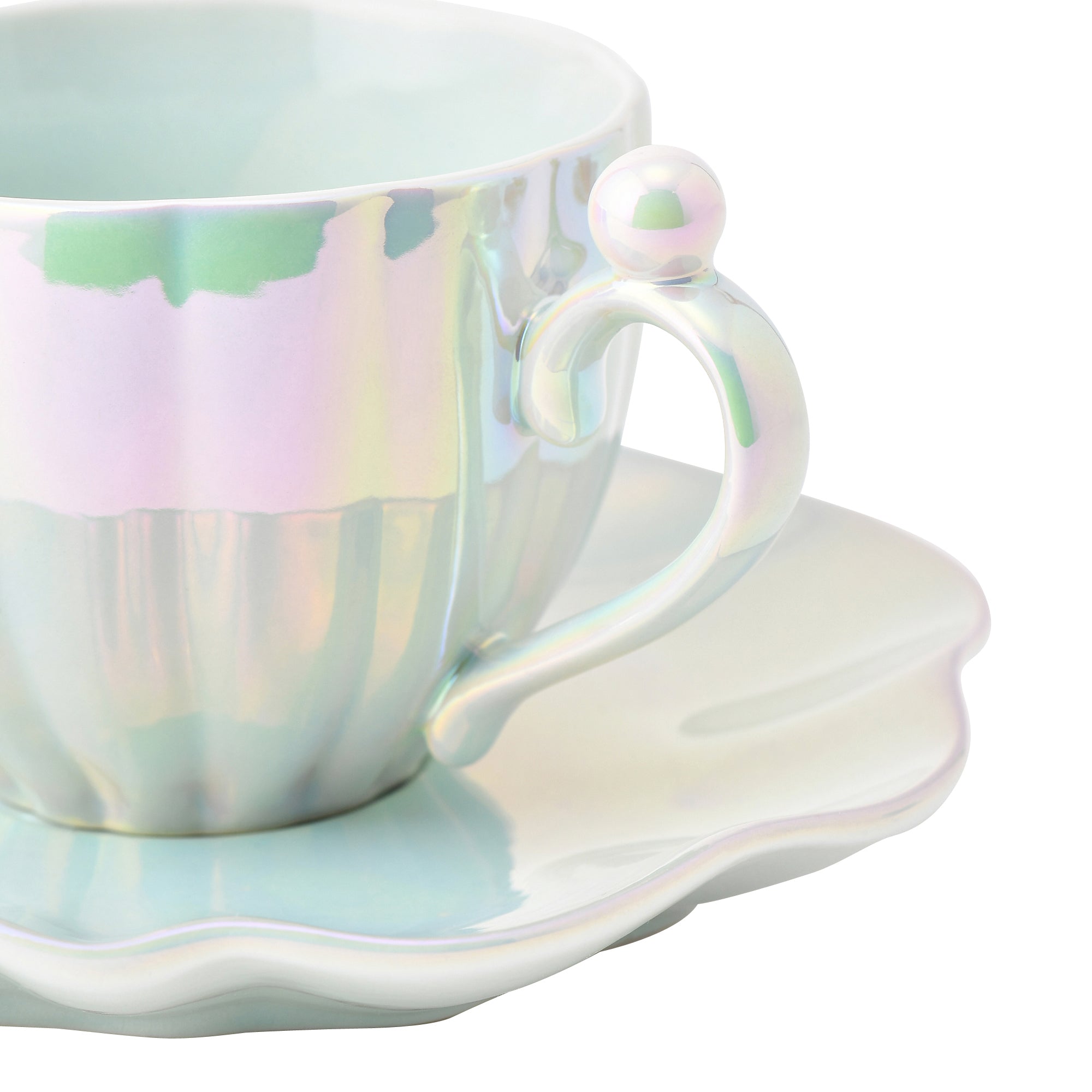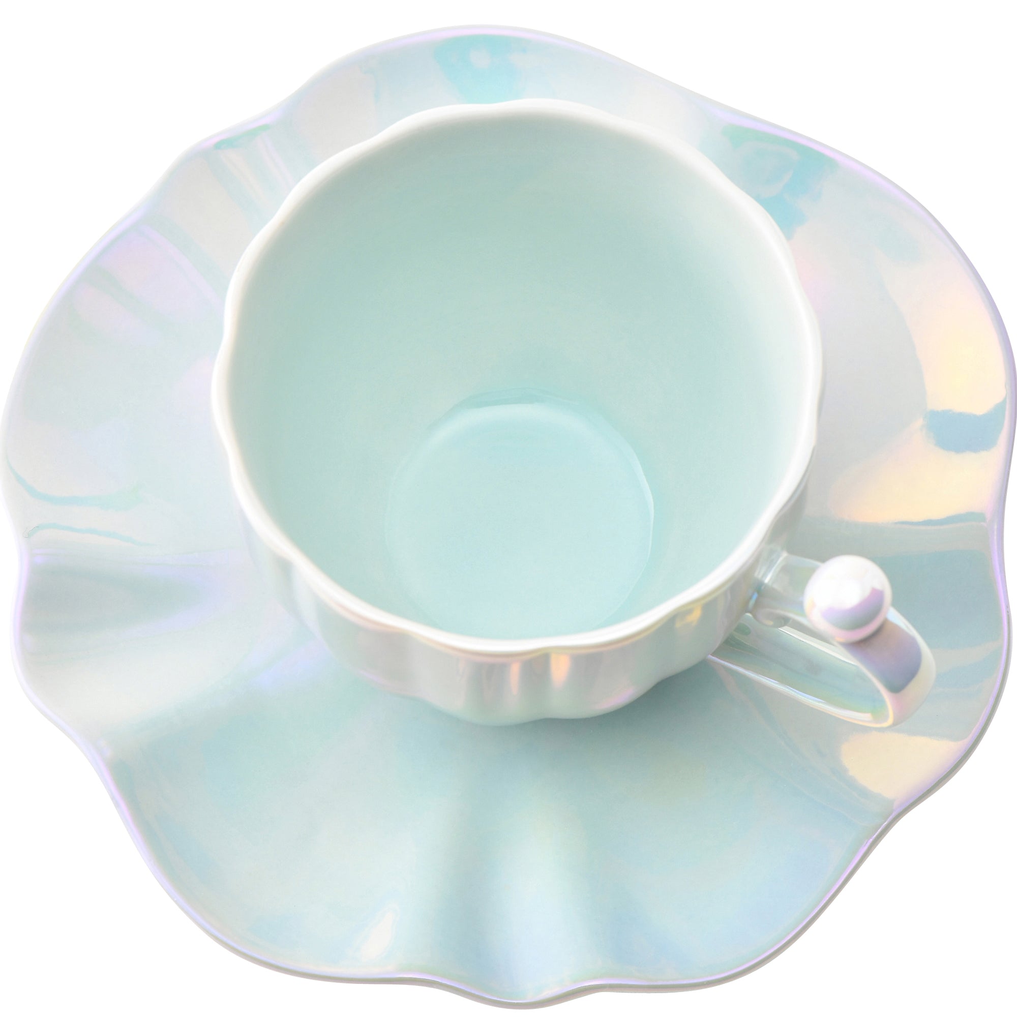 人気のオパールシェルシリーズにさわやかなミントが仲間入り。シェルモチーフ×オパール加工でかわいいがぎゅっと詰まったカップ&ソーサーです。ハンドルにあしらわれたパールモチーフがキュートなアクセントに。波をイメージさせるソーサーのカーブは七色に光って目をひきます。おもてなしの気持ちが伝わるこだわりのカップ&ソーサーは、ホームパーティーでも大活躍。おうち時間を鮮やかに彩るアイテムで、素敵な時間をお過ごしください。