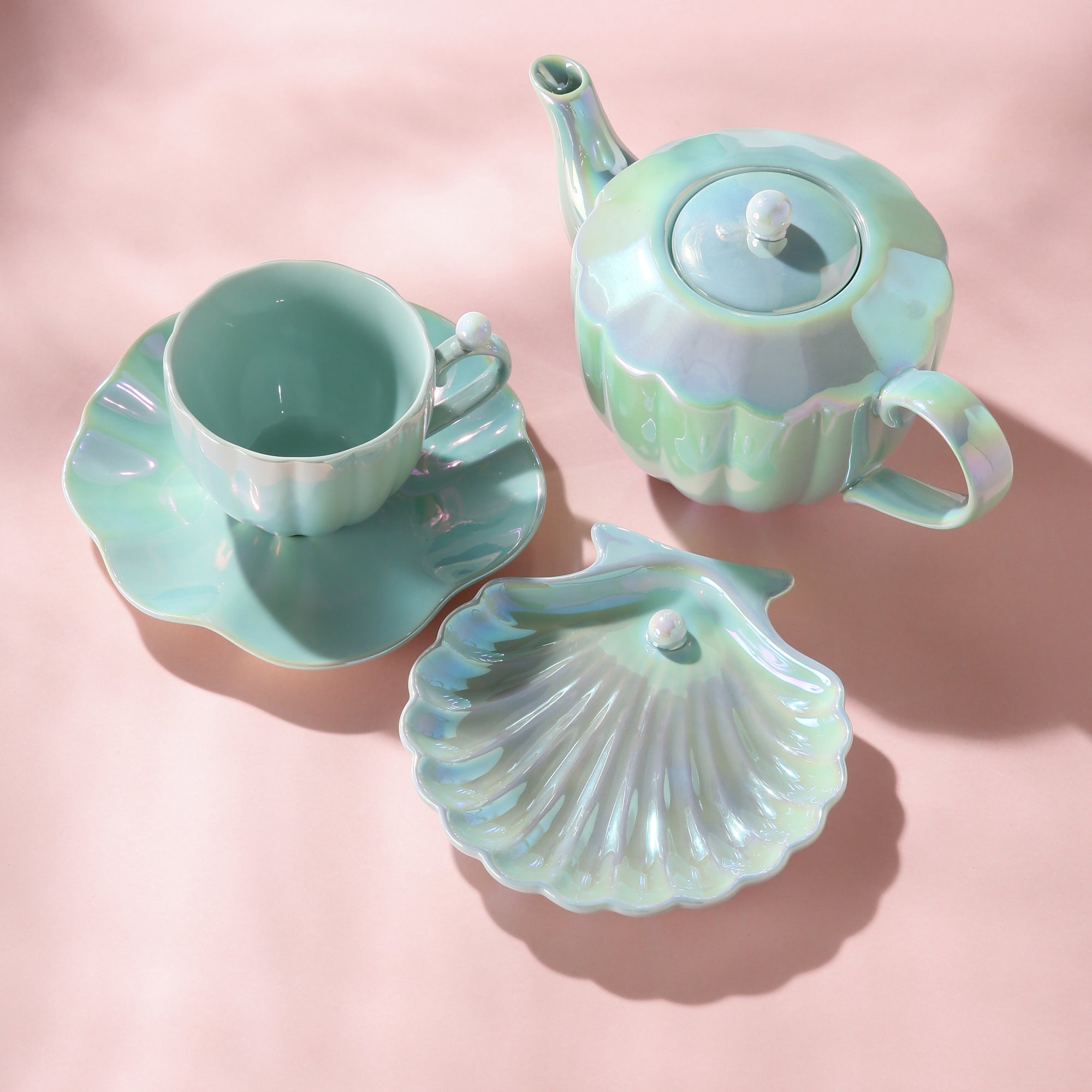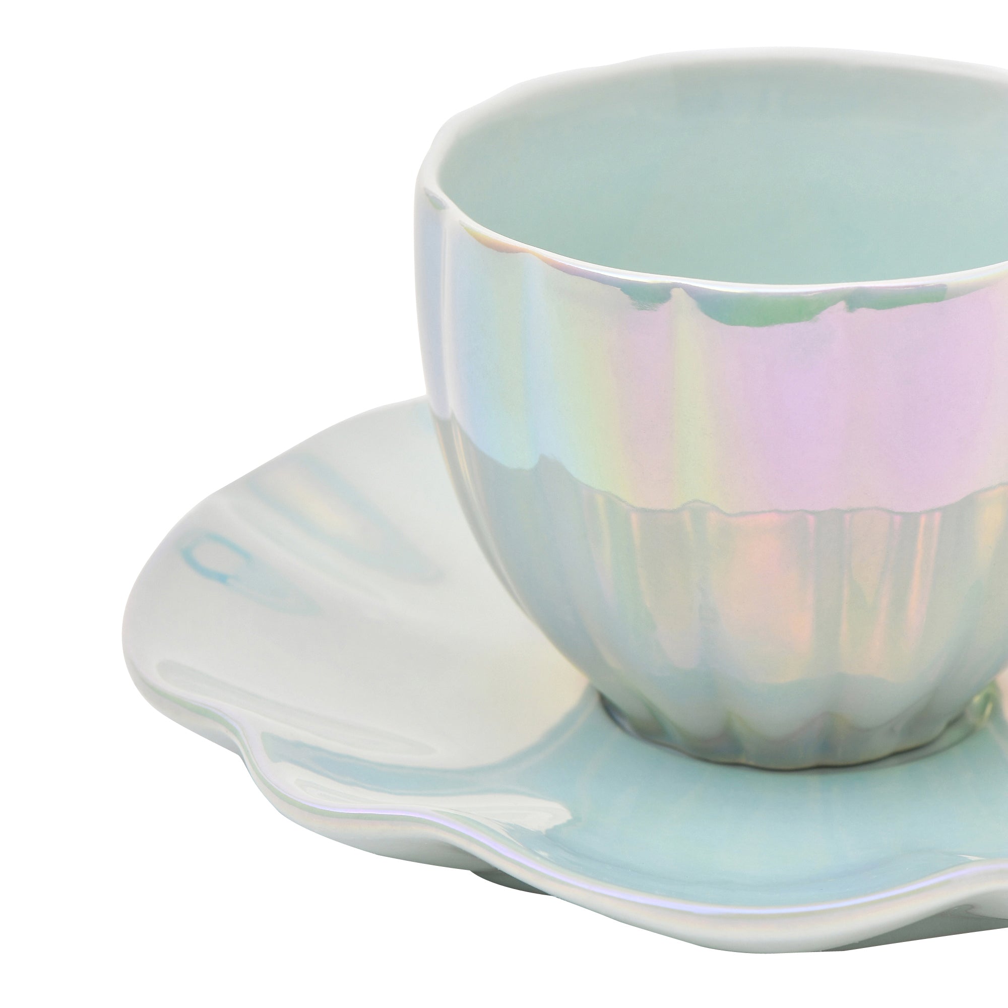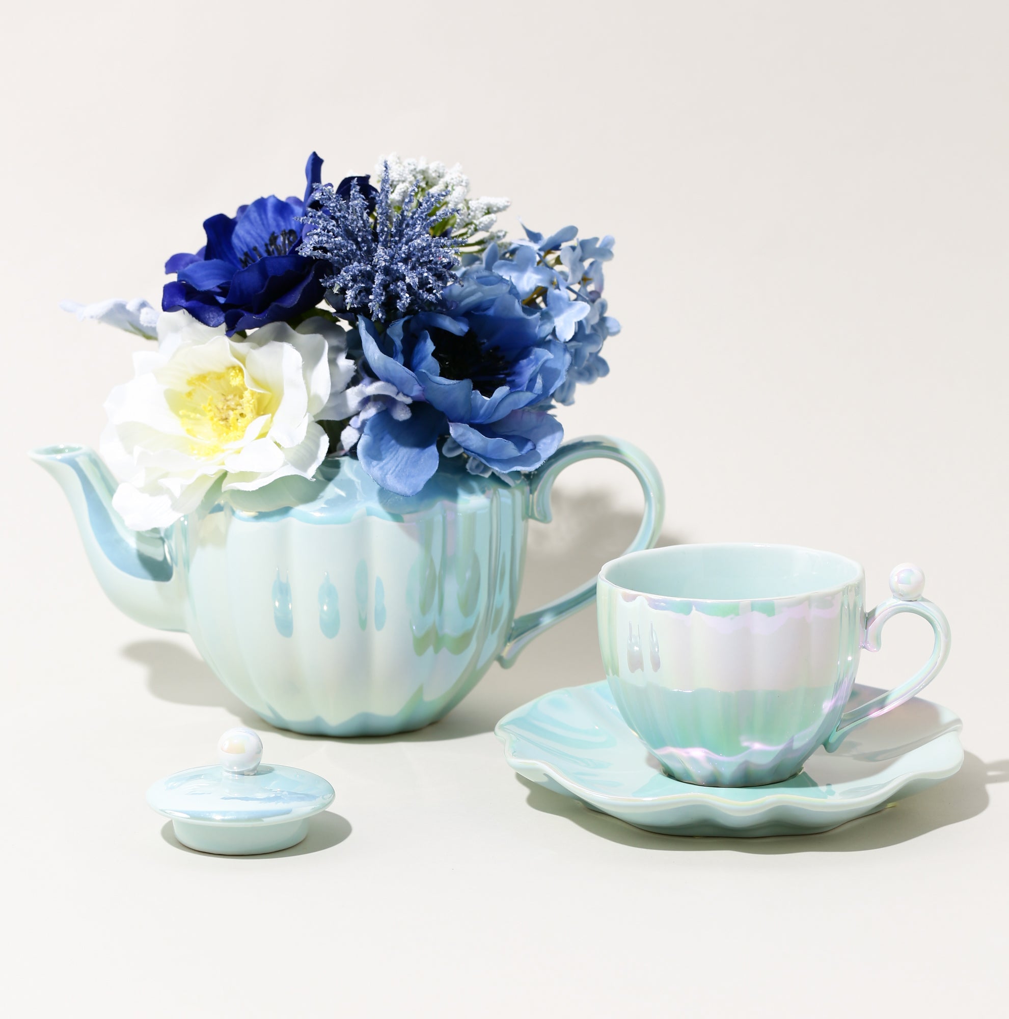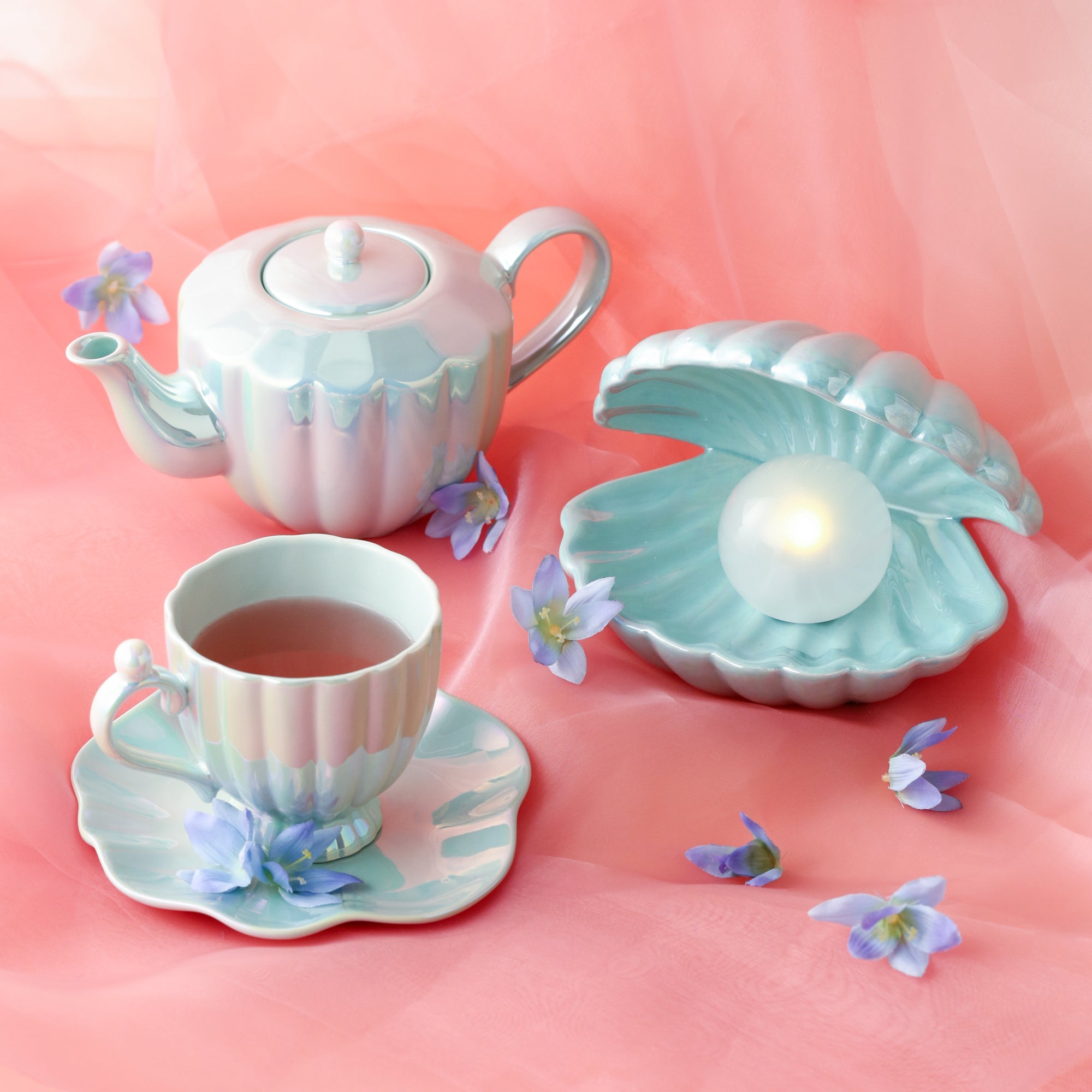 人気のオパールシェルシリーズにさわやかなミントが仲間入り。シェルモチーフ×オパール加工でかわいいがぎゅっと詰まったカップ&ソーサーです。ハンドルにあしらわれたパールモチーフがキュートなアクセントに。波をイメージさせるソーサーのカーブは七色に光って目をひきます。おもてなしの気持ちが伝わるこだわりのカップ&ソーサーは、ホームパーティーでも大活躍。おうち時間を鮮やかに彩るアイテムで、素敵な時間をお過ごしください。