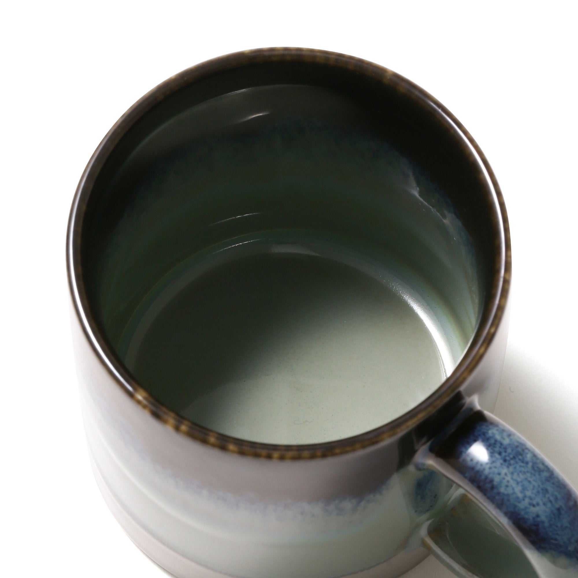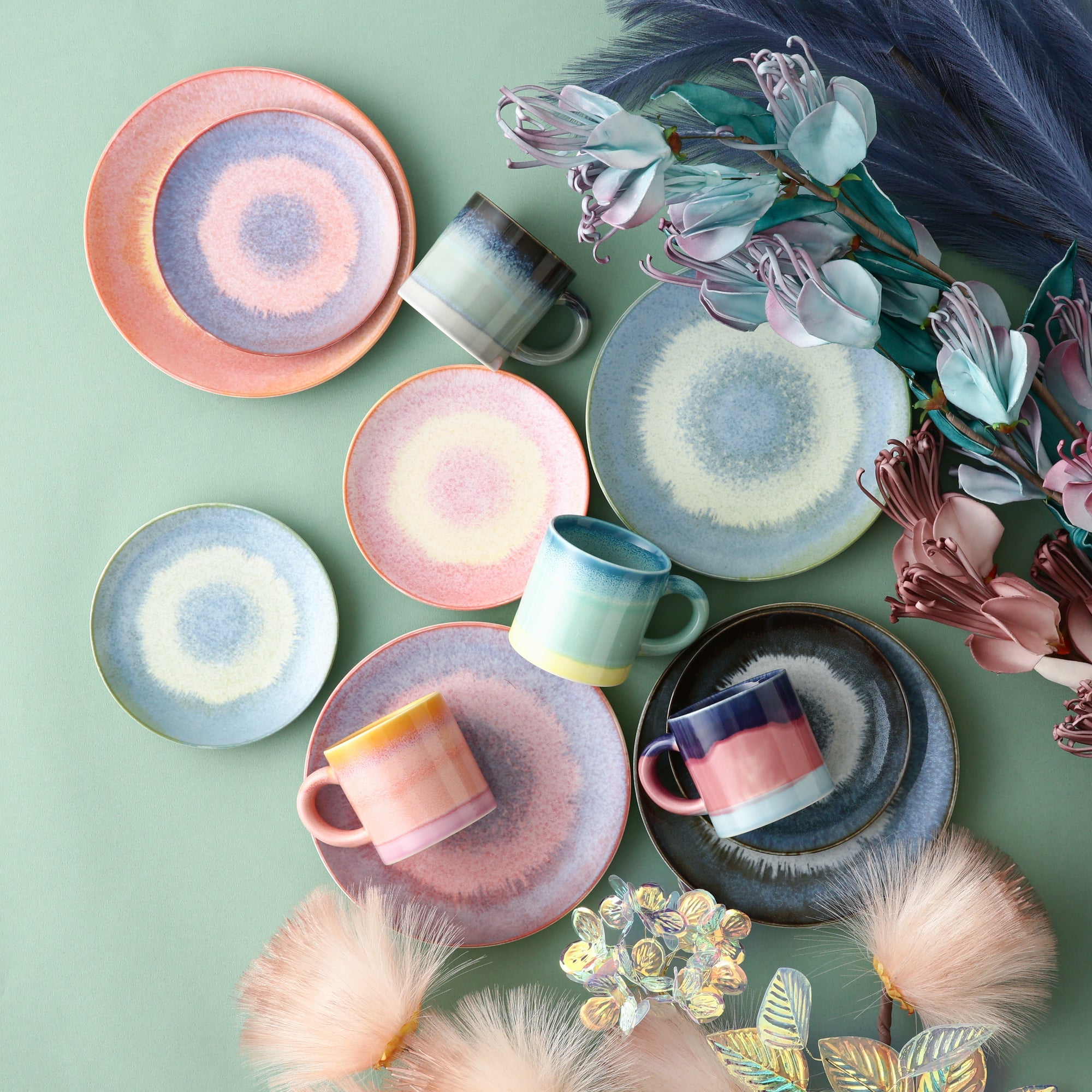 いくつも重なった色の層が美しいマグです。手作業のため少しずつ違った風合いや色のグラデーションが楽しめます。同じシリーズの色違いを組み合わせて楽しい食事の時間を演出できます。電子レンジ、食洗機も使用可能なので、実用的にお使いいただけます。