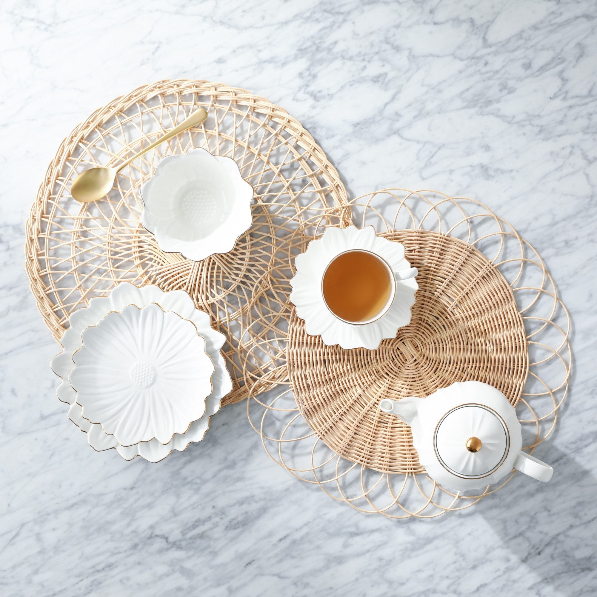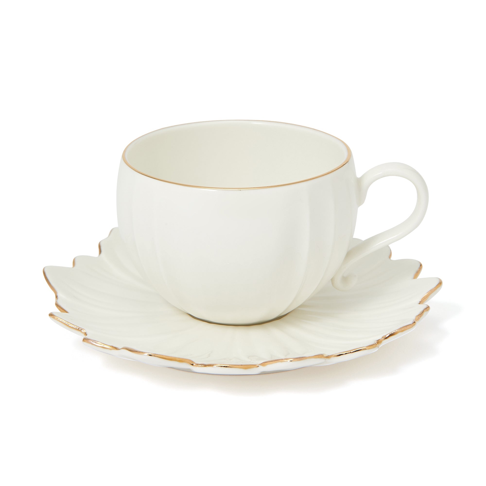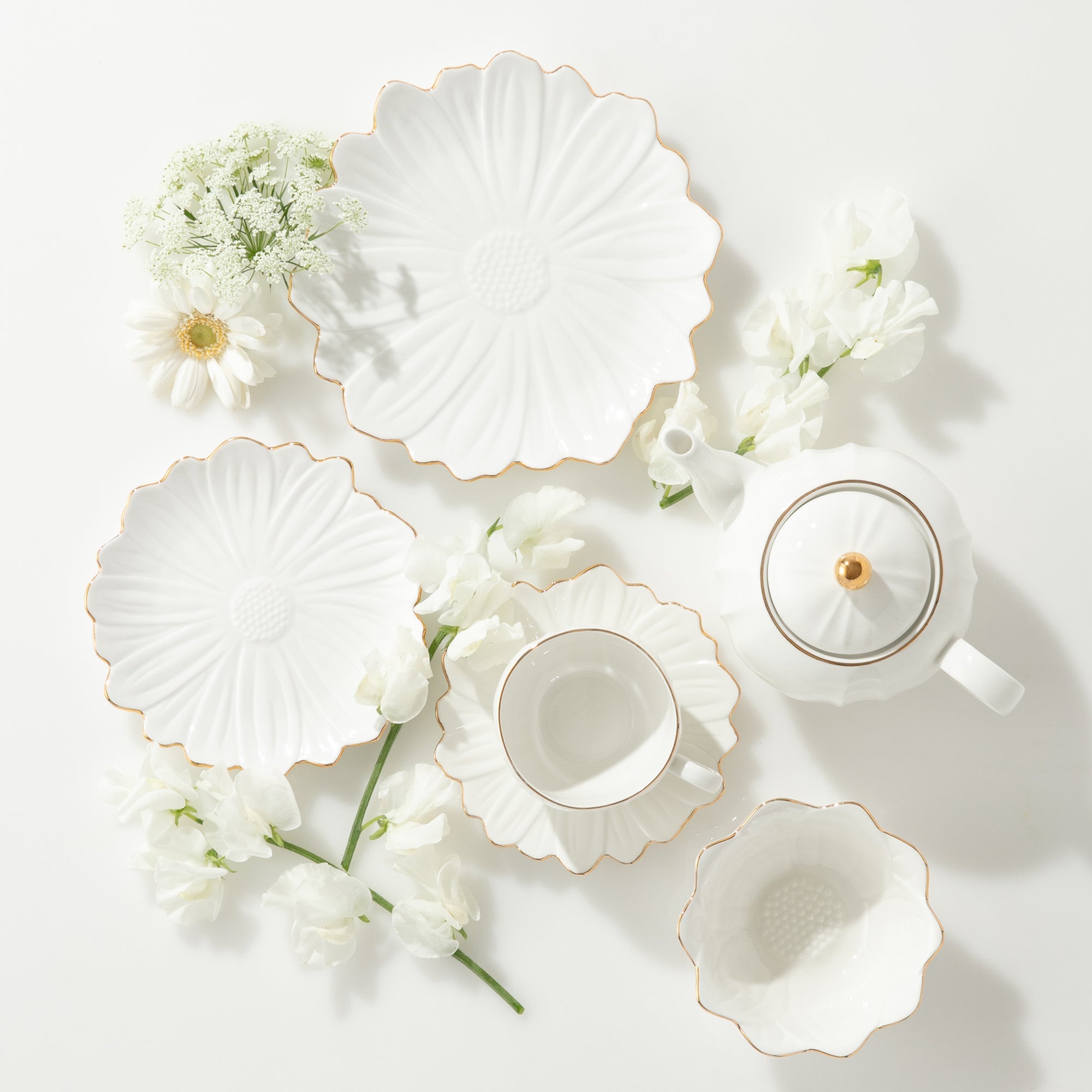定番人気のフラワーモチーフデザインにカップ&ソーサーが登場。 お花をかたどった可憐なデザインが目を引くカップ&ソーサーです。 丸みのあるカップとお花のようなソーサーがバランスのいいデザイン。 縁にゴールドをあしらうことで繊細な形状や模様が際立ち、エレガントな印象に仕上げました。 ティーポットやプレートと合わせるとより華やかなテーブルコーディネートに。ライン使いがおすすめです。