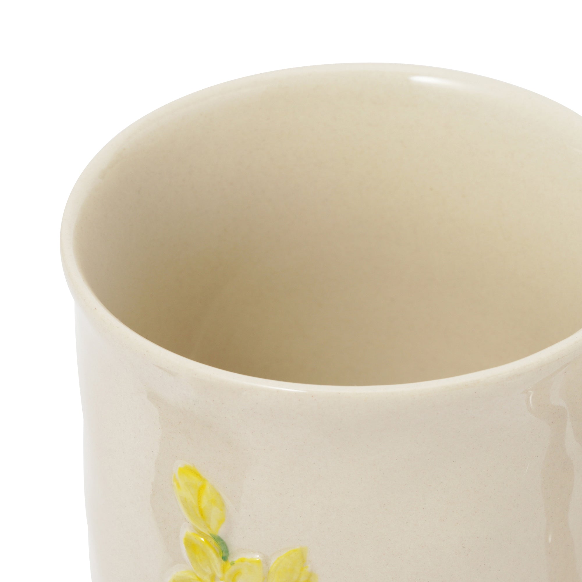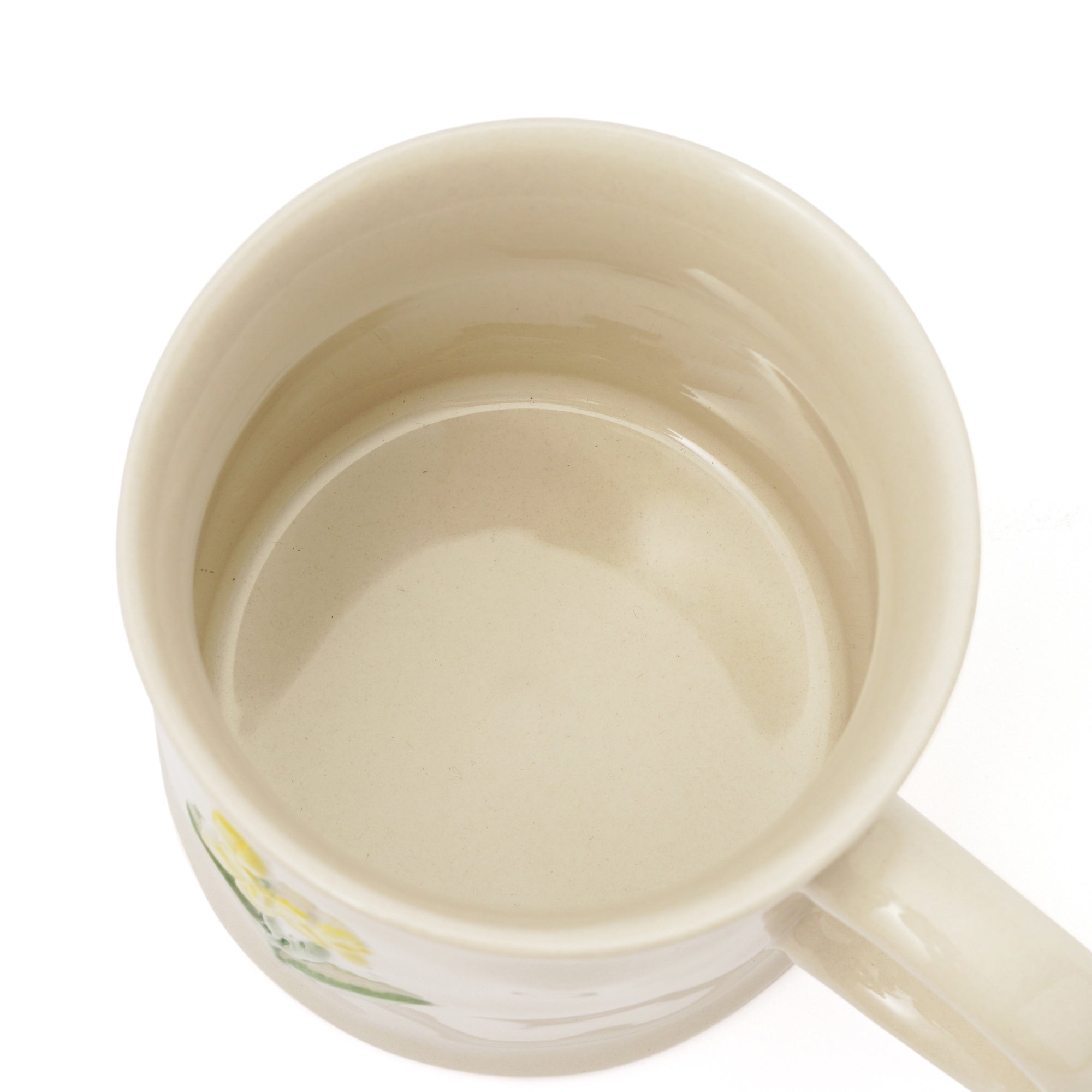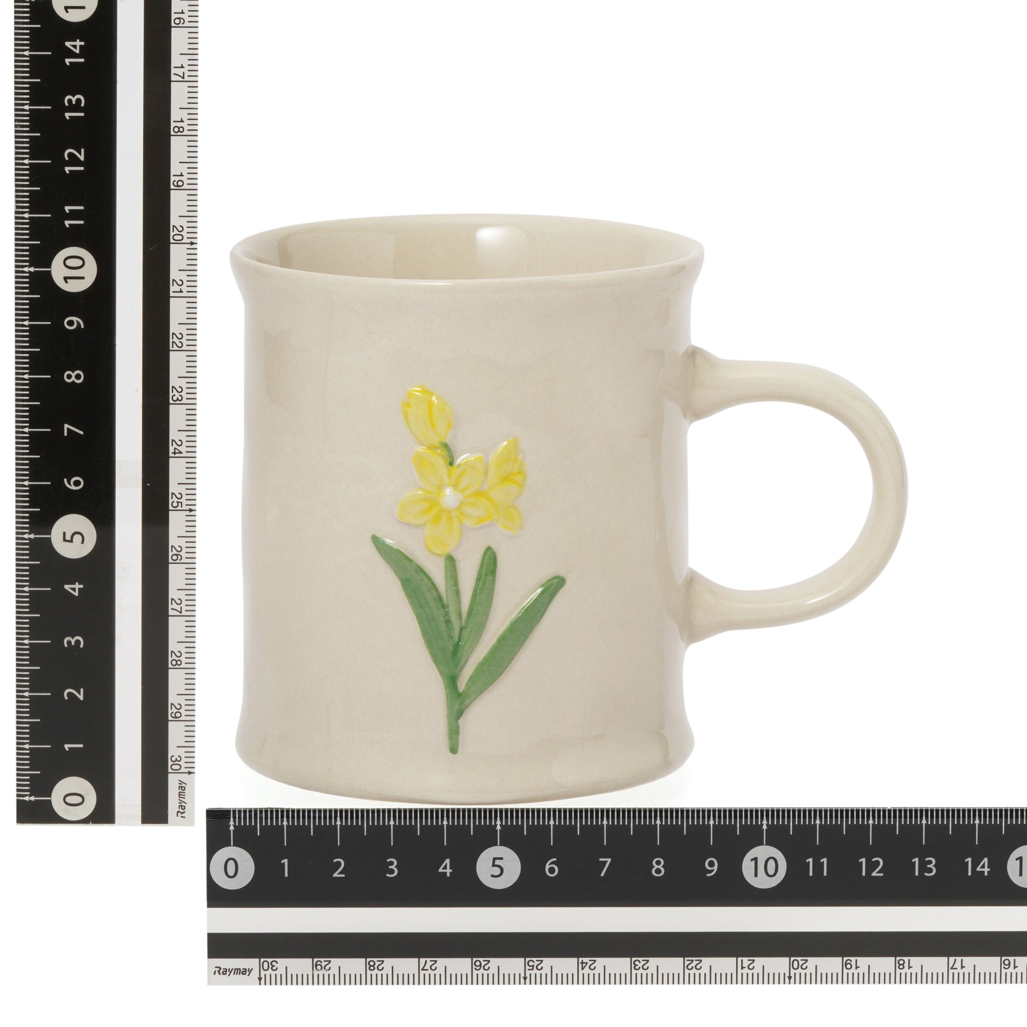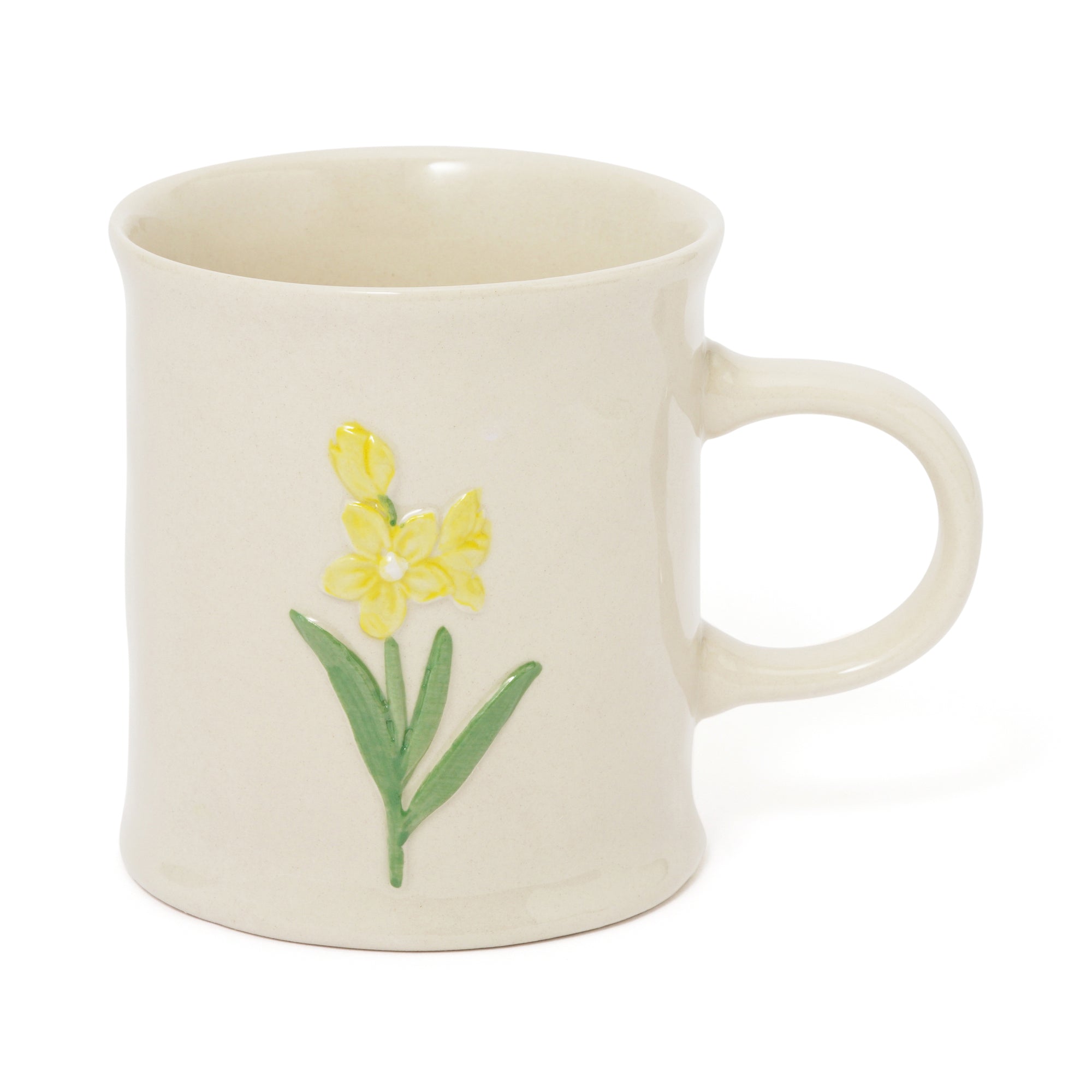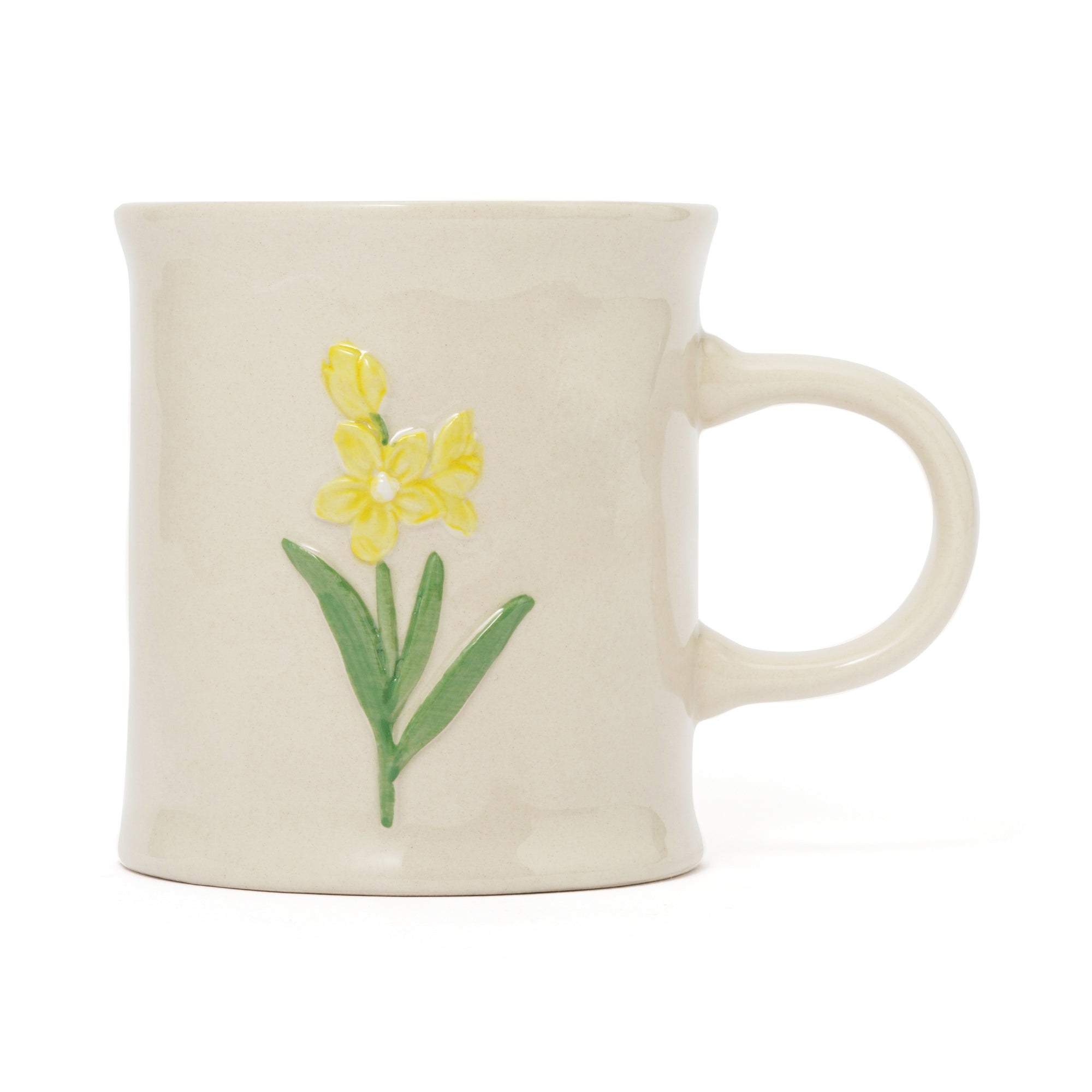 お花の模様がぽこっと浮き出したマグカップです。 ぽってりとした手びねりのようなフォルムがレトロな可愛らしさ。温かい飲み物をいれるのにぴったりのデザインです。 クラフト感たっぷりの風合いがノスタルジックで温もり溢れるティータイムを演出します。