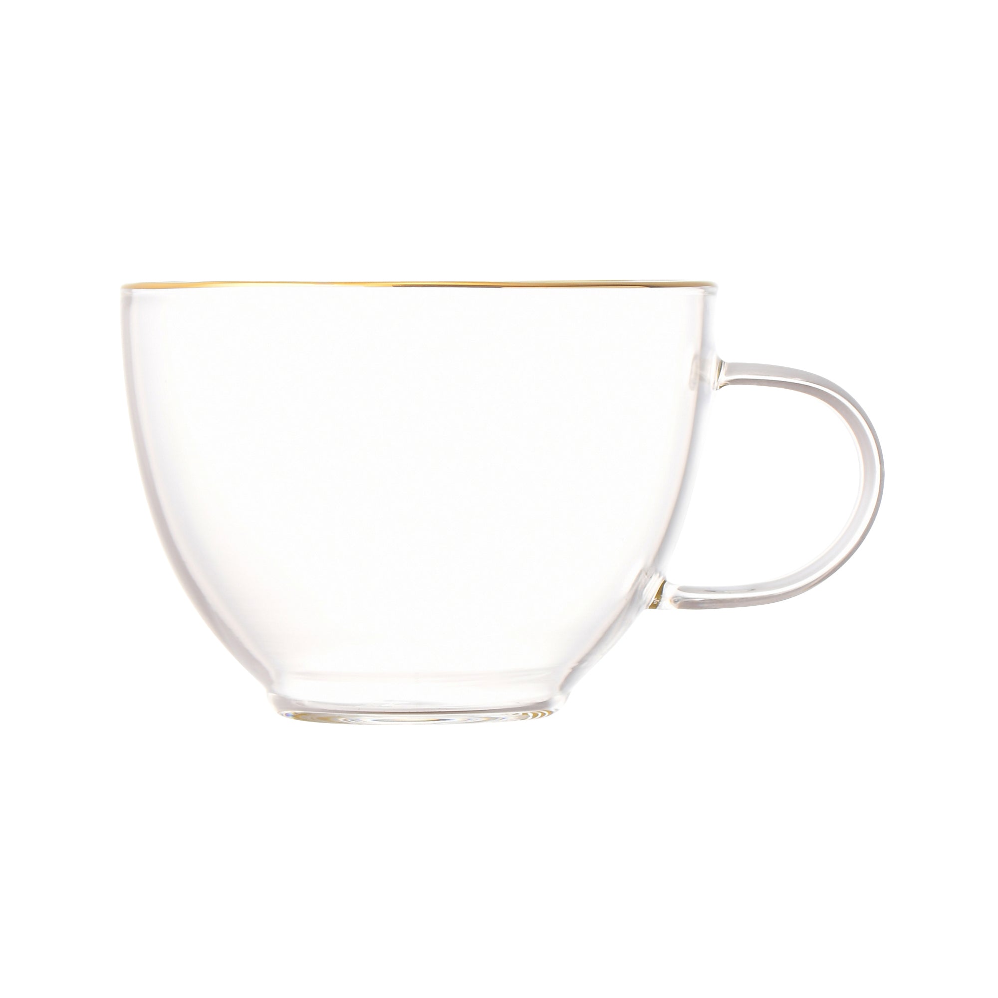 耐熱クリアガラスのカップ&ソーサーです。飲み物はもちろん、スイーツを入れてデザートカップとしてもかわいくお使いいただけます。シンプルなフォルムにゴールドのメッキ加工が写真映えする華やかなデザインは、おうちカフェタイムにおすすめです。