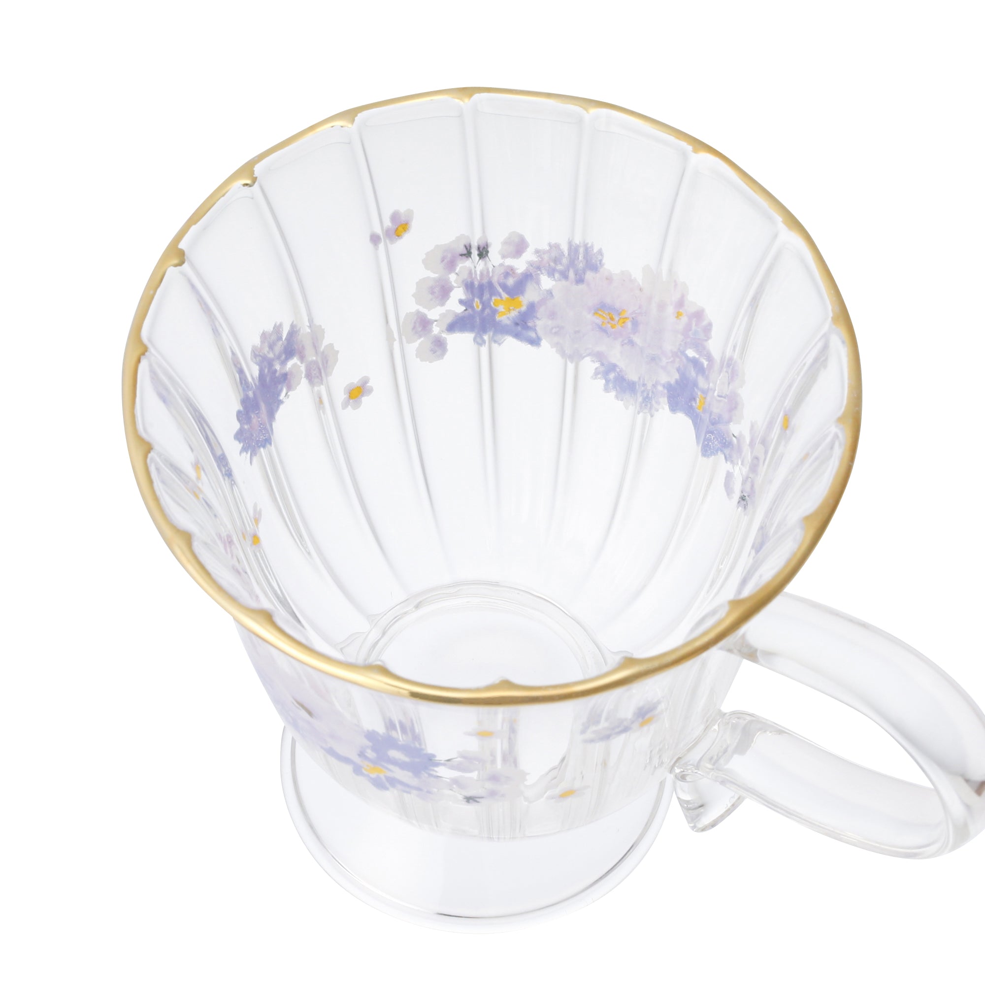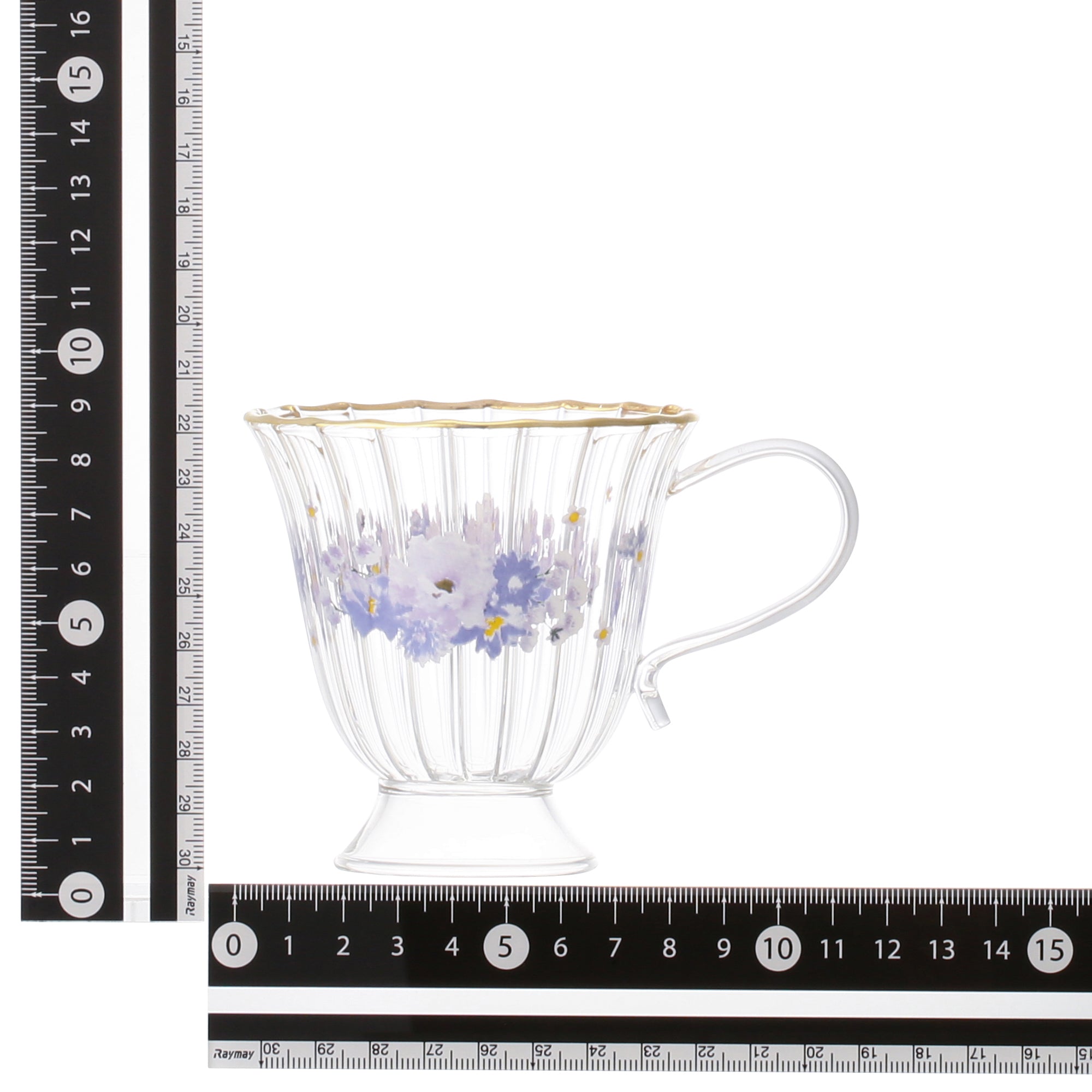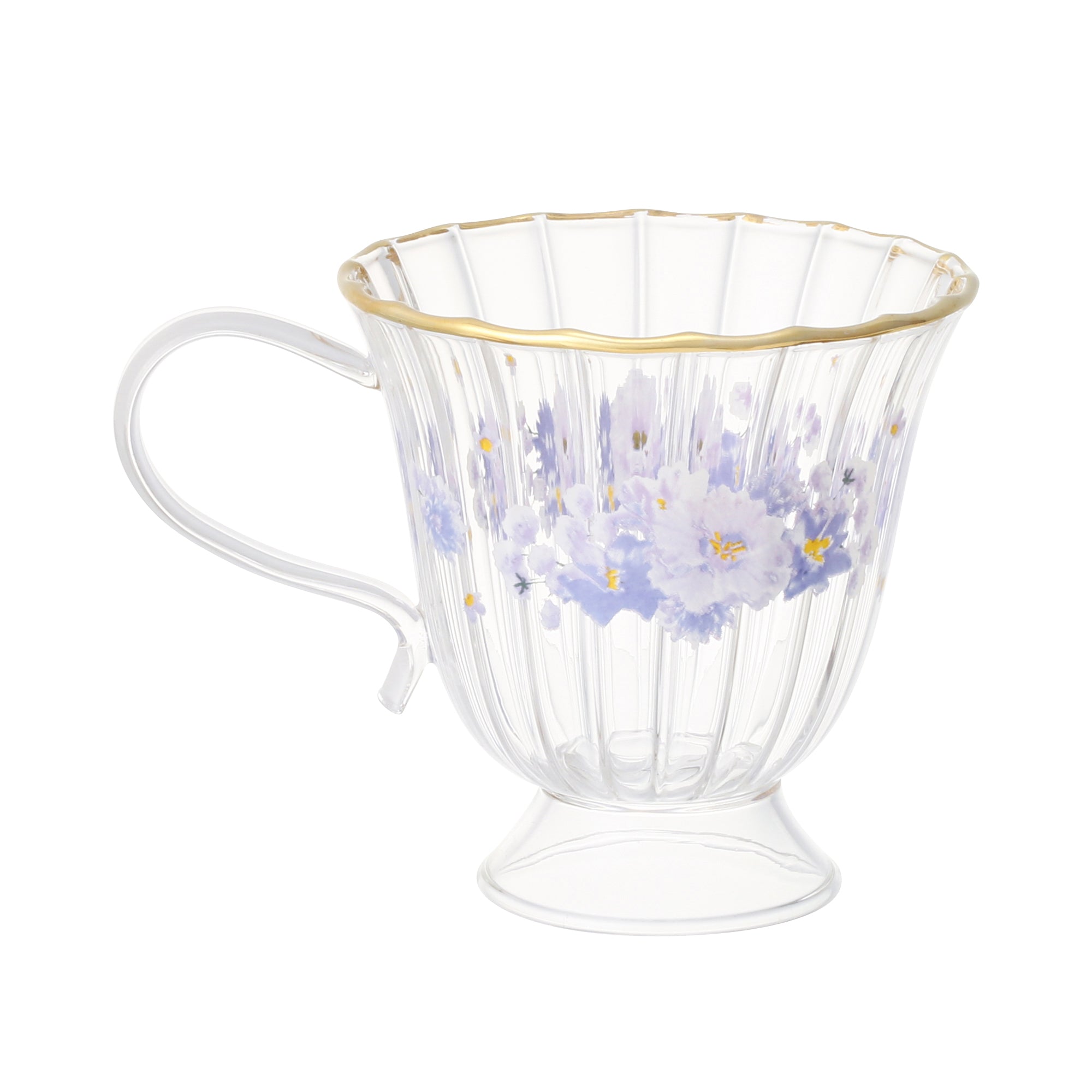 フリルの形状の上品なガラスウェアに花柄のデザインをつけたティーシリーズです。ゴールドのリムが華やかさをプラスして、優雅なカフェタイムを演出します。甘くなりすぎない色味に仕上げ、ナチュラルなコーディネートを始めトレンドのおうちカフェや韓国インテリアなどにも合わせやすいマグです。