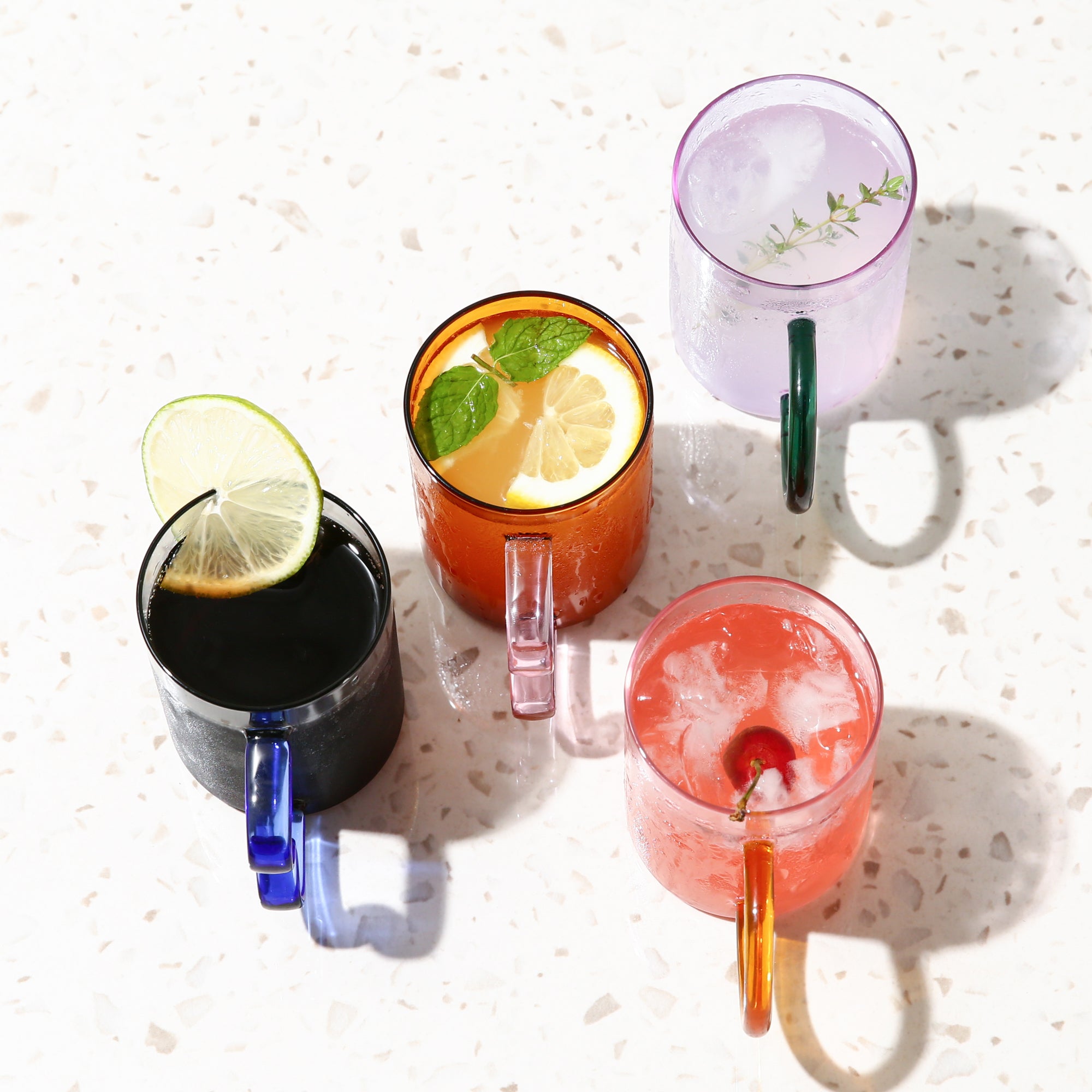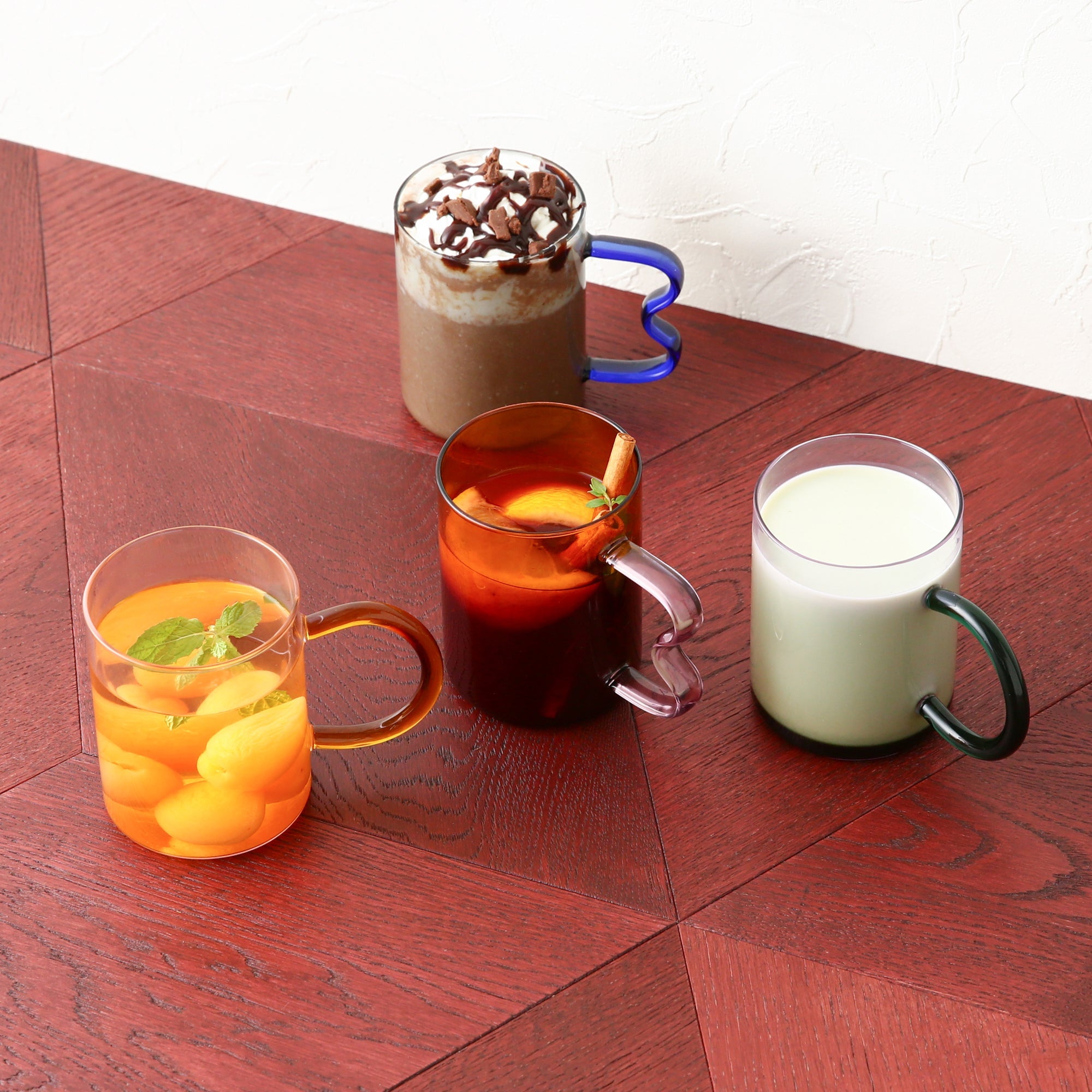 何卒ご理解賜りますようお願いいたします。耐熱ガラスのバイカラーマグです。ドリンクが綺麗に見える人気のクリアなデザイン。入れるドリンクによって表情を変えるのが可愛らしく、おもてなしの場面でも喜ばれます。バイカラーのシンプルな色味ながら、どこか個性的でお洒落な雰囲気を演出します。4つのパターンをご用意しました。お好みの組み合わせでテーブルコーディネートをお楽しみください。ちょっとしたプレゼントにもおすすめです。