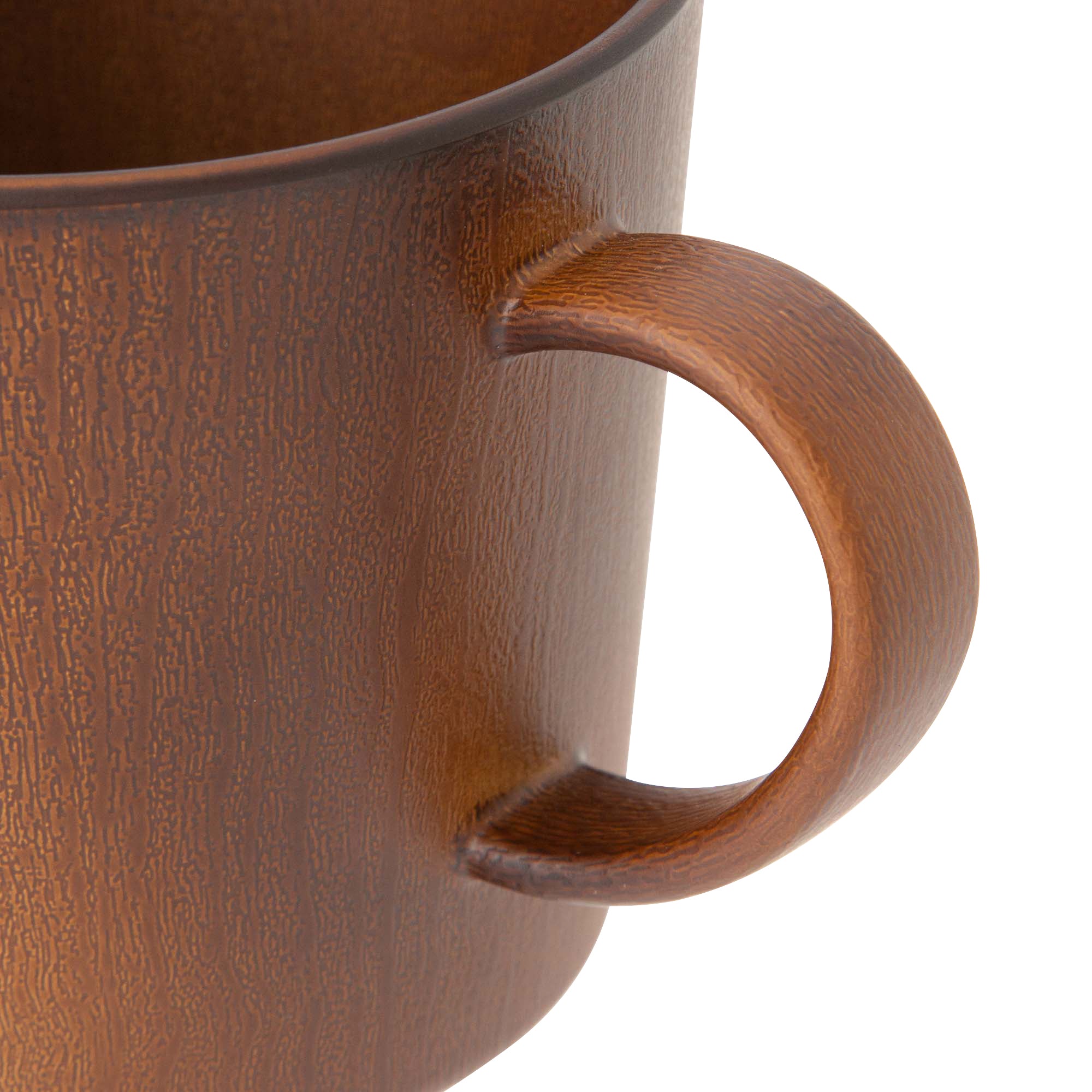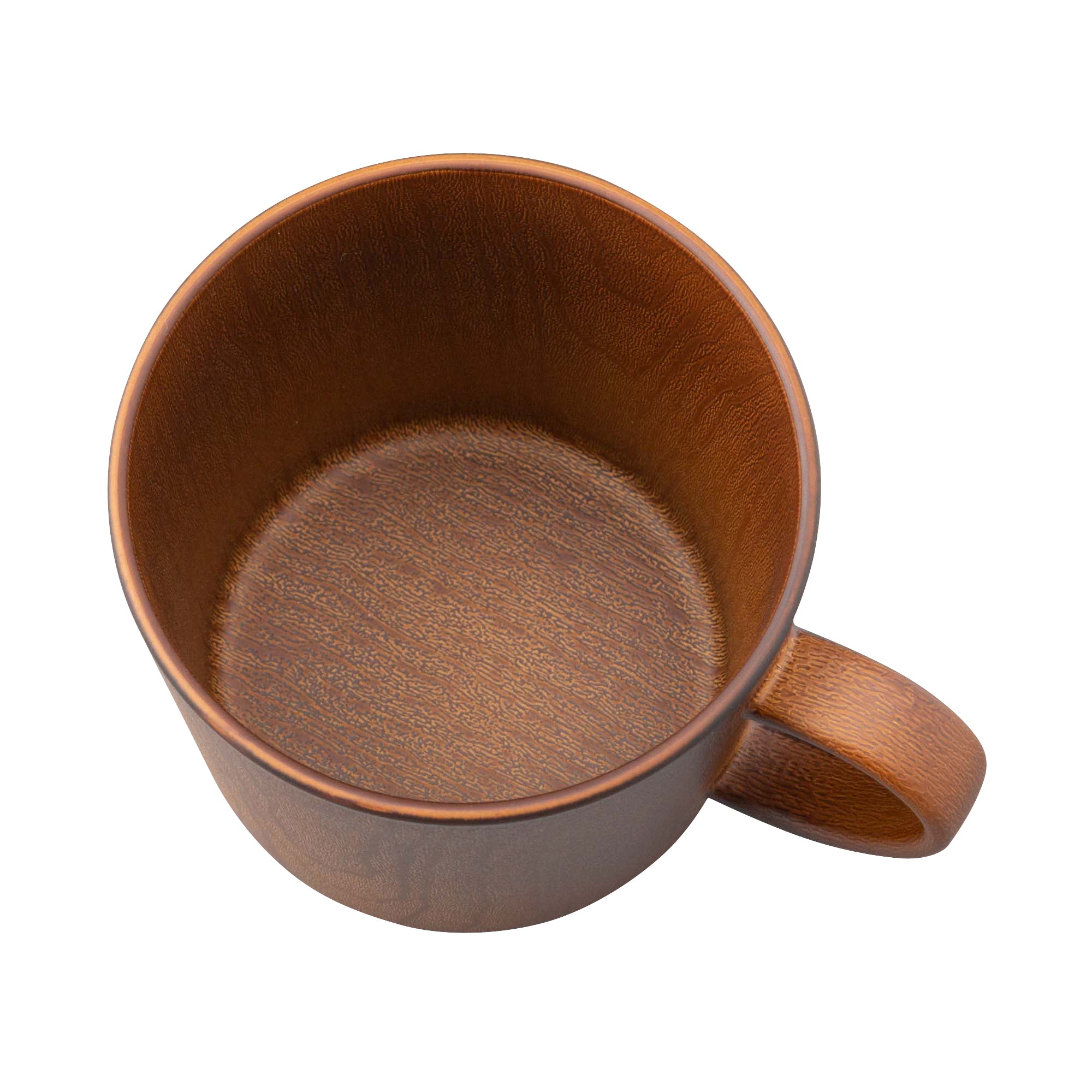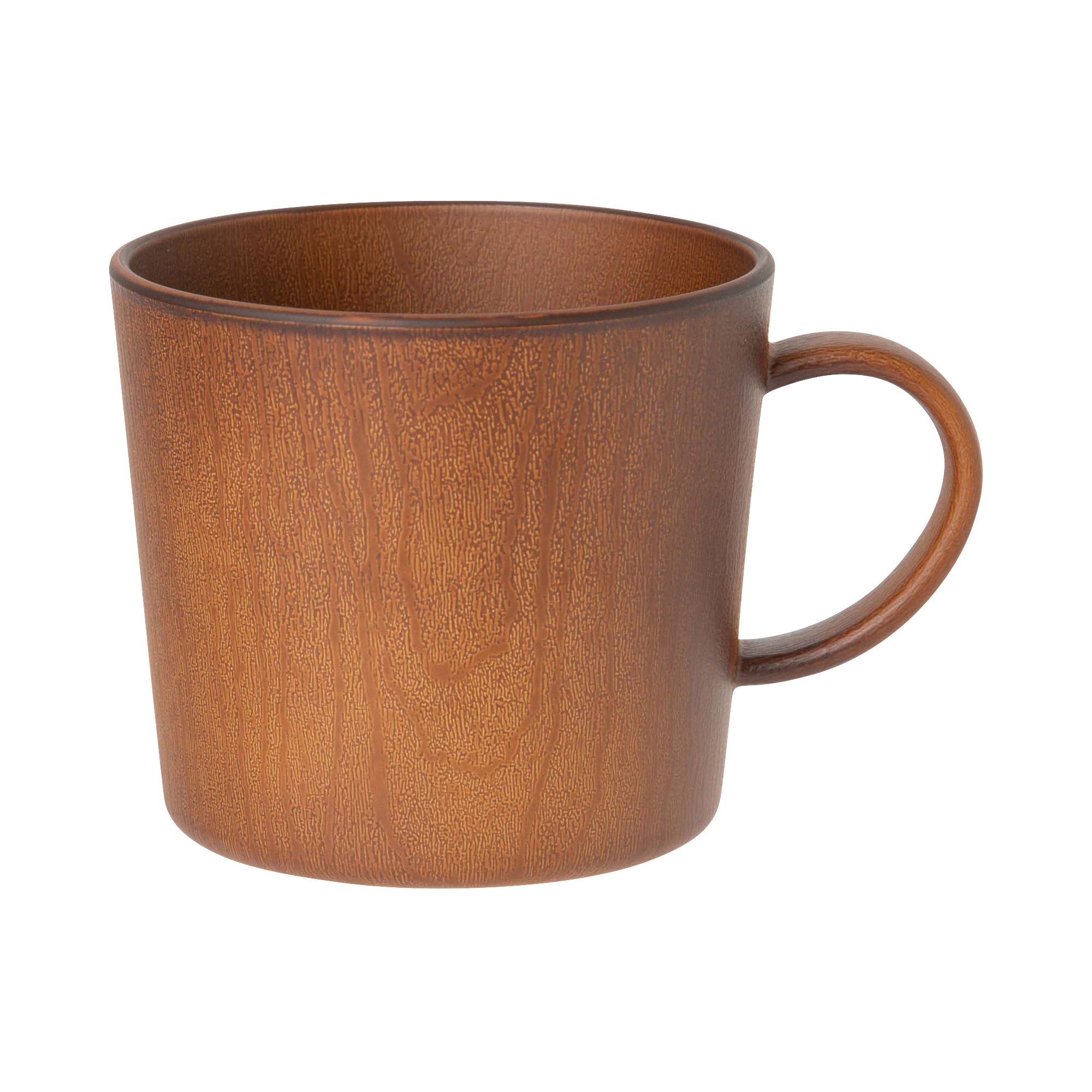 リアルな木の模様が美しいお手軽便利な樹脂製のマグです。日本製の上、軽くて割れにくいので安心してお使いいただけます。電子レンジも食器洗浄機も使えて、普段使いにぴったりです。食器の表面の木目模様は全て職人さんの手仕事です。技術の高い職人さんによりリアルな木目模様を施してもらいました。