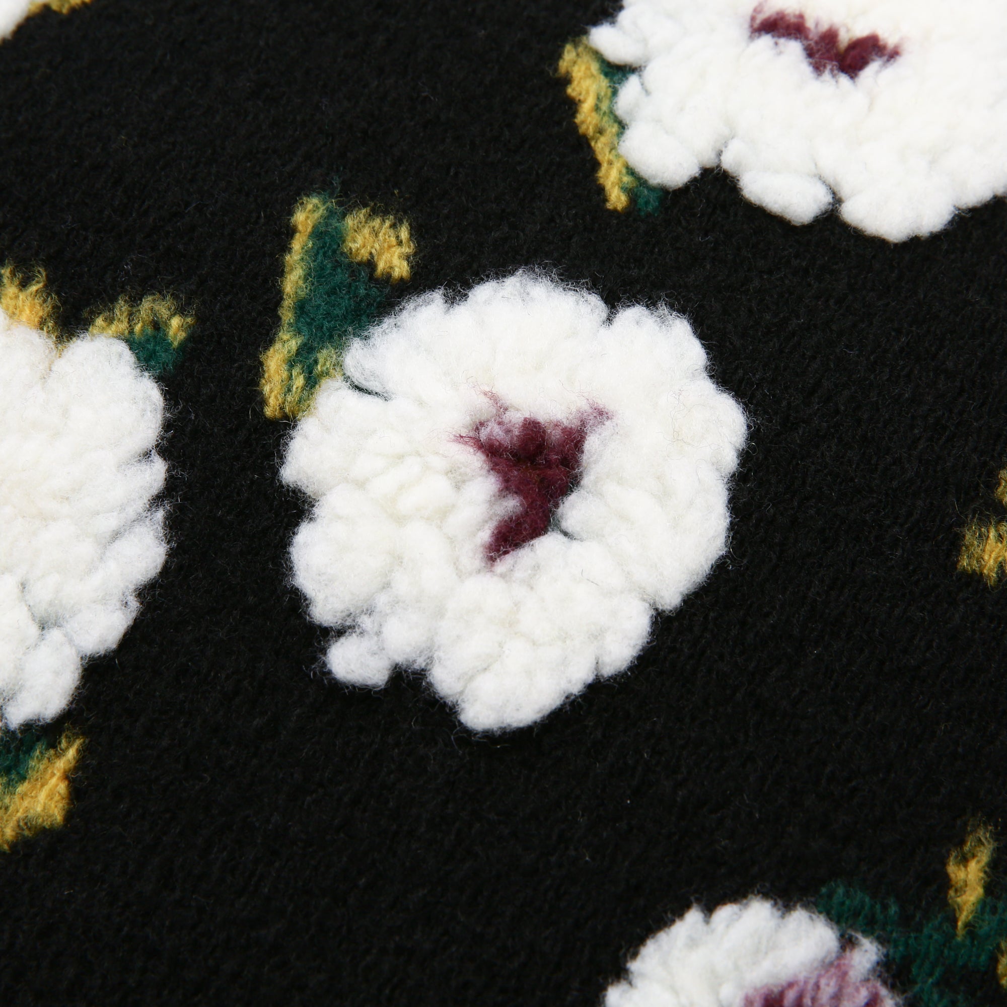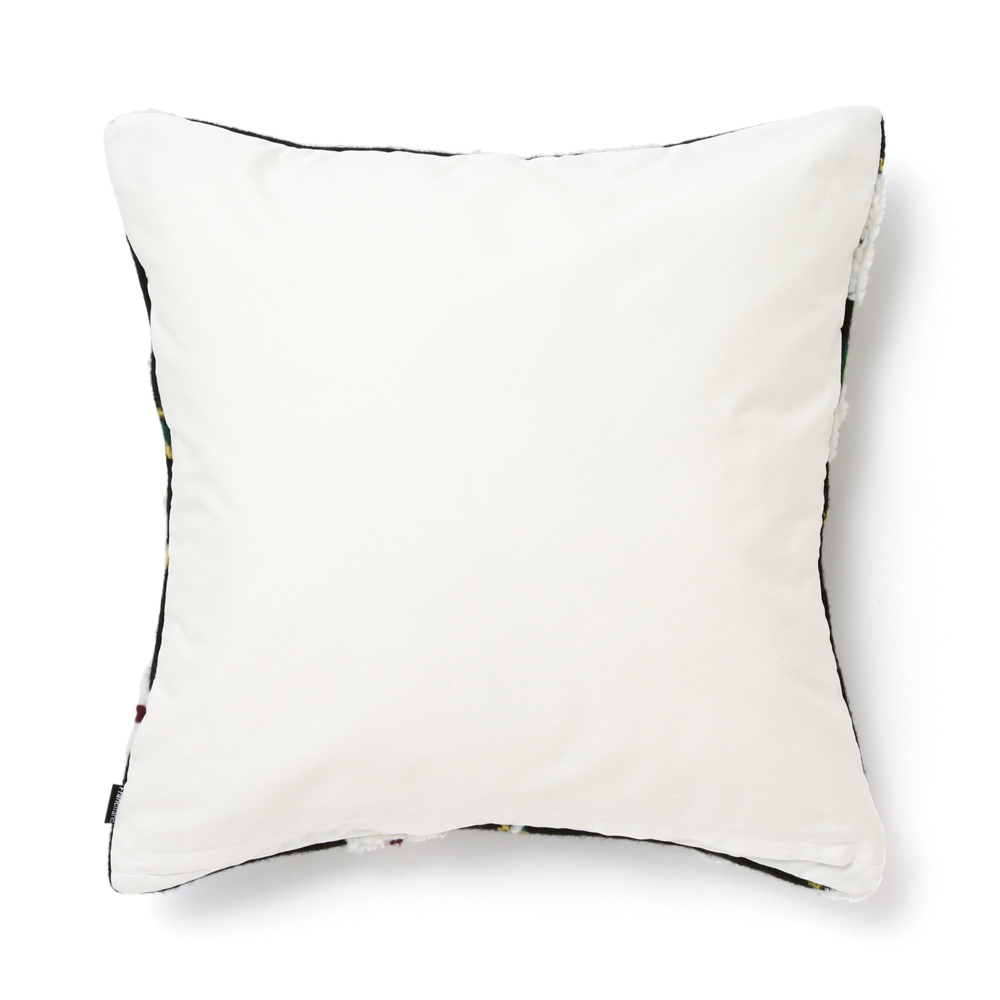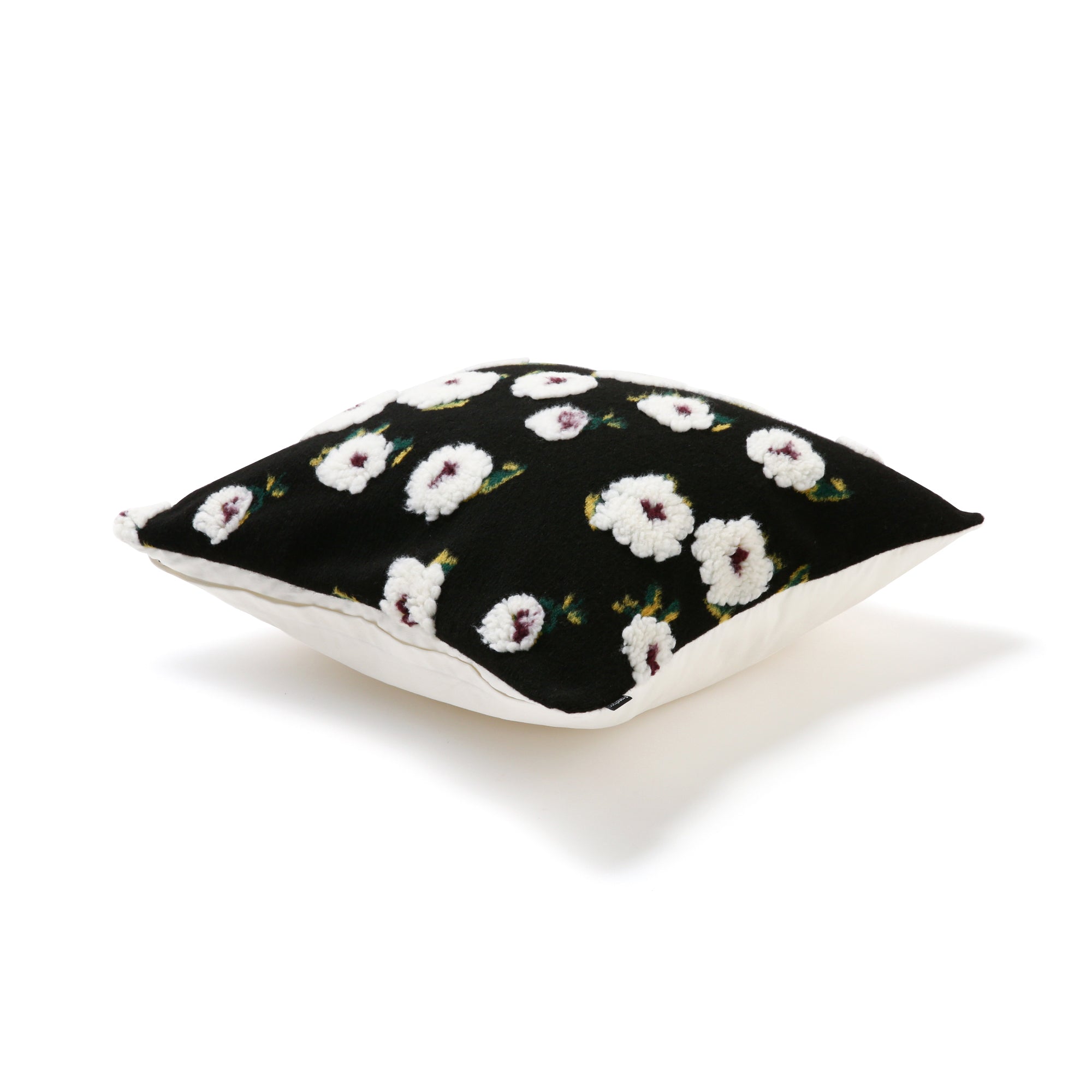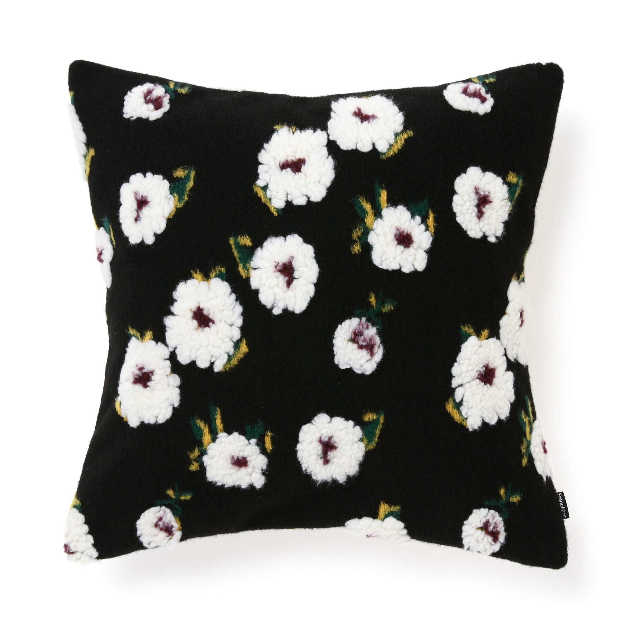 起毛糸を用いジャガード織で花柄を施したクッションカバーです。引き締まったブラックを背景に映える真っ白なお花のモチーフが印象的な、絵画のようなデザイン。お部屋に置くだけで自然と視線が向くような、存在感のあるクッションカバーに仕上がりました。まるで黒い背景から浮き出ているように見えるのは、立体感のある太めの毛糸でお花を表現しているためです。ふわふわの質感が柔らかいお花を表現するのにぴったり。さりげなく描かれた花の葉も、グリーンとイエローで動きのある表情に。お花の中心に施された大人っぽいパープルがアクセントになり、モダンでエレガントな雰囲気のお部屋にぴったりです。裏面は真っ白な無地の布なので、柄物のクッションカバーなどと組み合わせる際は、逆にしてもお使いいただけます。シックで落ち着いたコーディネートがお好みであれば、モーヴがかったパープルやダスティなピンク。華やかでエレガントなテイストであれば、ゴールドやシルバーとの組み合わせがおすすめです。季節を問わずにリビングや寝室に置けるデザインなので、気分転換の模様替えにも大活躍。ファブリックや家具と自由に組み合わせて自分だけのコーディネートをお楽しみください。