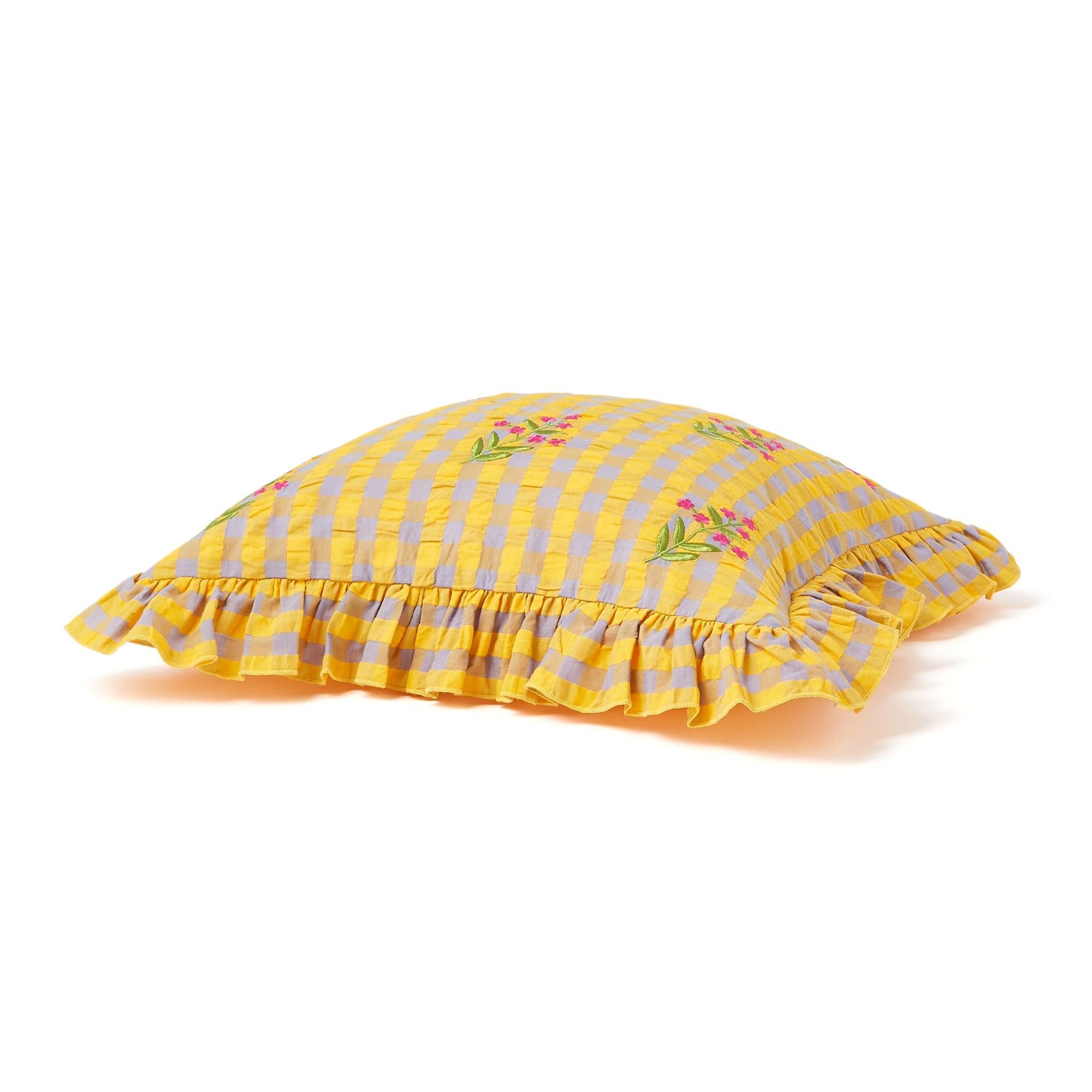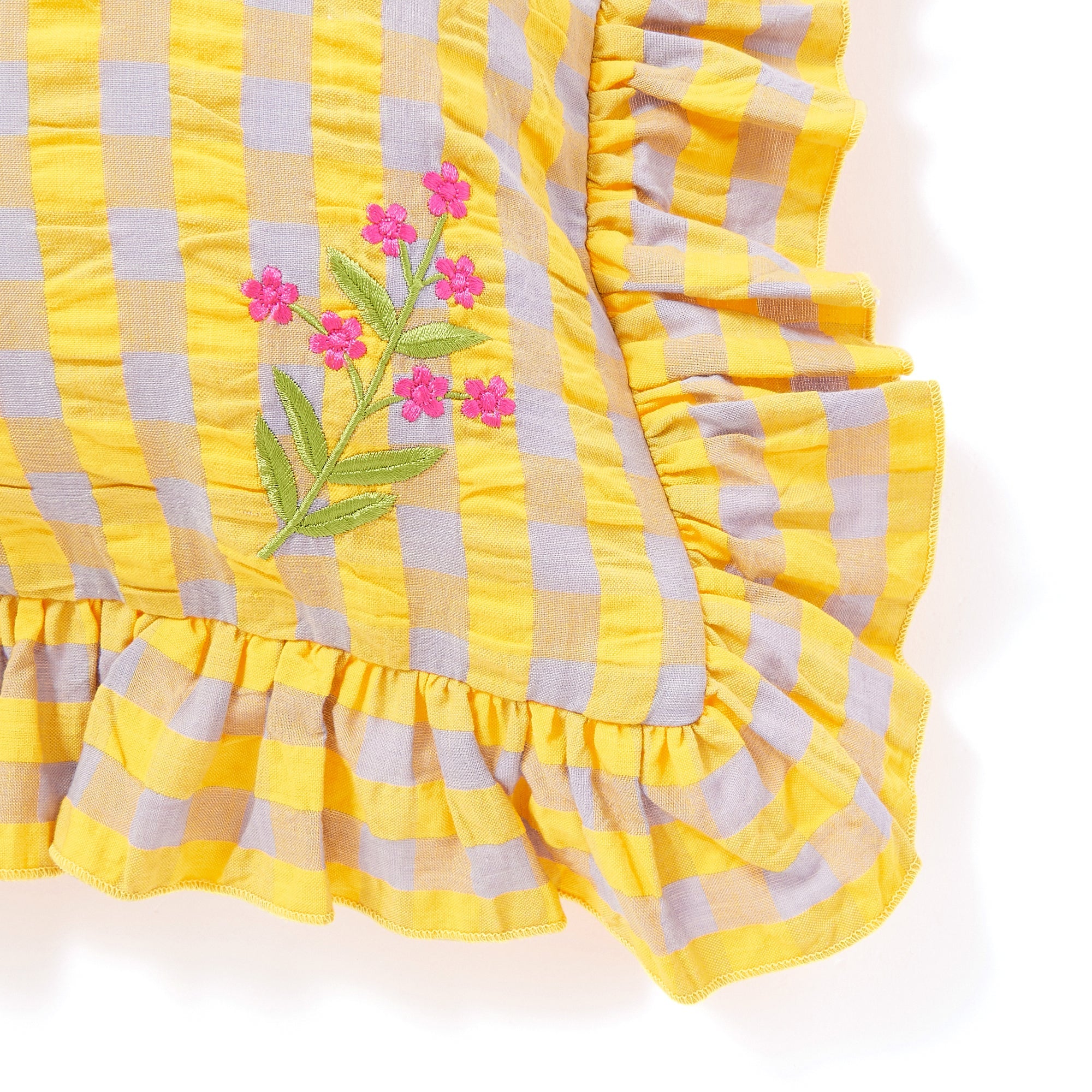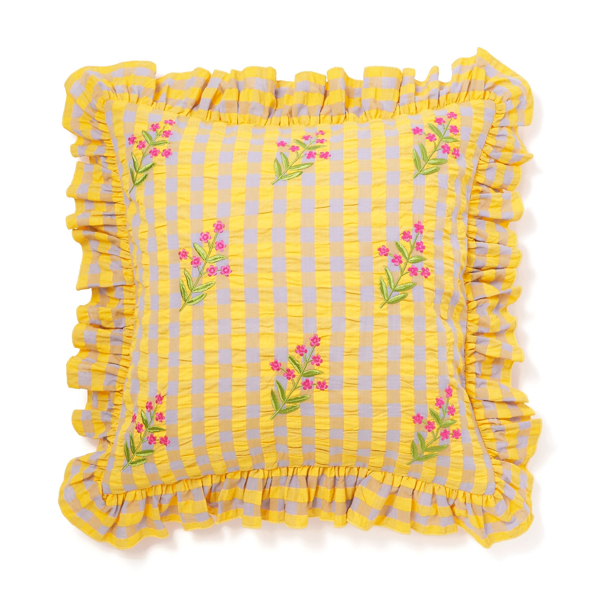 ギンガムチェック柄のシアサッカー生地にお花の刺繍をあしらったトレンド感たっぷりのクッションカバーです。贅沢なフリルがデザインを引き立て、キュートさと爽やかさがバランスよく入り混じったデザインです。