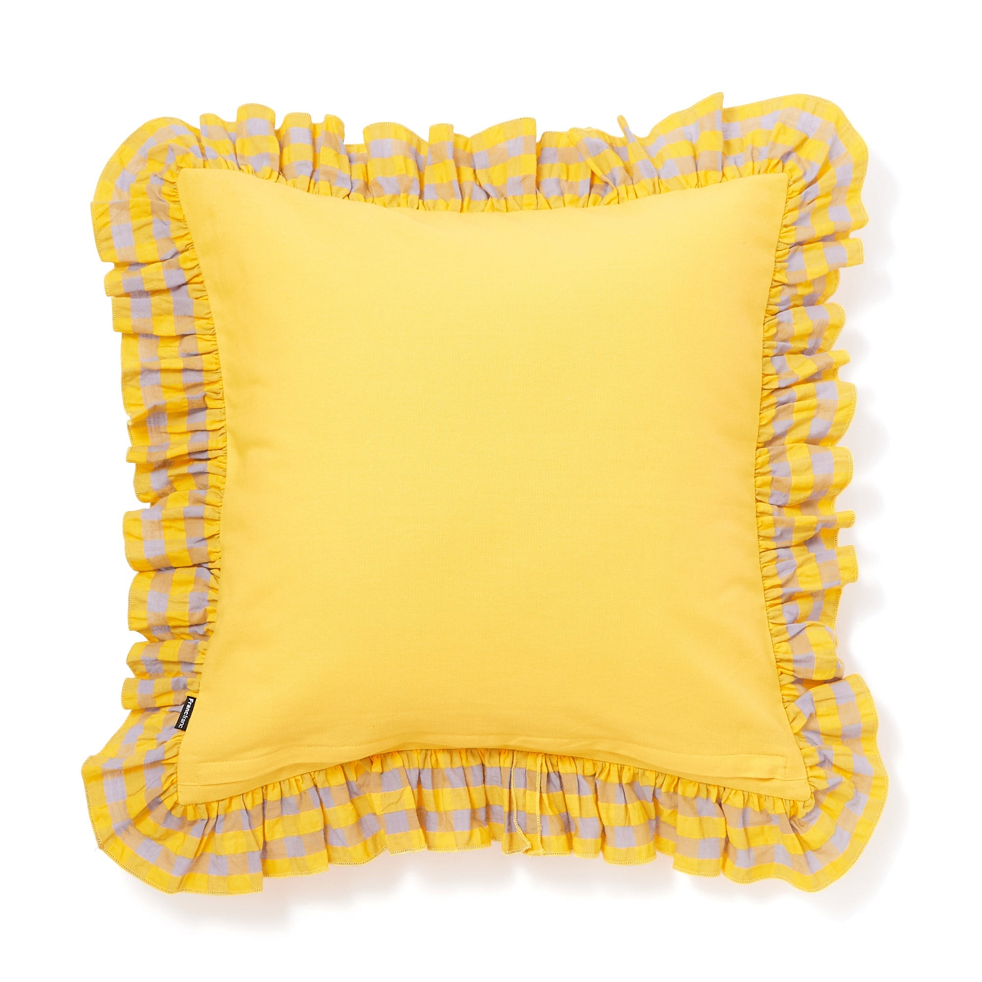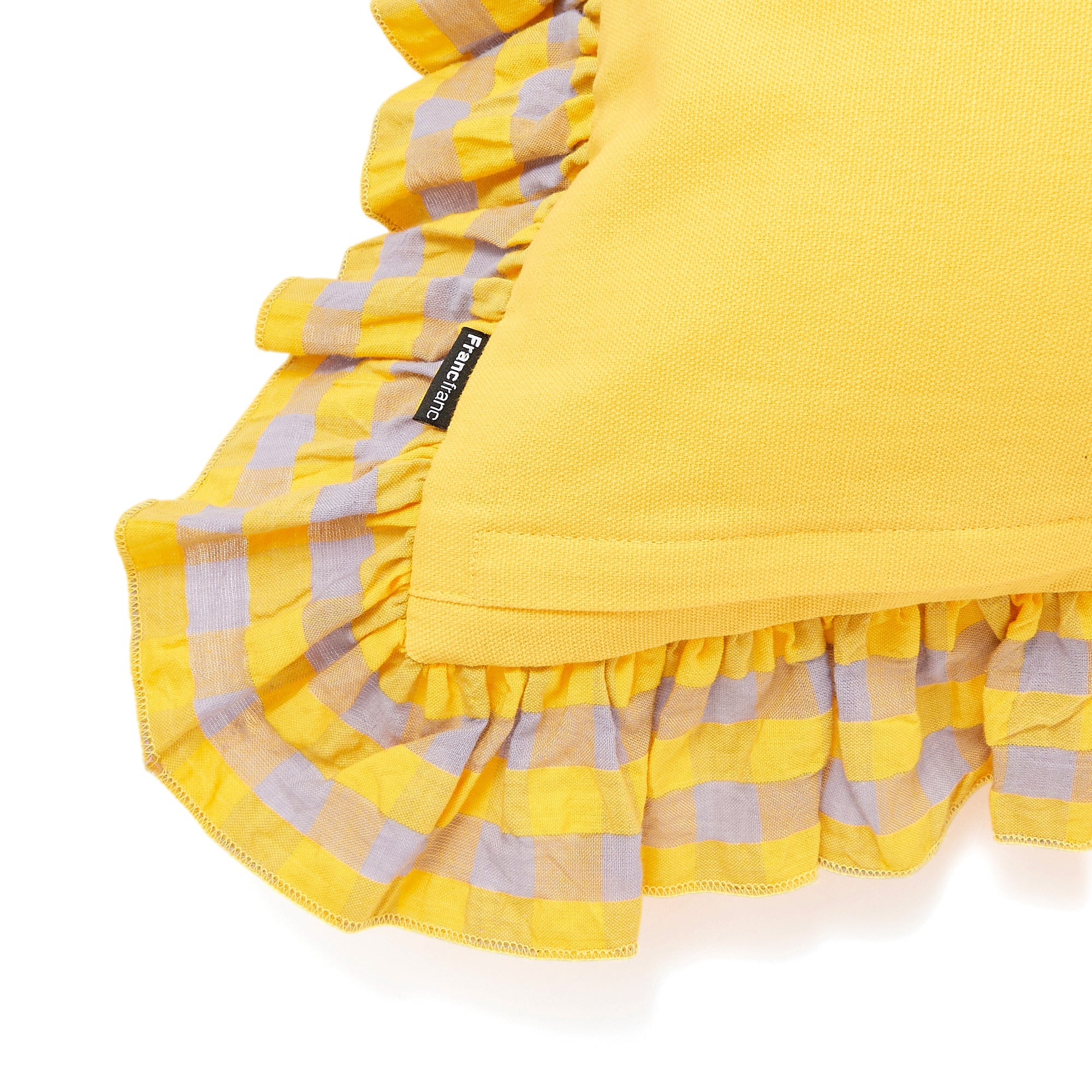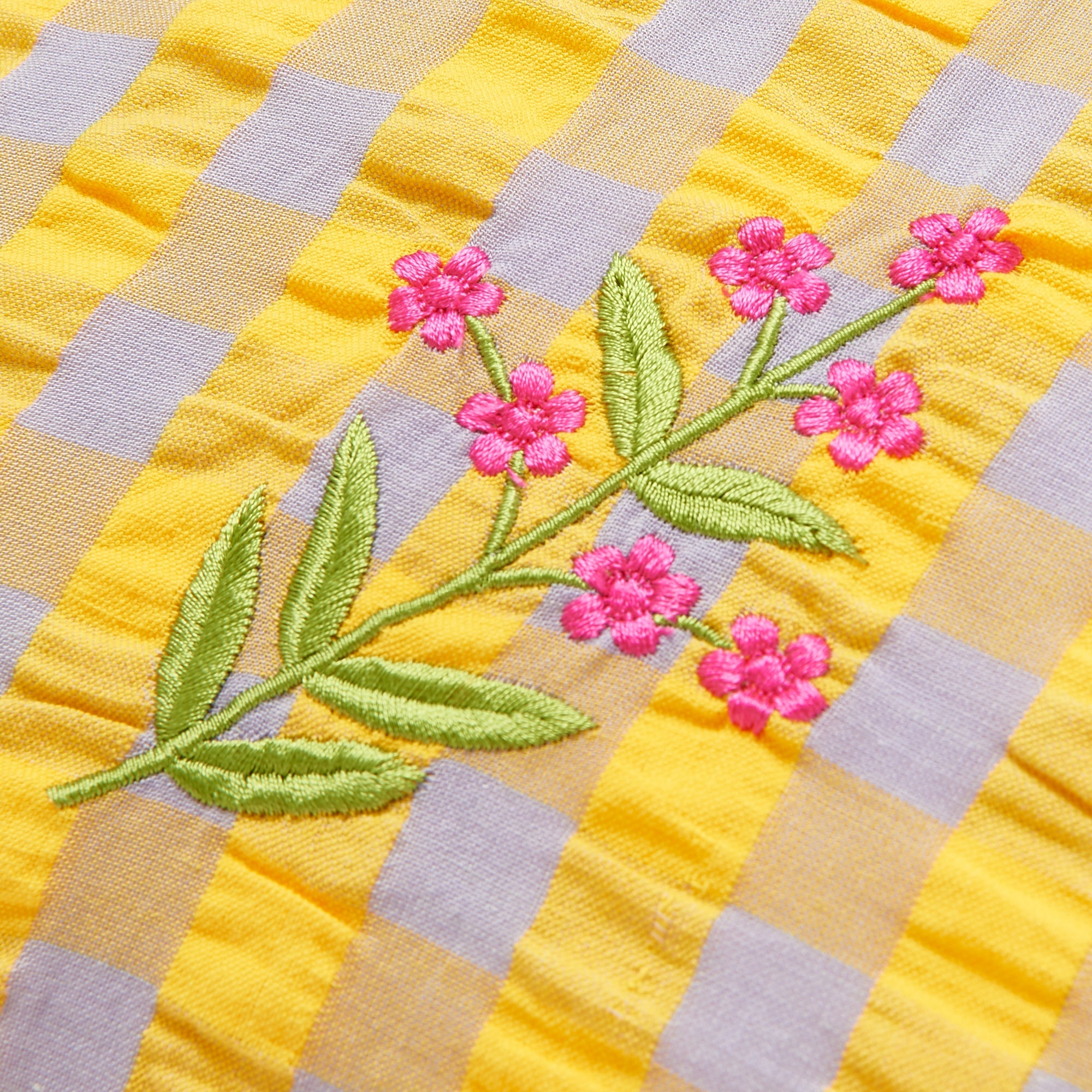 ギンガムチェック柄のシアサッカー生地にお花の刺繍をあしらったトレンド感たっぷりのクッションカバーです。贅沢なフリルがデザインを引き立て、キュートさと爽やかさがバランスよく入り混じったデザインです。