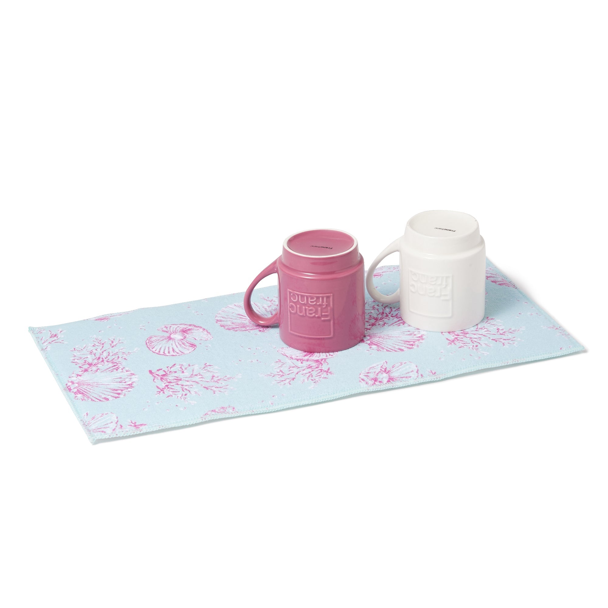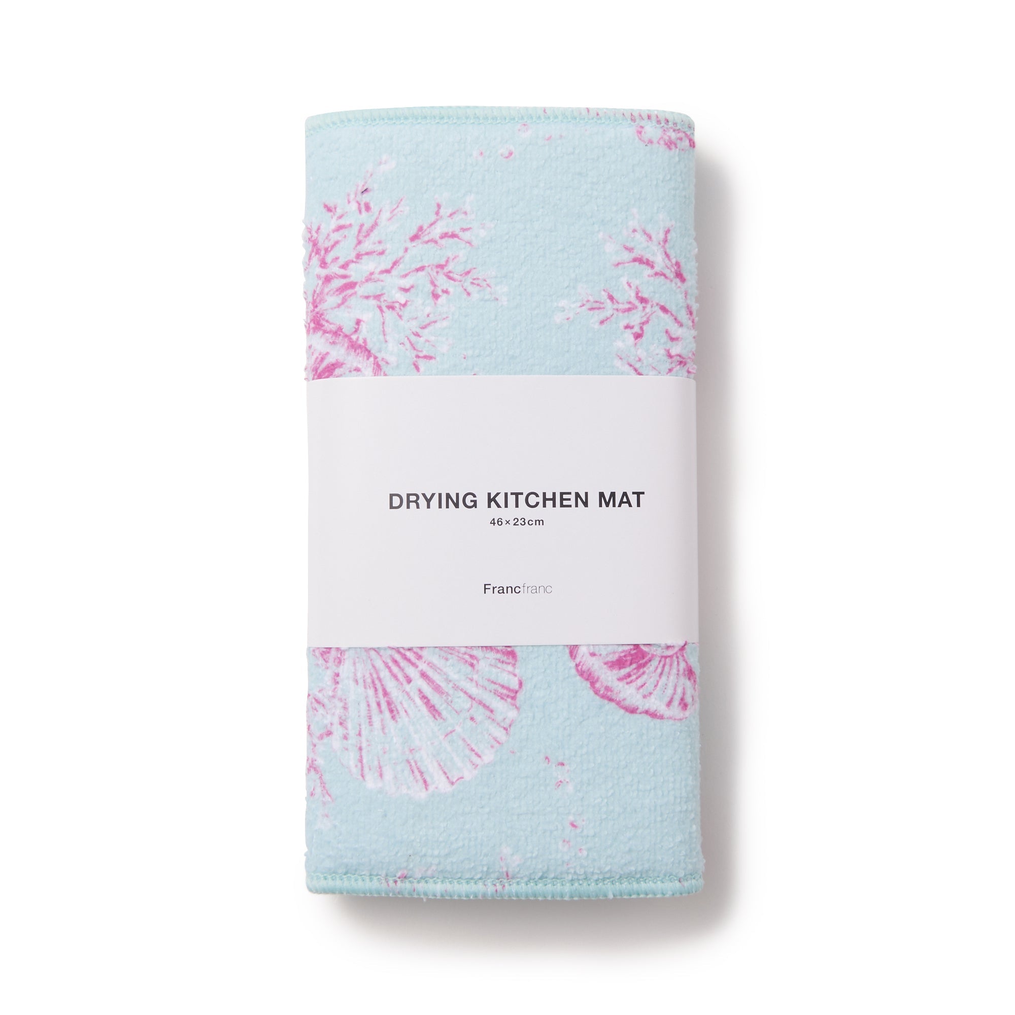 人気のドライングマットにシェル柄が登場です。一枚敷くだけで華やかなキッチンになります。さわやかなグリーンとシェルの組み合わせがキュートなデザインです。かわいいアイテムや海のアイテムが好きな方におすすめ。マットに合わせ、キッチンまわりをシェルアイテムでそろえるのもいいですね。海の中にいるようなおしゃれなコーディネートになります。エレガントさが欲しい方は、ゴールドやピンクゴールドのアイテムをプラスすると大人かわいい印象になるのでお試しください。ドライマットは、ディッシュラックを置けない一人暮らしのキッチンに最適のアイテムです。キッチンの広さや洗い物の量に合わせ、マットの大きさを調整できます。使わない時はしまっておけるので便利です。しっかりと水を吸収するので、排水の手間がかかりません。洗濯ができるので、手入れも楽ちん。同じシリーズには、ピンクもあります。ラブリーなピンクとシェル柄が特徴です。洗い替え用として、複数購入しておくのもいいですね。リーズナブルな価格も魅力です。キッチンアイテムがかわいいと、毎日の家事が楽しくなりますね。シェルアイテムを使って、お気に入りのキッチン空間を作りましょう。
