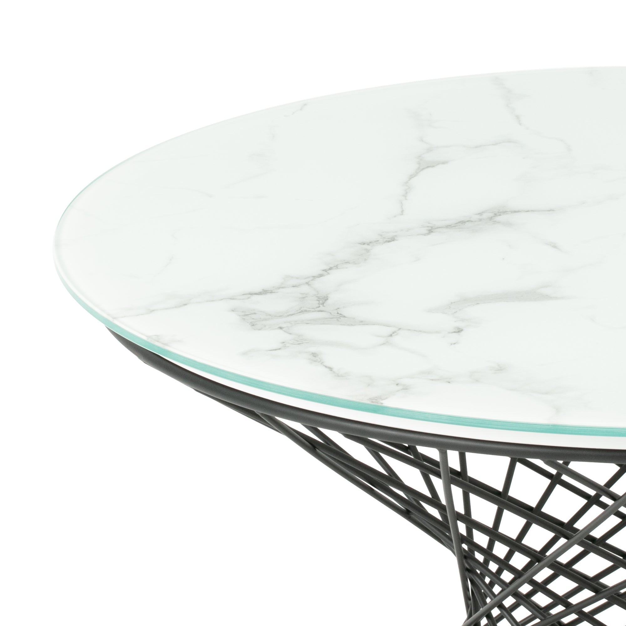 人気のマーリアシリーズに高級感漂う大理石模様の天板タイプが登場。見る人の視点によって大胆に表情を変えるコーヒーテーブルです。複雑に編み込まれた脚部が繊細で高級感たっぷり。テーブルとの距離や角度によって様々に表情を変え、空間に心地よいリズムを生み出します。天板と脚部の組み合わせを自由に選ぶことができるのも大きな特徴です。新色の大理石タイプはトレンド感満載で、インテリアを手軽にアップデートできるデザイン。クリアの天板はフレームの色が際立ちすっきりとスマートに。ブラックの天板ならば存在感たっぷりのモダンな雰囲気が楽しめます。脚部はホワイト、ブラック、ゴールドの3タイプ。自分だけのベストな組み合わせがきっと見つかります。天板はフレームにしっかり固定できるので安心です。また、円形テーブルは生活動線を妨げにくいので、限られたスペースに置いても邪魔になりにくいのもうれしいところです。編み込まれた脚部中央のスペースを生かして、中にアートフラワーやオブジェを飾るのもおすすめ。鳥のオブジェを飾って鳥かごのようなイメージを演出したり、フレームにお気に入りのチャームを取り付けて自分らしくアレンジしたり。世界にひとつだけのオリジナリティ溢れるコーディネートをお楽しみいただけます。