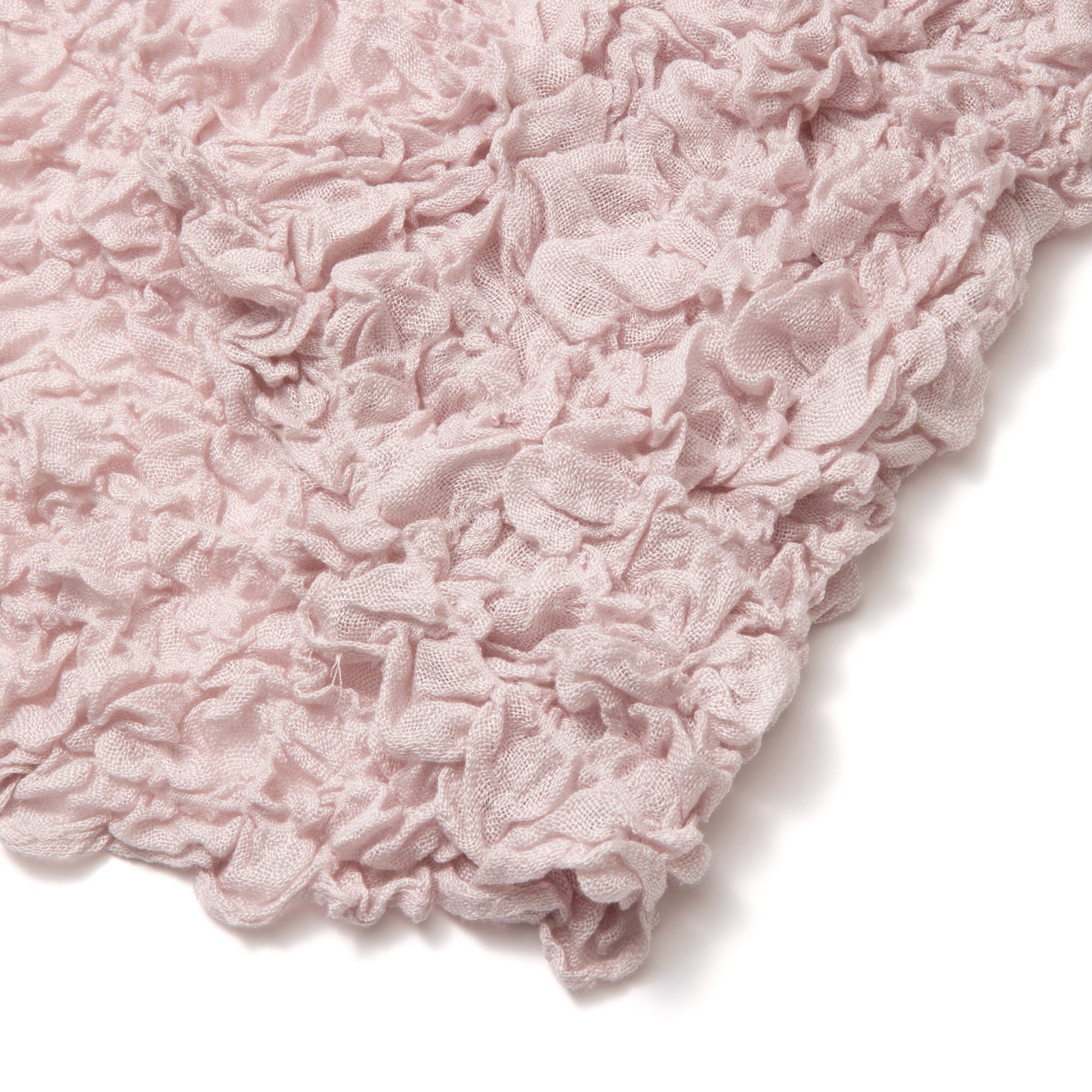 くしゅくしゅとした素材感がかわいらしいスロー(ひざ掛け)です。ふかふかでボリューム感のあるデザインです。伸縮性のある糸を織り込むことで立体的で印象深いテクスチャーを表現しました。トレンド感のあるナチュラルなコーディネートが楽しめます。