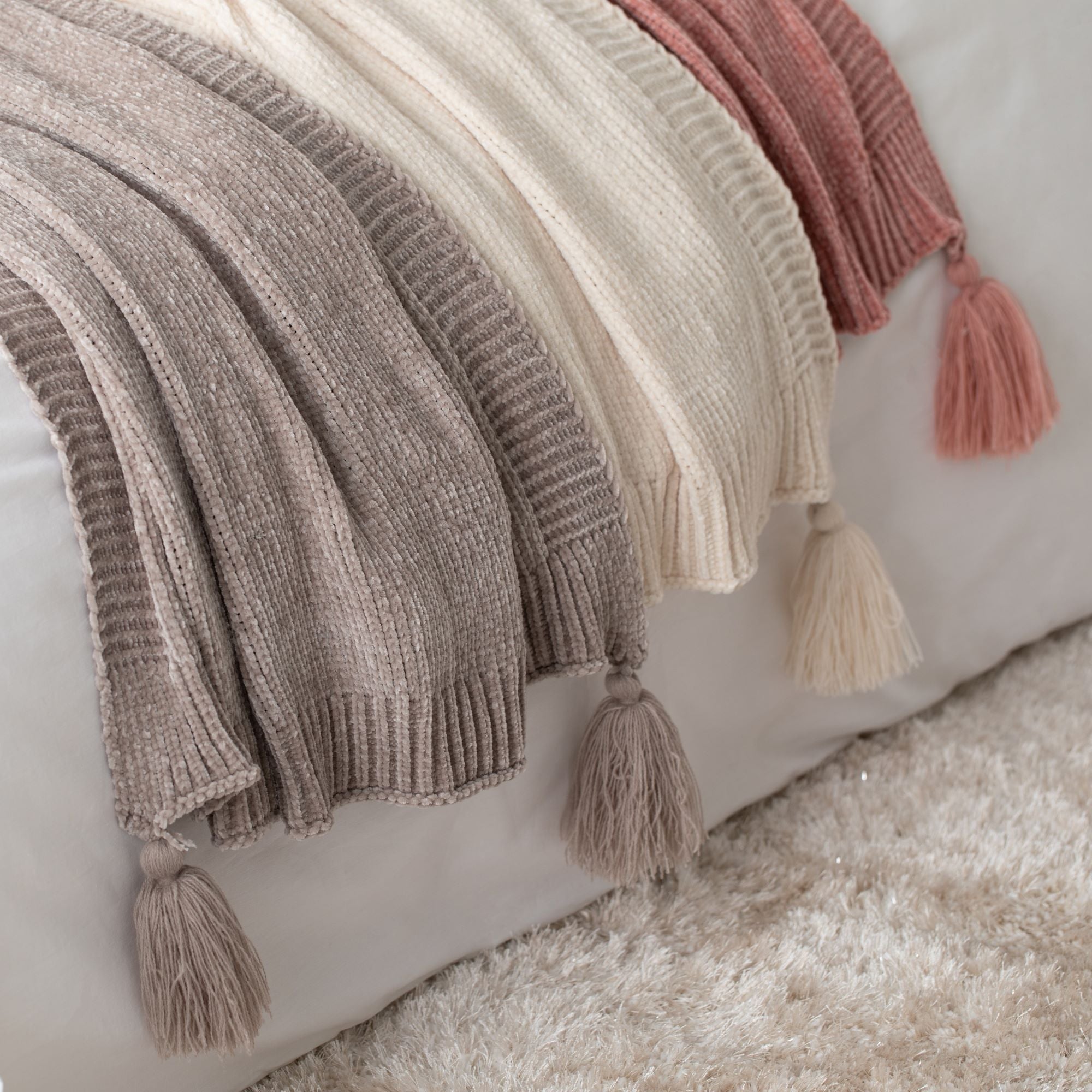 光沢のあるモール糸を編み上げた毎年人気の定番スローです。飽きのこないナチュラルなデザインを引き立てる大きめのタッセルがポイントです。空気をはらんでふんわりと柔らかく、滑らかな肌触りが楽しめます。薄手で軽やかな素材感なので冬だけでなく季節を問わず大活躍。ご自宅でのご使用はもちろん、持ち運びやすいのでオフィスや車の中でも気軽にお使いいただけます。