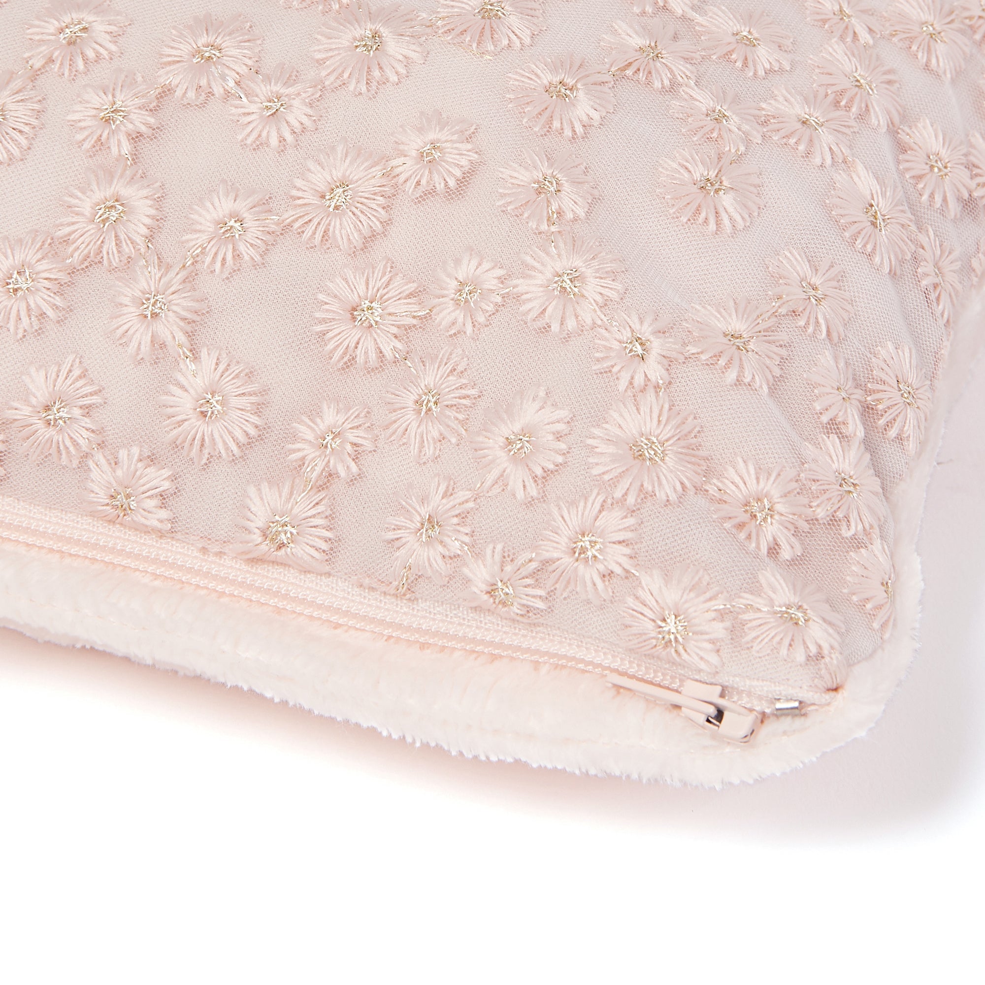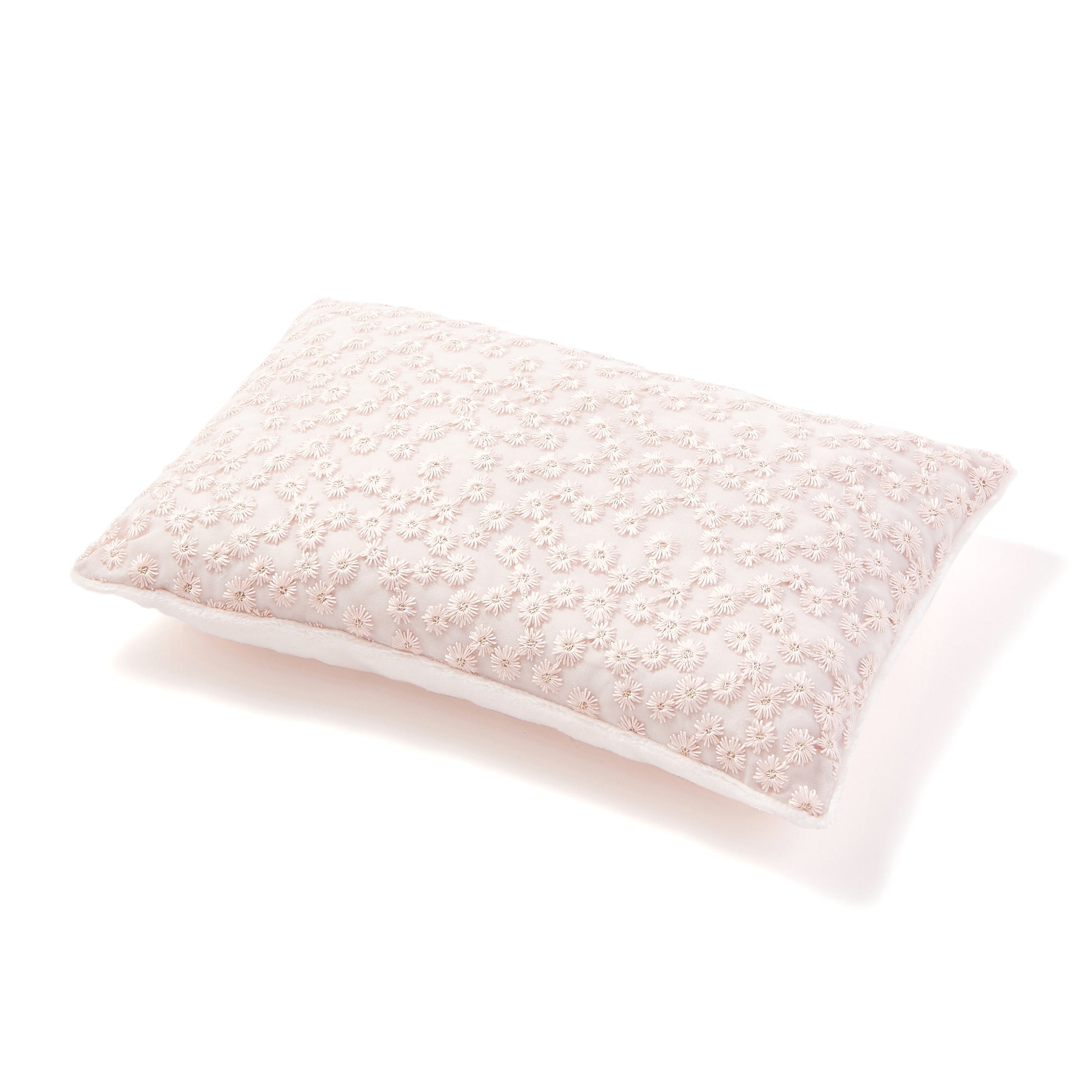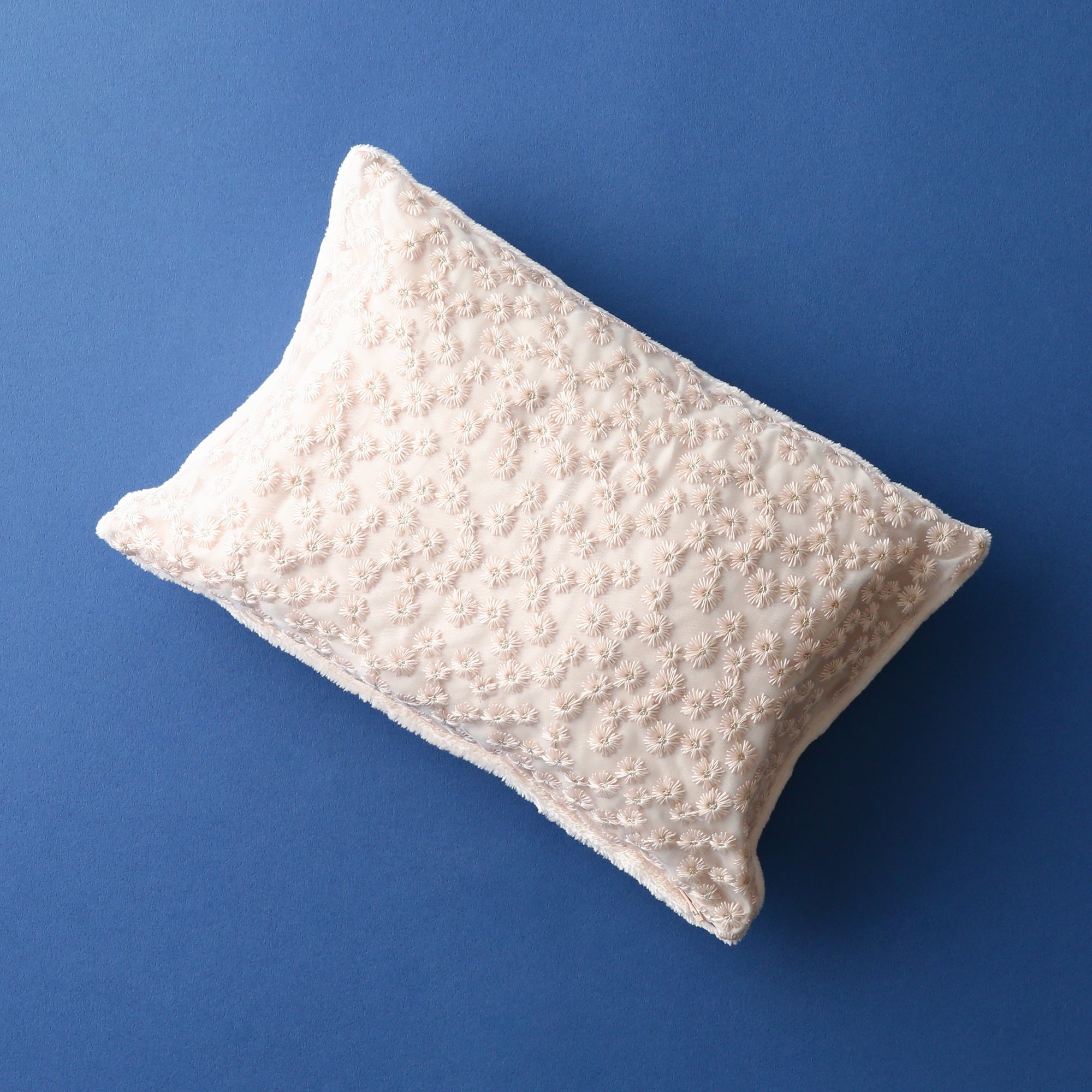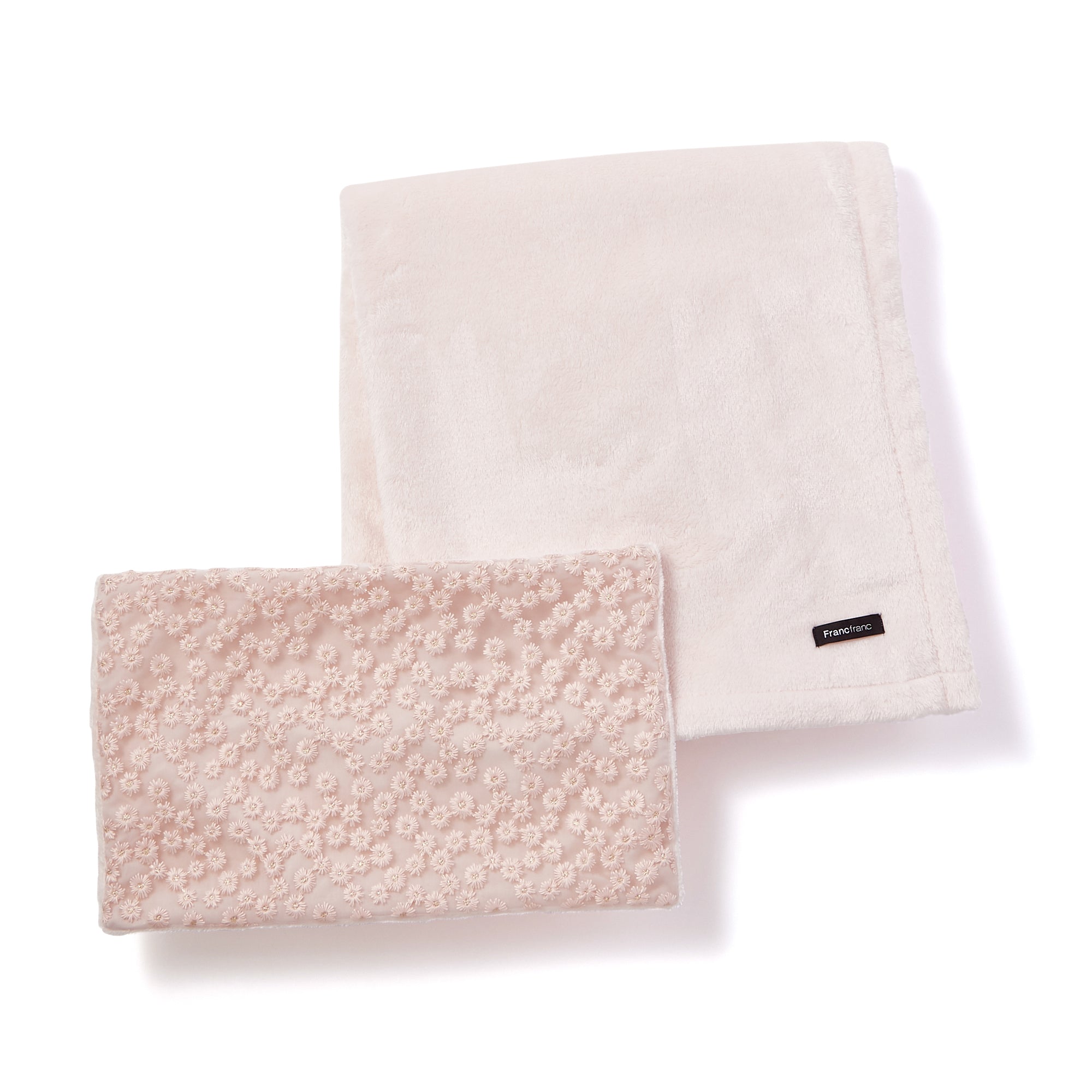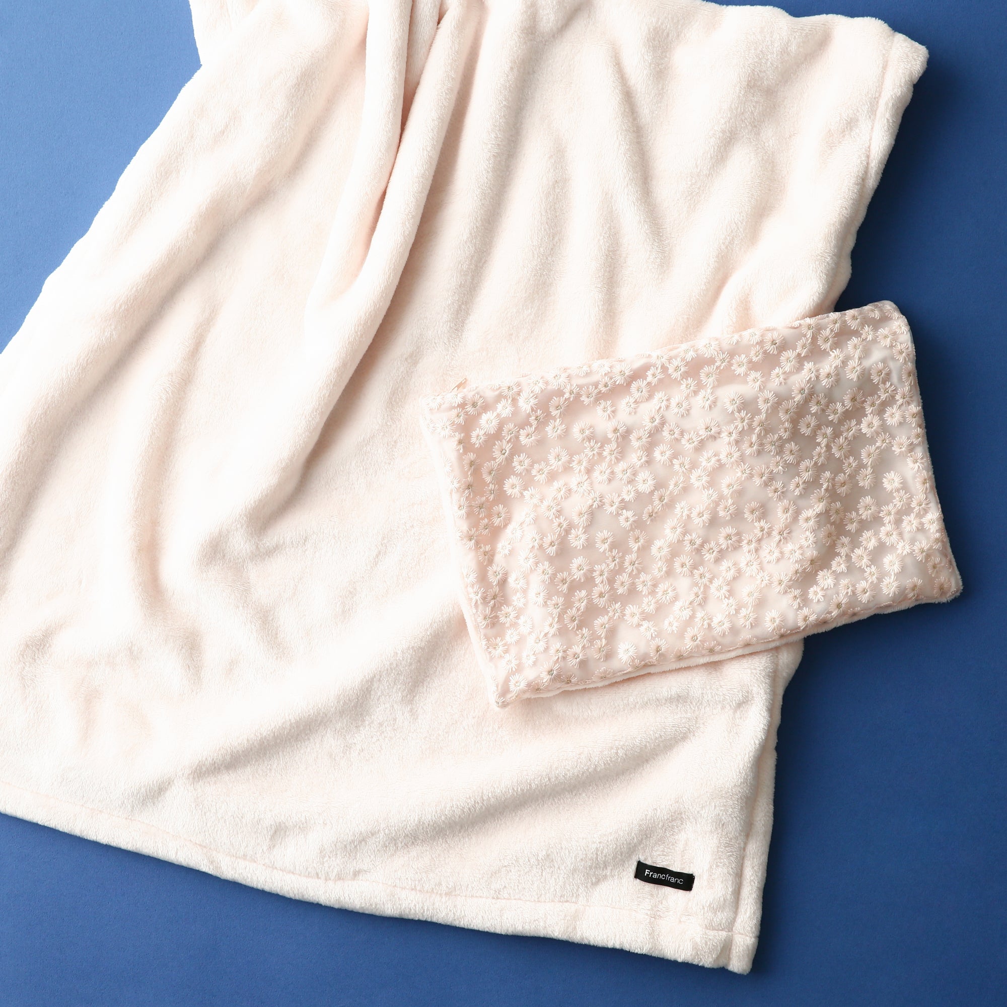 繊細な刺繍を施した華やかなポーチ入りスロー(ひざ掛け)です。コンパクトで持ち運びしやすく、車内やオフィスなどおうちの外でも大活躍。スローをポーチに入れた状態でクッションとして使用することもできます。