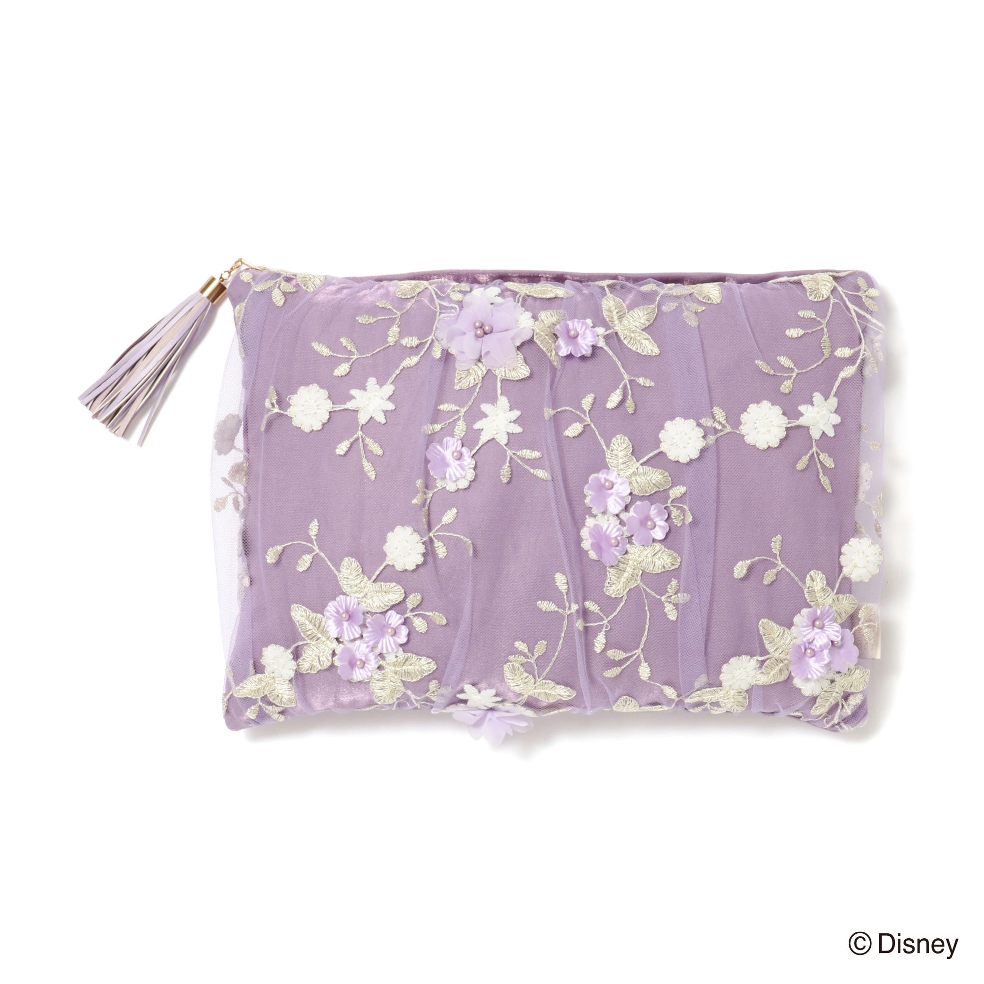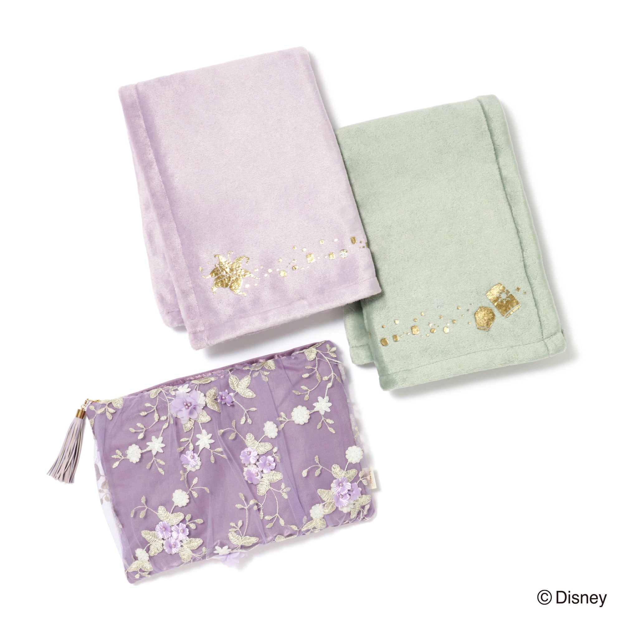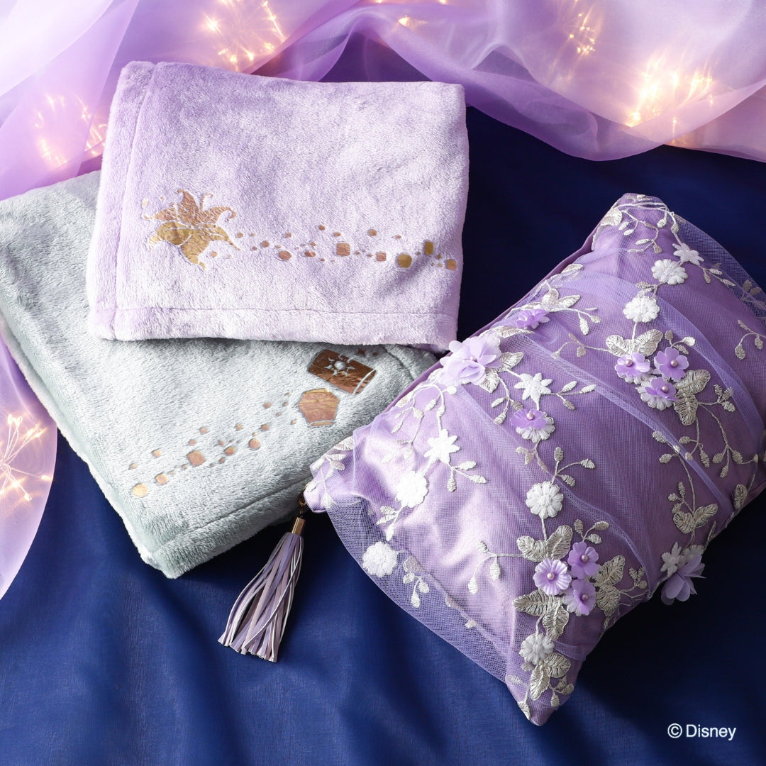 「MAGIC of CHEMISTRY」 5つのディズニー作品からインスパイアされた「MAGIC of CHEMISTRY(マジック オブ ケミストリー)」シリーズ。 親友、相棒、大切な家族、そして運命の人。特別な二人が出会い、日常に魔法がかかる瞬間の心の高鳴りを、Francfrancならではのデザインでお届けします。 大切な誰かとお揃いで使える、『塔の上のラプンツェル』のペアスローです。 スローが2枚収納できるポーチには「ラプンツェル」をイメージしたチュール生地を使用。「フリン」の身に付けている皮製品をイメージしたタッセルのチャームがポイントです。 柔らかなフランネル生地のスローには物語のキーとなるモチーフの箔プリントを施しました。