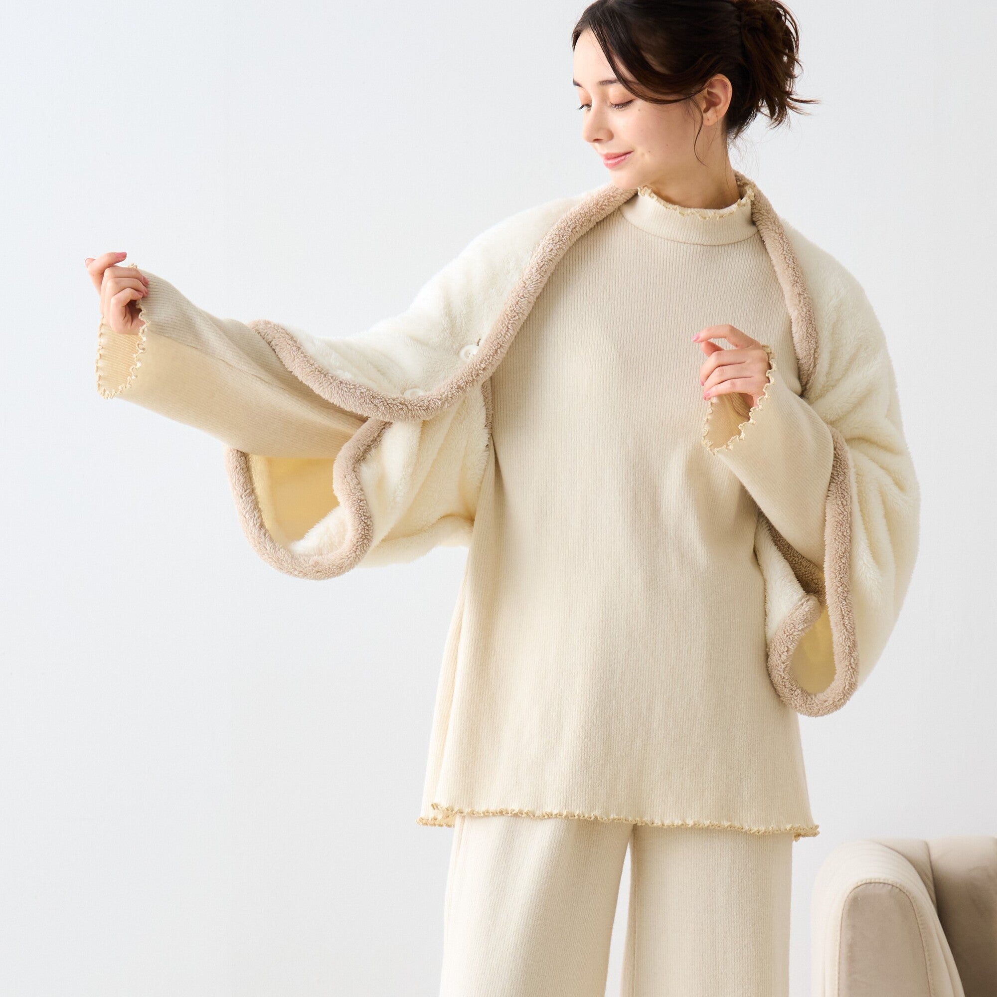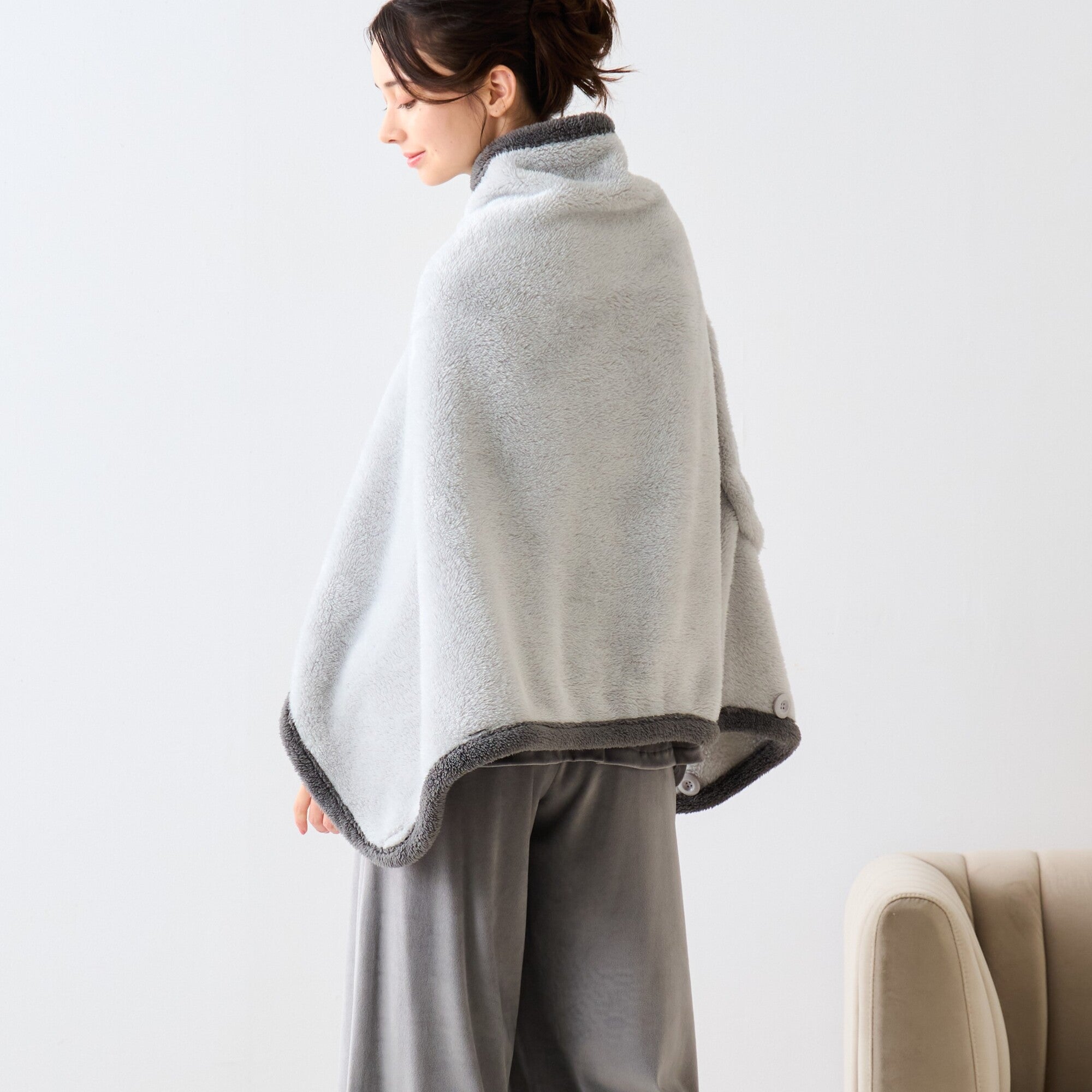 柔らかく保温性の高いフリース素材の4WAYポンチョです。 ポンチョ・ボレロ・巻きスカート・ブランケットと4通りの使い方ができます。 毛足が長いので、身体をを暖かく包み込んでくれます。 ふわふわで柔らかな肌触りが気持ちよく、起毛部分へ空気を溜め込むことにより熱を保持してくれるため、暖かく過ごせます。 洗濯可能でシワにもなりにくいです。 また軽い生地のため、長時間着ていても疲れにくいので、おうち時間に最適です。 冬場のちょっとしたギフトにもおすすめです。 ※静電気防止加工付き。