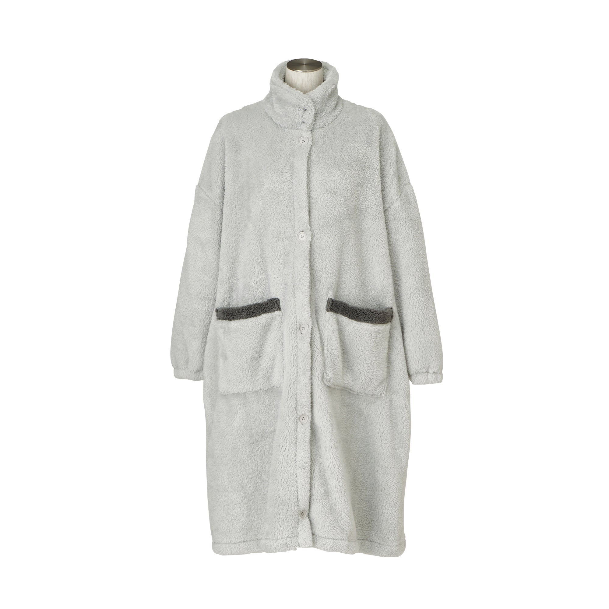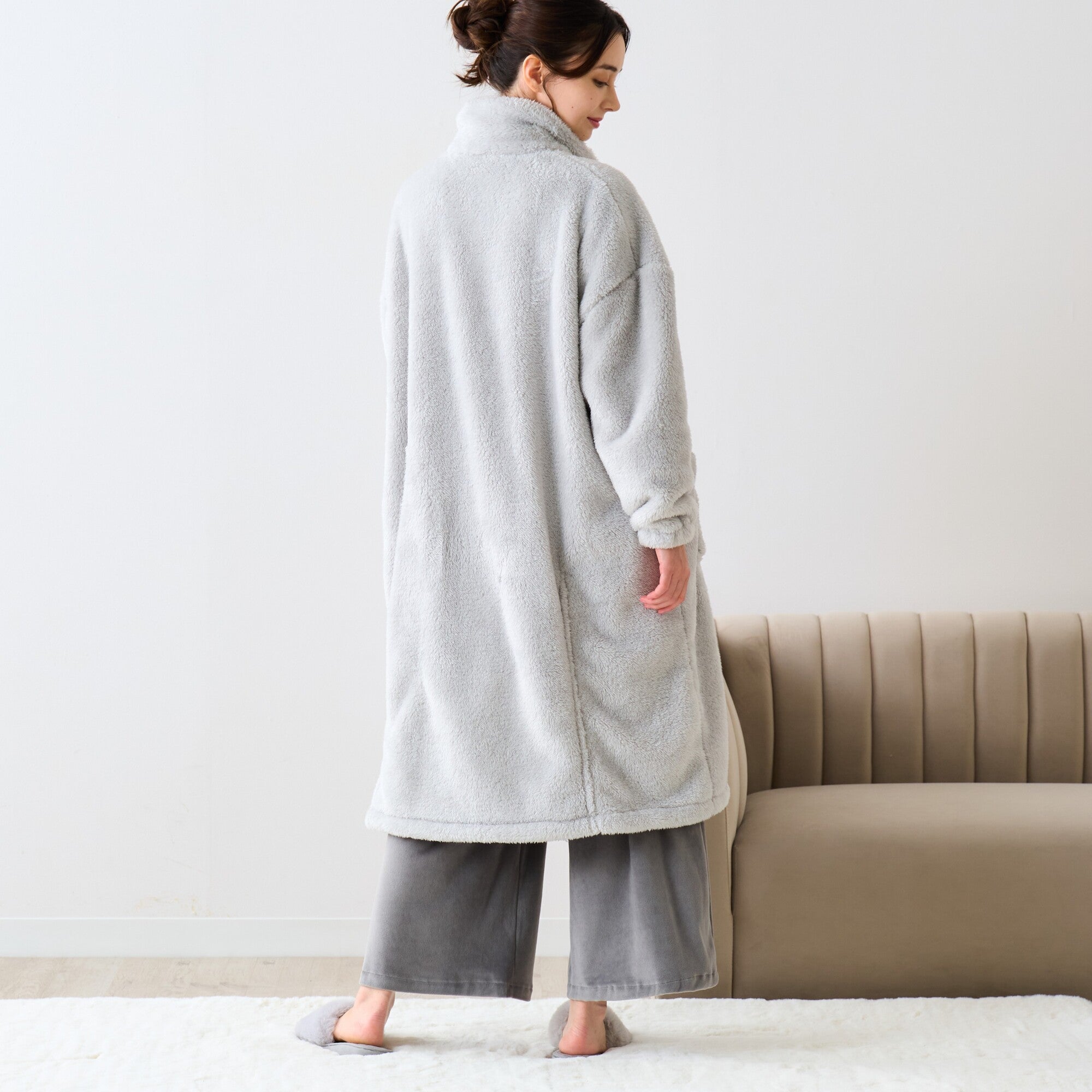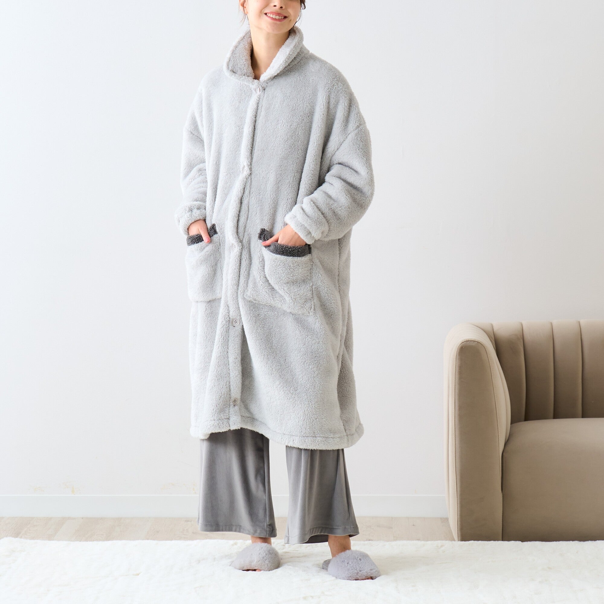 柔らかく保温性の高いフリース素材のブランケットローブです。 毛足が長く、ふわふわで柔らかな肌触りが気持ちよく、起毛部分へ空気を溜め込むことにより熱を保持してくれるため、暖かく過ごせます。 着丈105cmで動きやすくあったか。袖が二重構造になっており、冷気が入りにくいのも嬉しいポイントです。 使わない時は背中内側のポケットに収納するとクッションになるので置き場所に困らず便利です。 洗濯可能でシワにもなりにくいです。 また軽い生地のため、長時間着ていても疲れにくいのでおうち時間に最適です。 冬場のちょっとしたギフトにもおすすめです。 ※静電気防止加工付き。