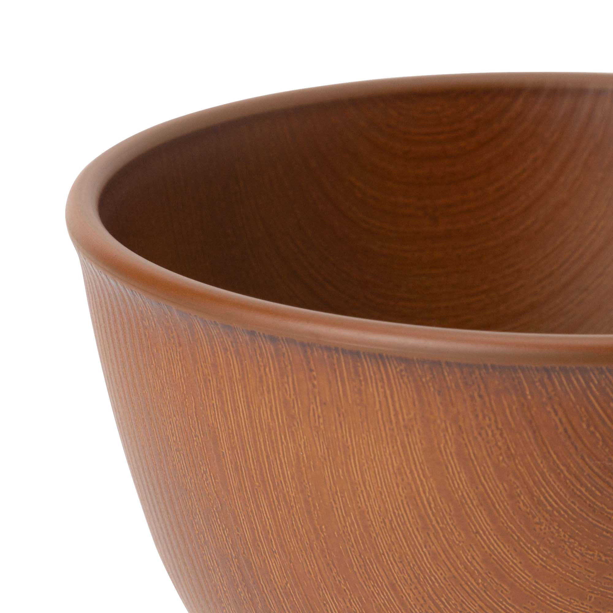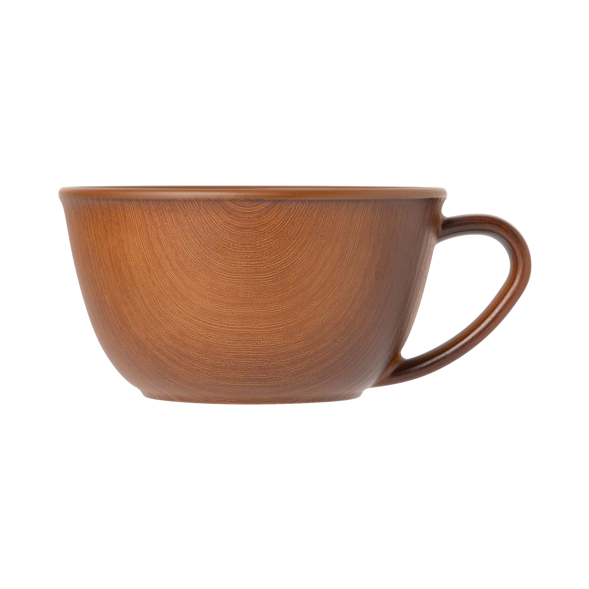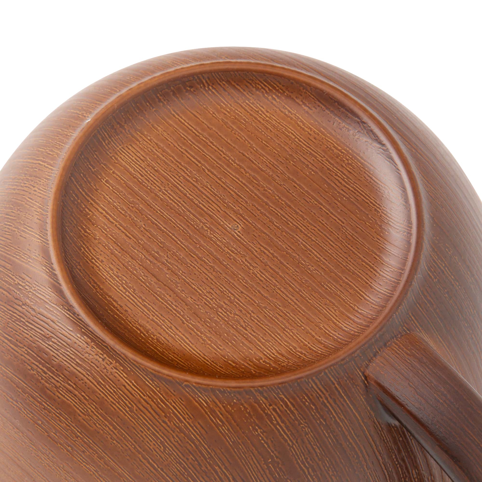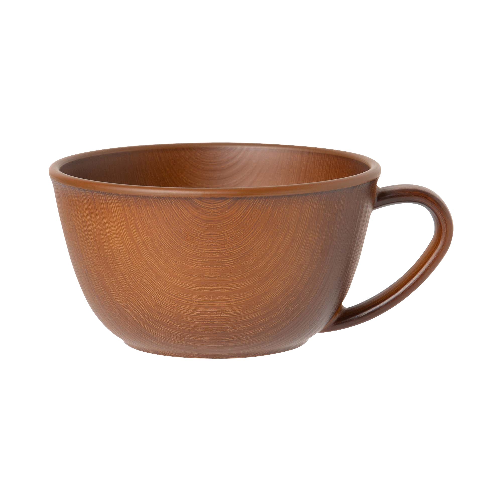 リアルな木の模様が美しいお手軽便利な樹脂製のスープマグです。日本製の上、軽くて割れにくいので安心してお使いいただけます。電子レンジも食器洗浄機も使えて、普段使いにぴったりです。食器の表面の木目模様は全て職人さんの手仕事です。技術の高い職人さんによりリアルな木目模様を施してもらいました。