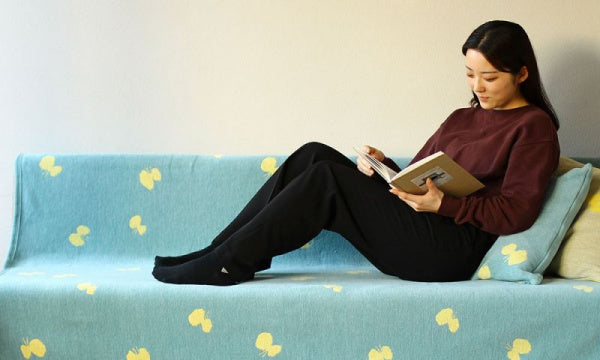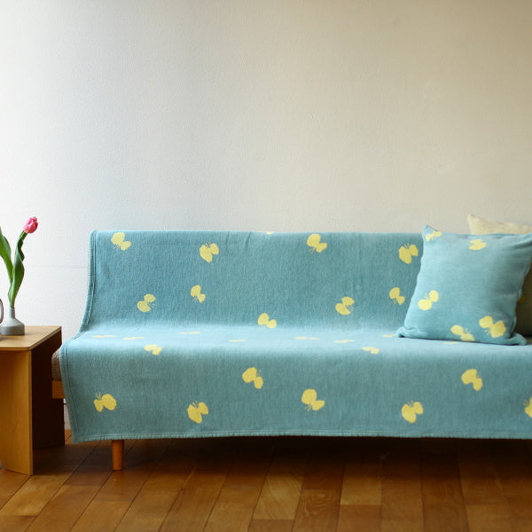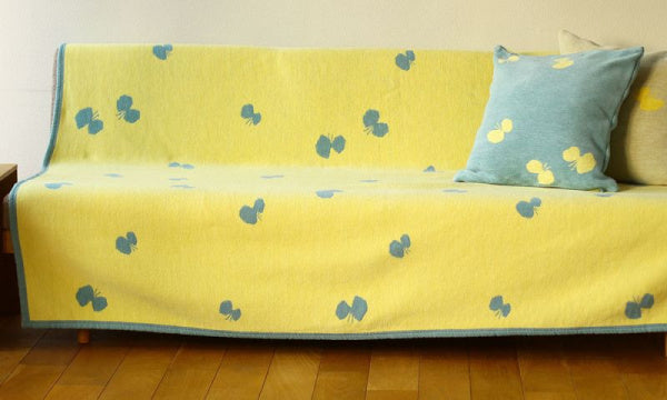 ミナ ペルホネンらしい蝶のデザインは、長く愛される定番柄。KLIPPAN×ミナ ペルホネンのコラボレーションがスタートした2013年以来、圧倒的な支持が続くロングセラーデザインです。2022年は爽やかな夏カラー「ブルー/イエロー」が新登場。清涼感たっぷりのカラーリングが魅力です。シュニールとはフランス語で、いもむしのこと。モールのように羽つきのシュニール糸を織って生まれるブランケットは極上の肌触りです。またシュニールコットンブランケットは、「ブランケット」の枠を超えて一年中使えるので衣替えは必要ありません。初夏はブランケット、ソファカバーとして、秋冬は贅沢にベッドシーツとして、また一年中フローリングの床に直接ひいて、ラグとしても活躍します。極上の肌触り、適度の重量、上質なデザインが、その活用範囲を広げています。シングルサイズの140×180cm大きさは、しまい込まずに毎日使える大きさです。※お洗濯により縮む場合があります。