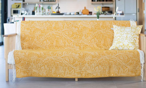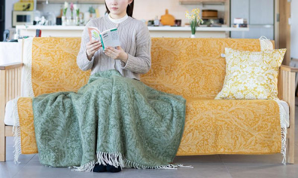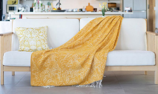 1886年に英国のウィリアム・モリスが創作したタイムレスなデザイン「アルカディア」を用いたスローです。このデザインは120年以上にわたり愛され続けており、サンザシの花と茎を優雅に描いています。1色使いでまとめられたデザインは、シンプルながらもエレガントな雰囲気でインテリアに自然な美しさを加え、どんな空間にも調和します。カシミヤとメリノウールの混紡素材を使用しており、スーパーソフトな肌触りが特徴です。ドビー織でふんわりと仕上げたウールスローはブランケットよりも約40%軽く、その柔らかな質感はカラダが喜ぶ心地よさ。空気の層が冬の冷気をシャットダウンし、軽いのに驚くほど温かいのが魅力です。※水洗い不可