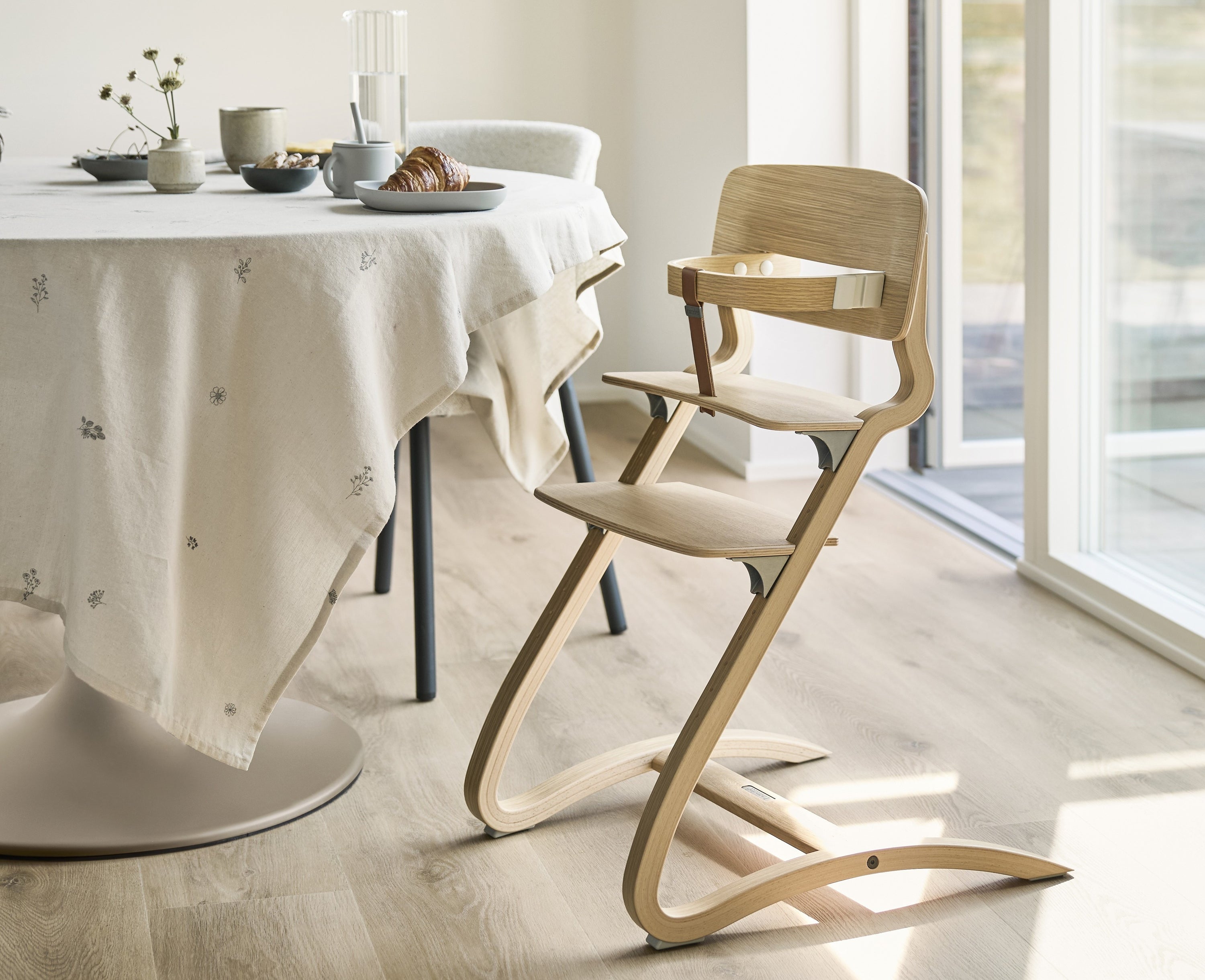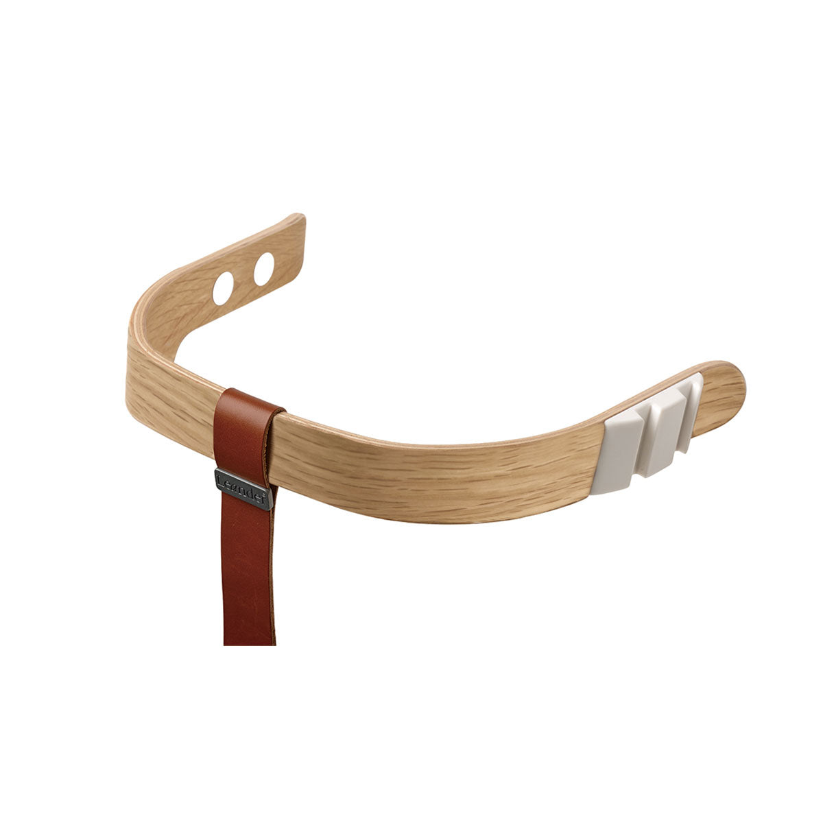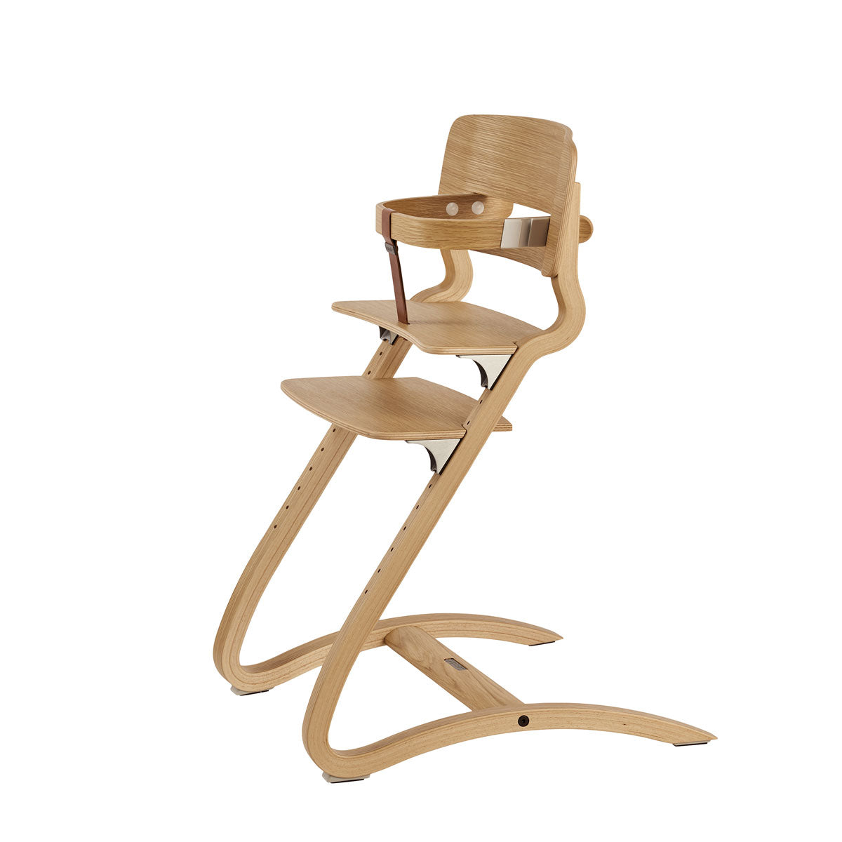 オーク材を使用したセーフティーバー。木目の美しいオーク材で、さらに高級感のある仕上がりになりました。セーフティーバーは6ヶ月~3歳頃まで使える、お子さま立ち上がり防止の安全バーです。本体とは別売りになるので、ハイチェア本体との組み合わせ次第で、おしゃれにコーディネートをすることも可能です。滑らかな曲線で構成され、前後にわずかに動くように設計されたリエンダー社のハイチェア。しなやかな材質を使用することで「しなり」が生じ、お母さんに抱っこされているような心地よさを与えます。重量は約5.3kg。一般的なベビーチェアに比べて少し軽量な作りですが、安定やフィット感は損なわず女性でも持ち運びしやすくなっています。背もたれと座面や足置き板の高さを細かいピッチで調整することができるので、日々成長していくお子さまでも快適な座り心地が継続するのは嬉しいポイント。一人のお子さまだけでなく、次へ、またその次へと世代を越えて受け継いでいくことができる椅子、それがリエンダー社のハイチェアです。
