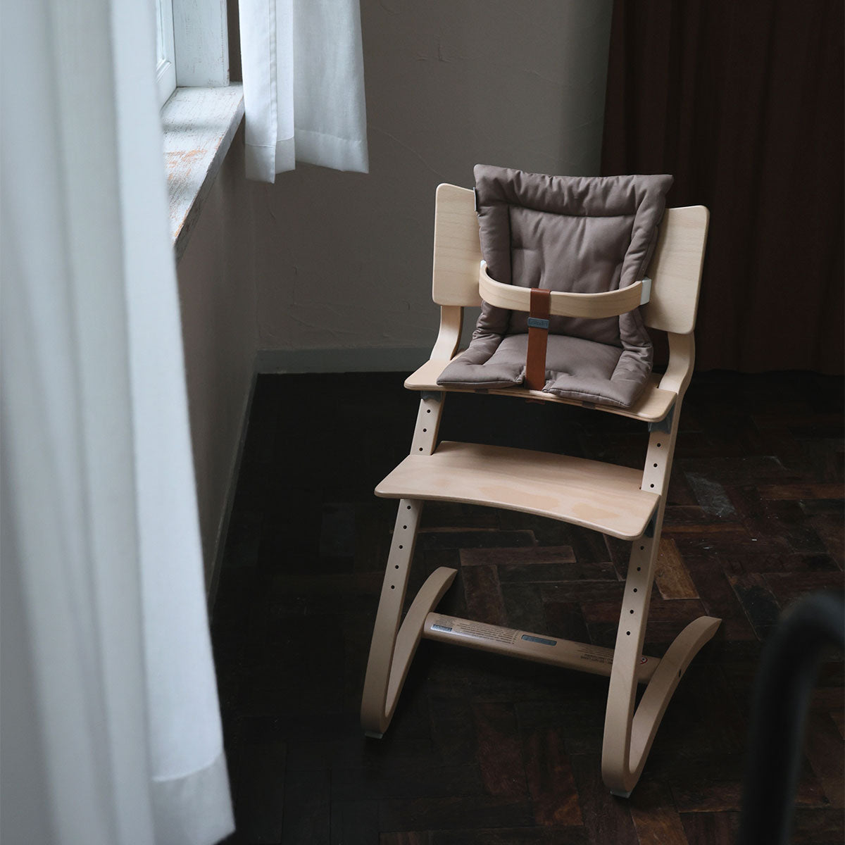 落ち着いたトーンのブラウンカラーのチェアクッション。オーガニックコットンを使用した、リエンダー ハイチェア専用のクッションです。クッションをチェアの上に敷くことでさらに心地よい座り心地となります。マジックテープでハイチェアに固定することができるので、お子さまが動きまわってもクッションが落ちることはありません。こちらはクッションのみとなり、イス本体は別売りとなりますのでご注意下さい。滑らかな曲線で構成され、前後にわずかに動くように設計されたリエンダー社のハイチェア。しなやかな材質を使用することで「しなり」が生じ、お母さんに抱っこされているような心地よさを与えます。重量は約5.3kg。一般的なベビーチェアに比べて少し軽量な作りですが、安定やフィット感は損なわず女性でも持ち運びしやすくなっています。背もたれと座面や足置き板の高さを細かいピッチで調整することができるので、日々成長していくお子さまでも快適な座り心地が継続するのは嬉しいポイント。一人のお子さまだけでなく、次へ、またその次へと世代を越えて受け継いでいくことができる椅子、それがリエンダー社のハイチェアです。