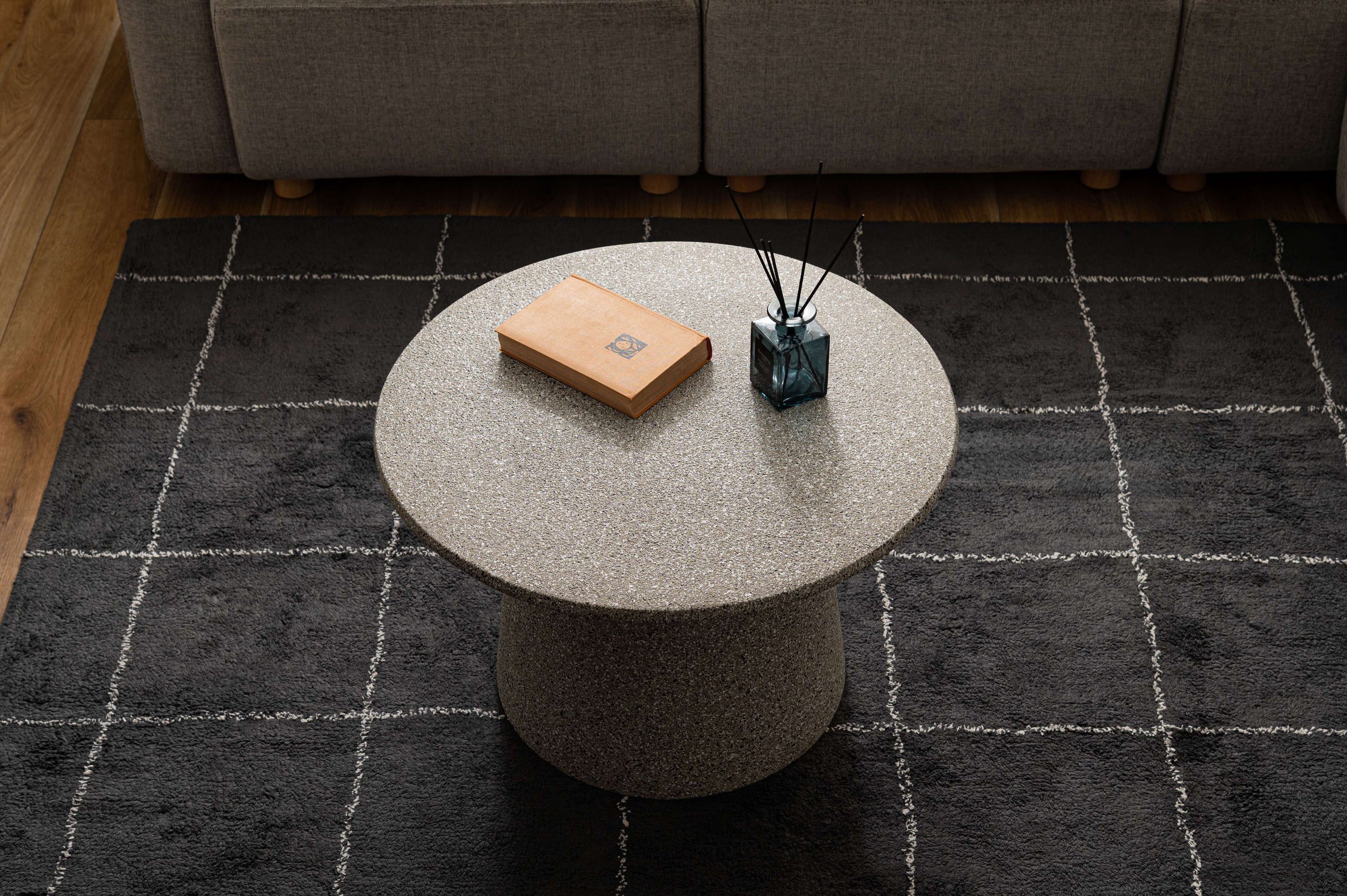 テラゾー柄が引き立てる上品なラウンドデザイン。洗練された印象をもたらす上品なラウンドテーブル。本物の石のようにざらりとしたシックなテラゾー柄が、空間にやさしい奥行きを加えます。丸みのある天板と安定感のある裾広がりのベースがバランスよくまとまり、上質で心地よいバランスを演出。様々なインテリアと相性よくなじみ、ディスプレイ台としても活躍します。単体ではもちろん、サイズ違いで並べればネストテーブルとしても使用できます。リビングテーブルとして。凹凸のある美しいテラゾー柄のデザイン。脚裏クッションシール付