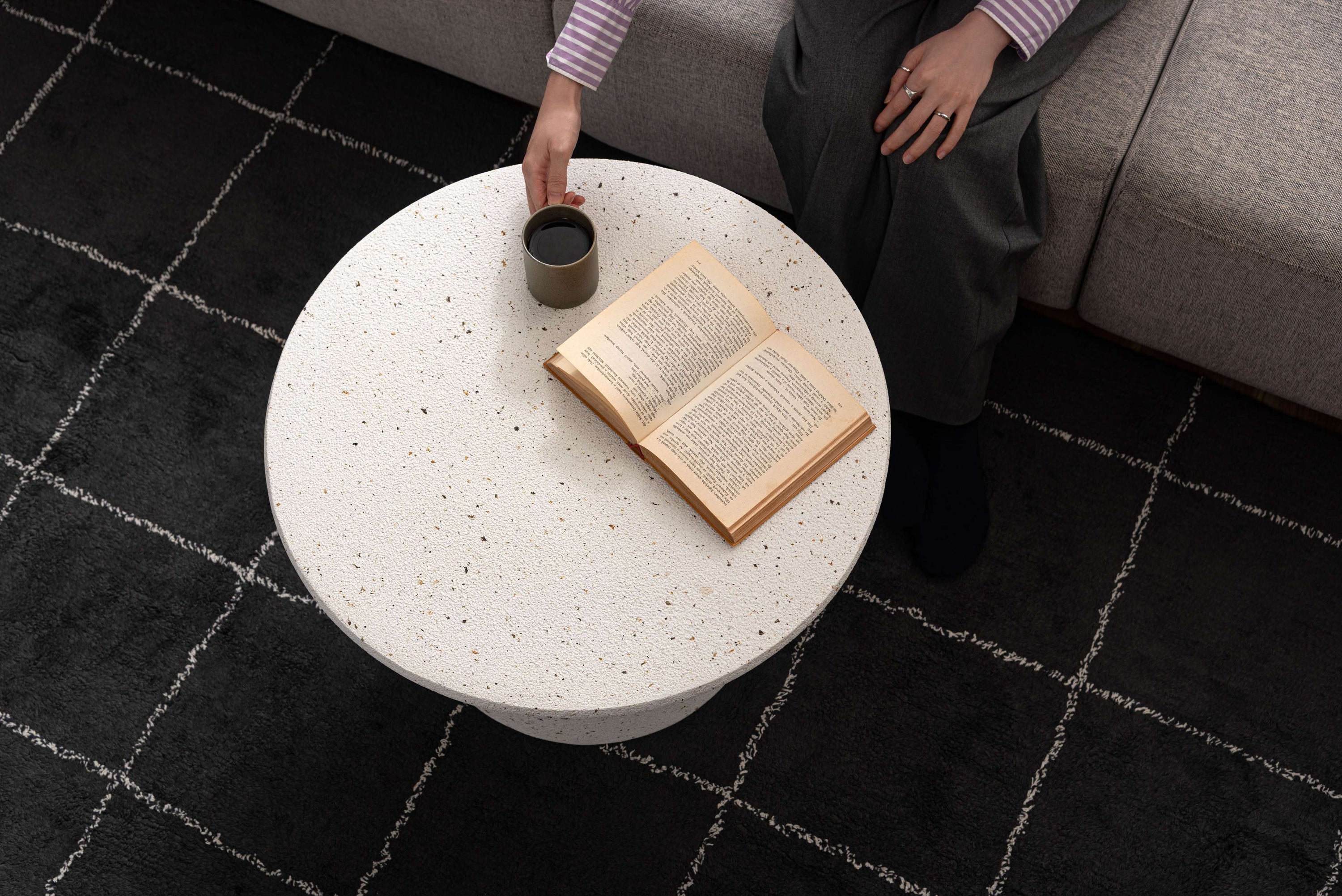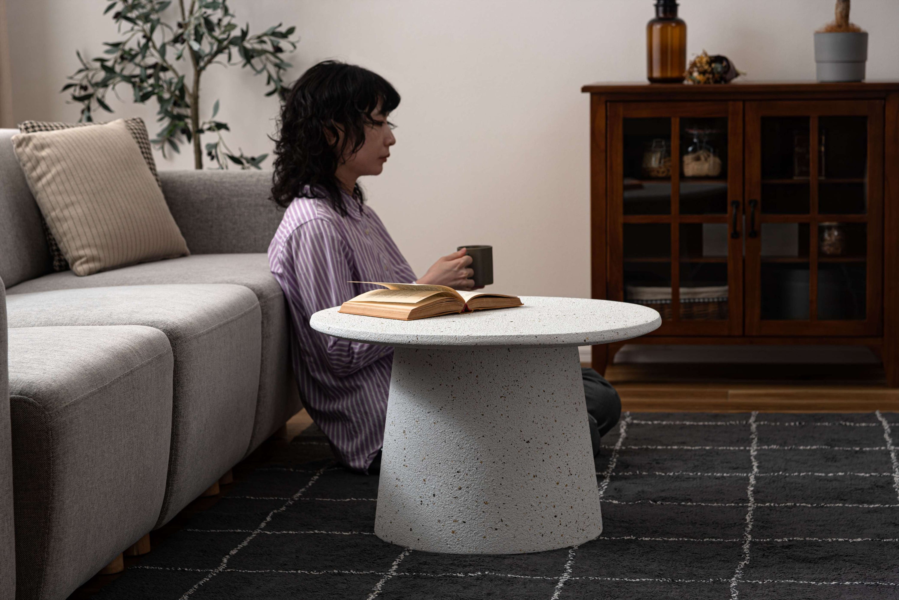テラゾー柄が引き立てる上品なラウンドデザイン。洗練された印象をもたらす上品なラウンドテーブル。本物の石のようにざらりとしたシックなテラゾー柄が、空間にやさしい奥行きを加えます。丸みのある天板と安定感のある裾広がりのベースがバランスよくまとまり、上質で心地よいバランスを演出。様々なインテリアと相性よくなじみ、ディスプレイ台としても活躍します。単体ではもちろん、サイズ違いで並べればネストテーブルとしても使用できます。リビングテーブルとして。凹凸のある美しいテラゾー柄のデザイン。脚裏クッションシール付