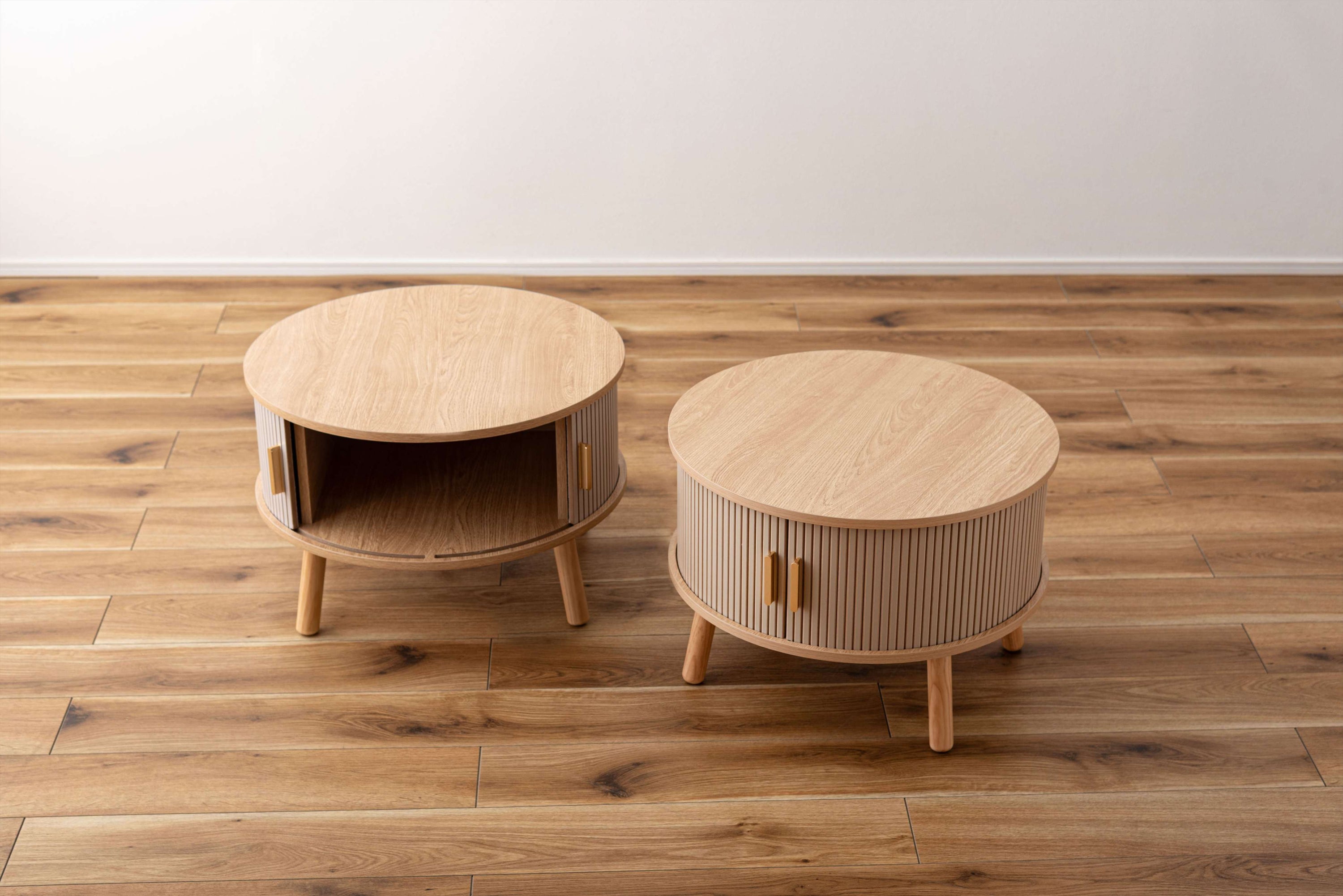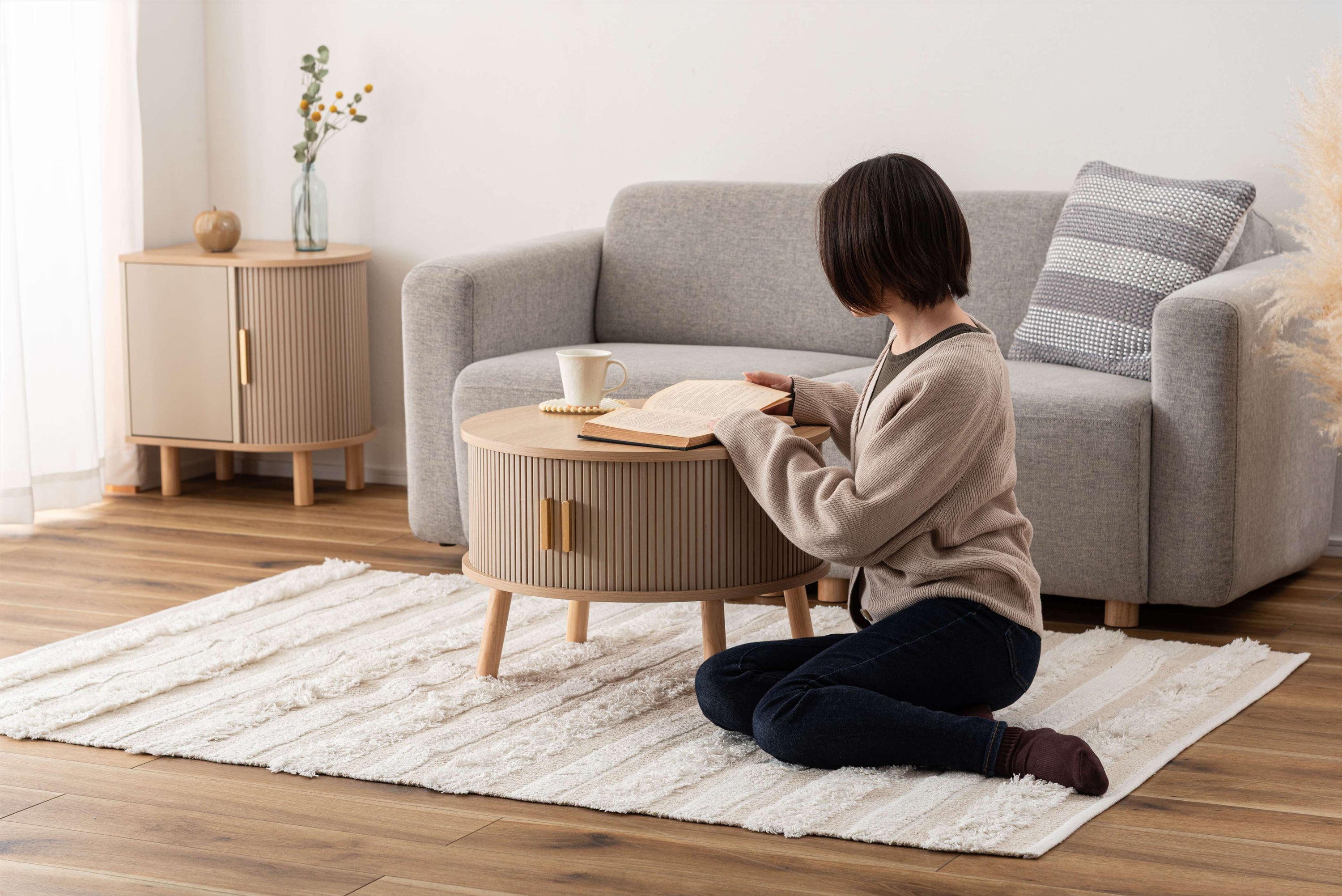 デザイン性と収納力を兼ね備えたセンターテーブル。やわらかな丸みを帯びたフォルムが、空間にやさしい印象を与えるセンターテーブル。木目の風合いを活かした天板とリブ状のスライド扉を組み合わせ、シンプルで奥行きのある佇まいを演出。落ち着きのある淡いカラーにアンティークゴールドの取っ手をアクセントとして添え、ナチュラルさの中にほどよい上品さをプラス。控えめながらも特徴のあるデザインで、さまざまなインテリアになじみます。すっきりとしたスライドオープン式扉。アクセントになるリブデザインのボディ。アンティークゴールドカラーの取っ手付。シリーズアイテムと組み合わせてレイアウト