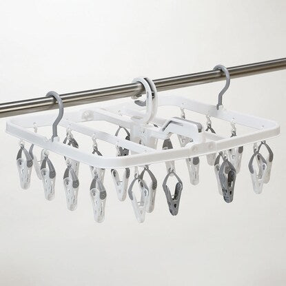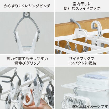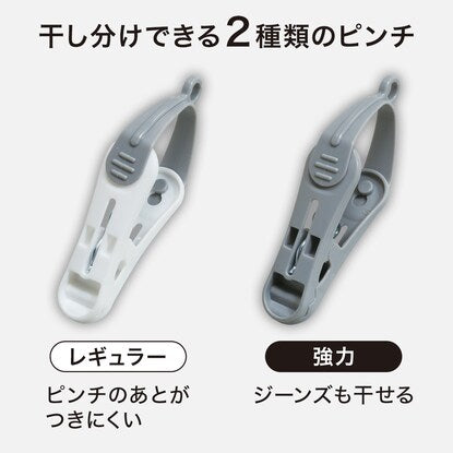 引っぱるだけで簡単に取り込める 2つのサイドフック付きで傾かずに干せて回転も防止 洗濯物の重さで使い分け干し分けできる2種類のピンチ からまりにくいリングピンチ レギュラーピンチはあとがつきにくい 強力ピンチはジーンズも干せる ロック付きで風の日も安心 ベランダなど低い場所でも干しやすい、低干し対応 室内干しに便利なスライドフック付き 高い位置でも干しやすい背伸びグリップ サイドフックでコンパクトに収納できる【スライドフック対応サイズ】 ドアの厚さ:3cm以内【ピンチ数】 24ピンチ本体:ポリプロピレン ピンチ:ポリプロピレン、ポリエチレン バネ:硬鋼線【取り扱い上のご注意】 落下による亭故防止のため、強風時には室内でご使用ください。 取り付け場所によっては傷が付く場合やご使用になれない場合もございます。 高所で使用する際は、建物外に落下しない場所でご使用ください。 洗濯物はハンガーが傾かないようにバランス良く干してください。 洗濯物にピンチの跡が残る場合があります。 火気の近くに置かないでください。変形、変色することがあります。 ご使用にならないときは屋内で保管してください。