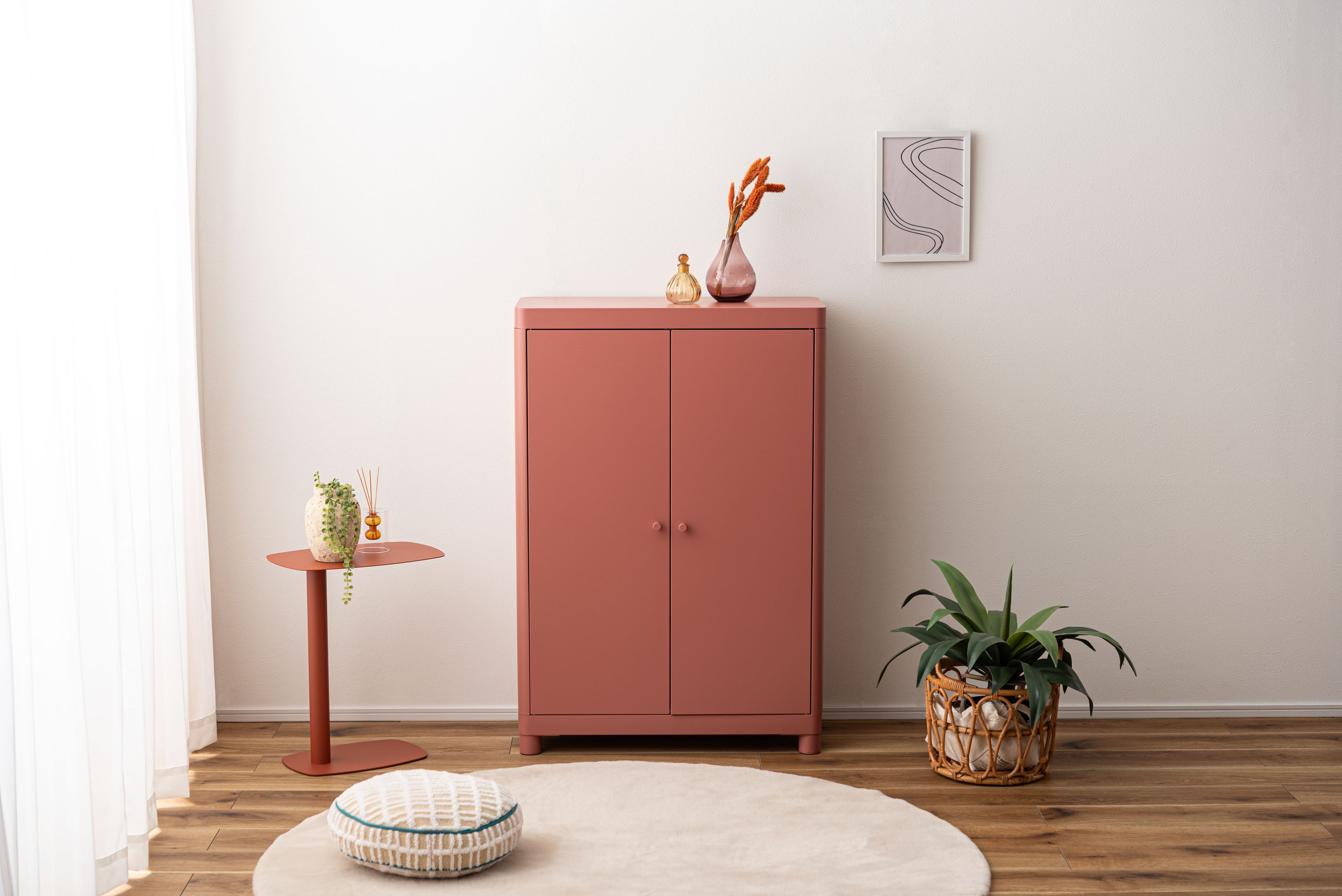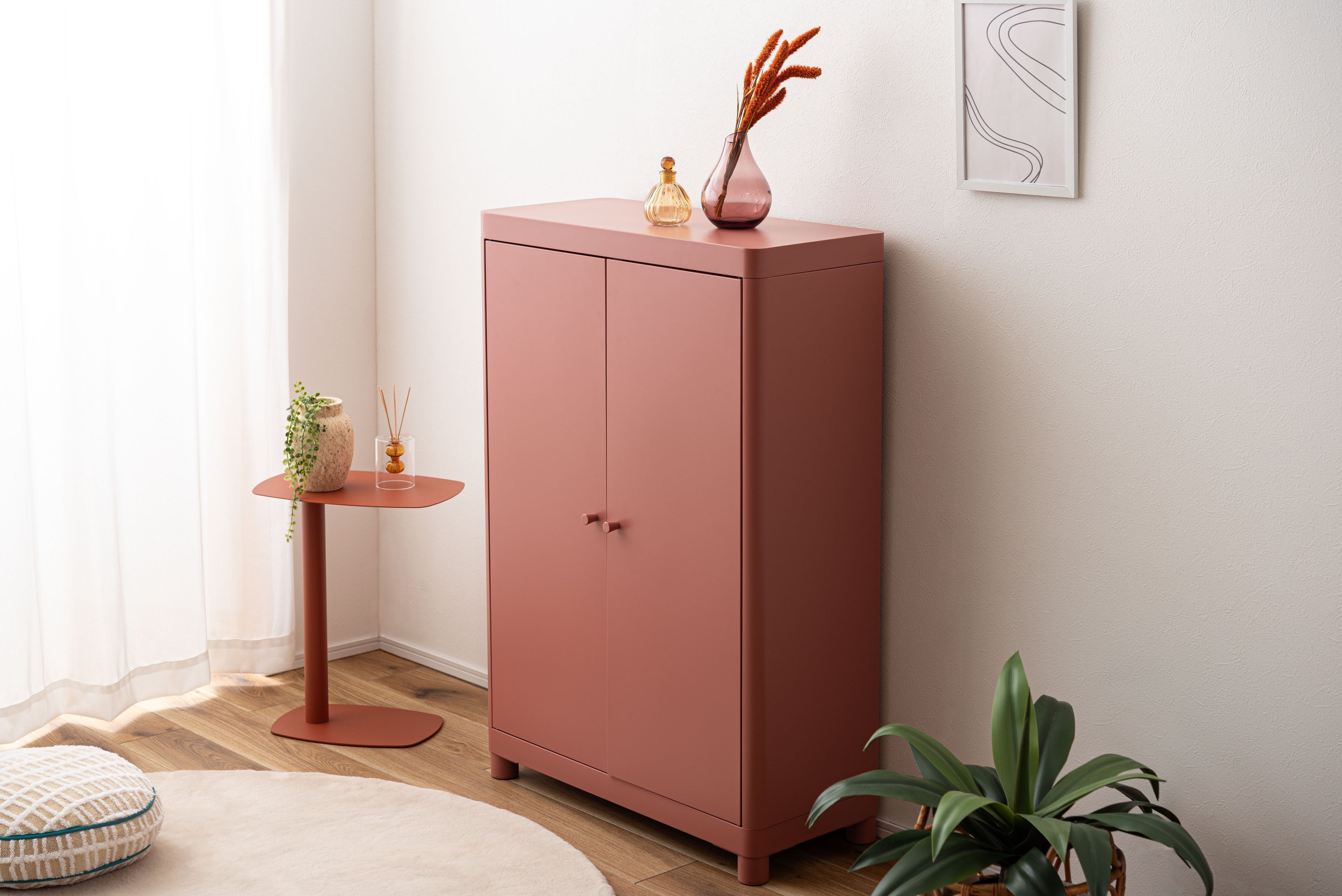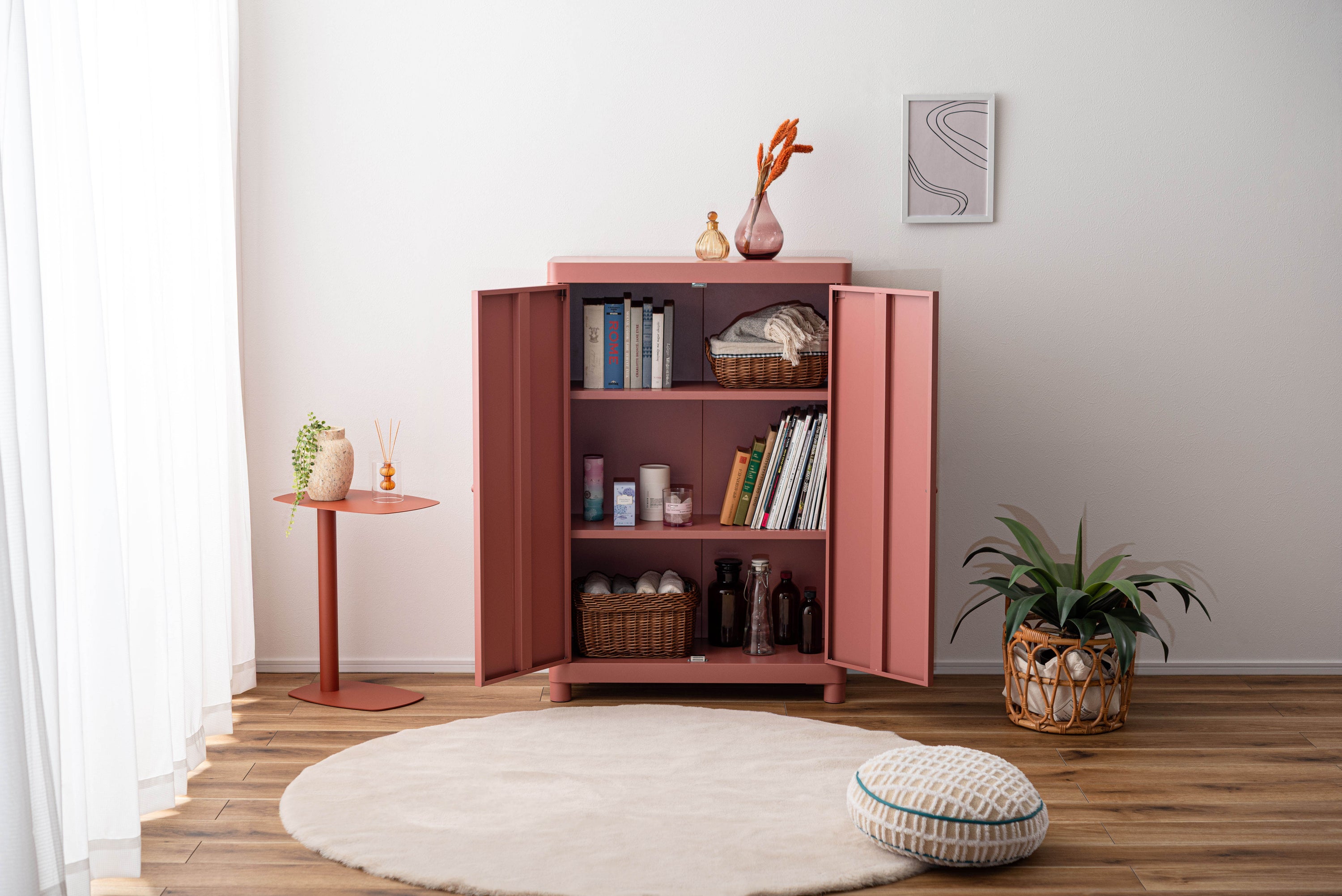 マットな質感と洗練されたシンプルデザイン。スチールを使用したシンプルでモダンなチェスト。マットな質感となめらかな曲線が美しく、空間に上品な印象を与えます。収納するものによって高さを変えることができる可動棚のため、スペースを活かして使用できます。マグネットキャッチを採用しているため、しっかりとドアを固定します。スチール素材のため磁石やマグネットクリップとの相性が良く、写真やメモを貼って使うこともできます。