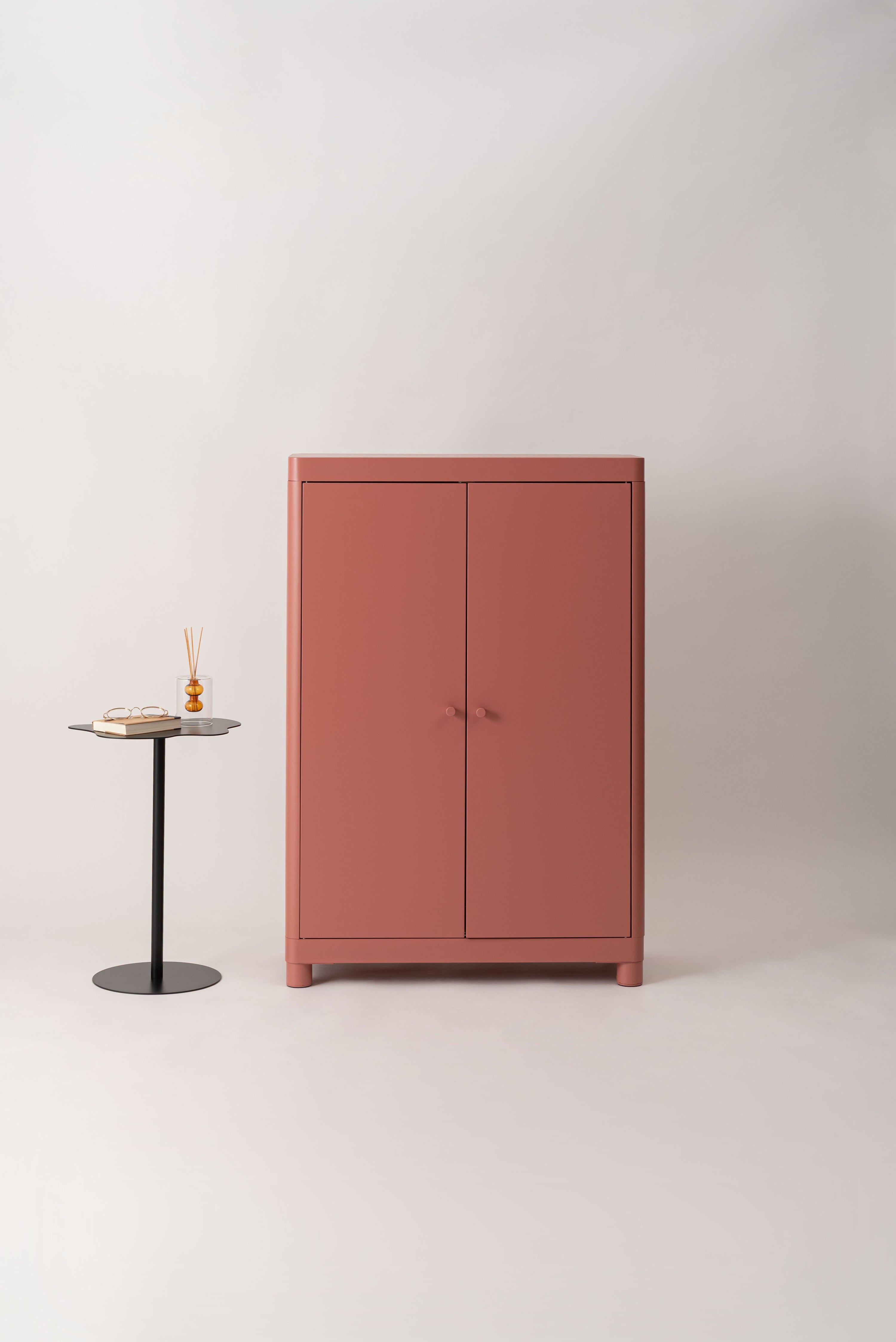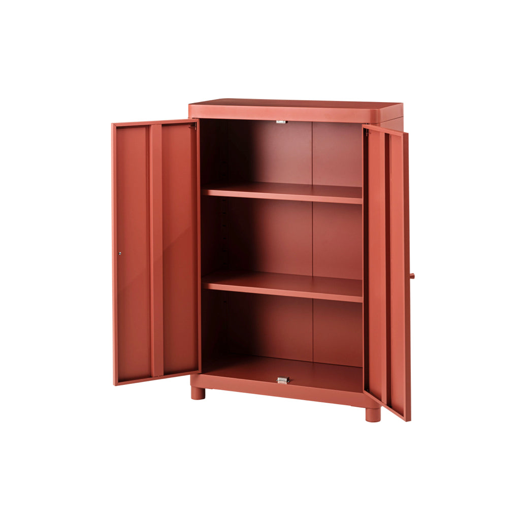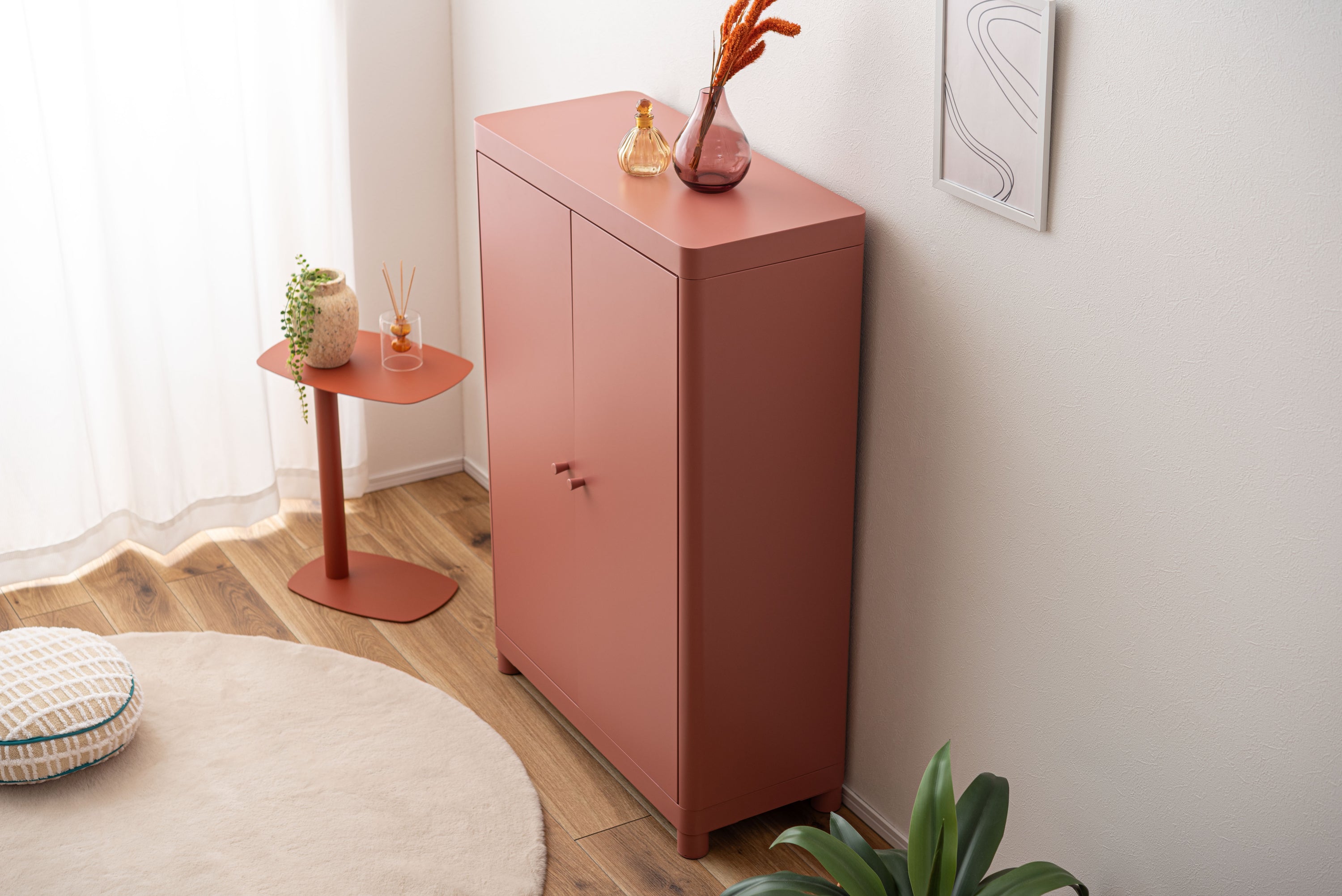 マットな質感と洗練されたシンプルデザイン。スチールを使用したシンプルでモダンなチェスト。マットな質感となめらかな曲線が美しく、空間に上品な印象を与えます。収納するものによって高さを変えることができる可動棚のため、スペースを活かして使用できます。マグネットキャッチを採用しているため、しっかりとドアを固定します。スチール素材のため磁石やマグネットクリップとの相性が良く、写真やメモを貼って使うこともできます。