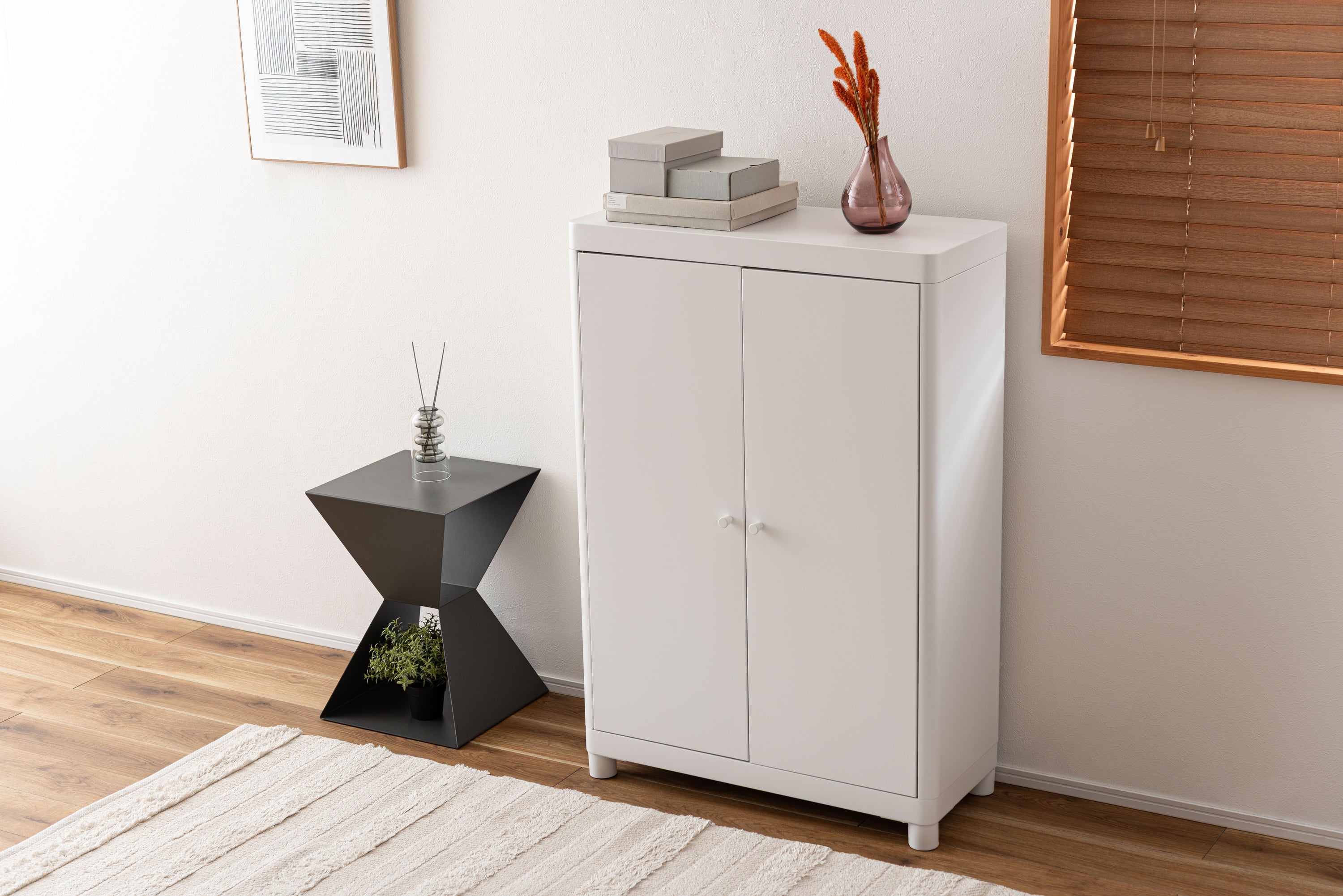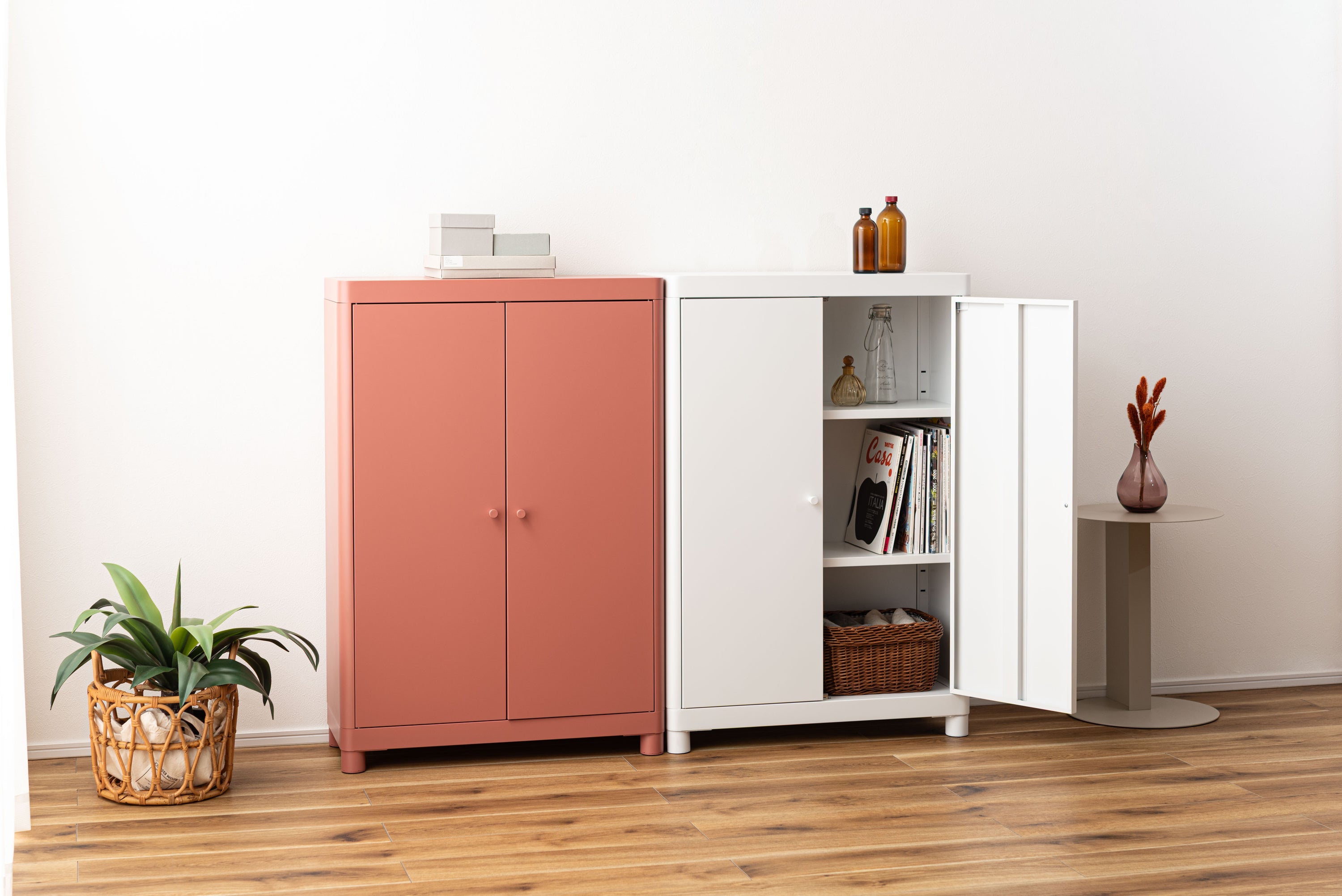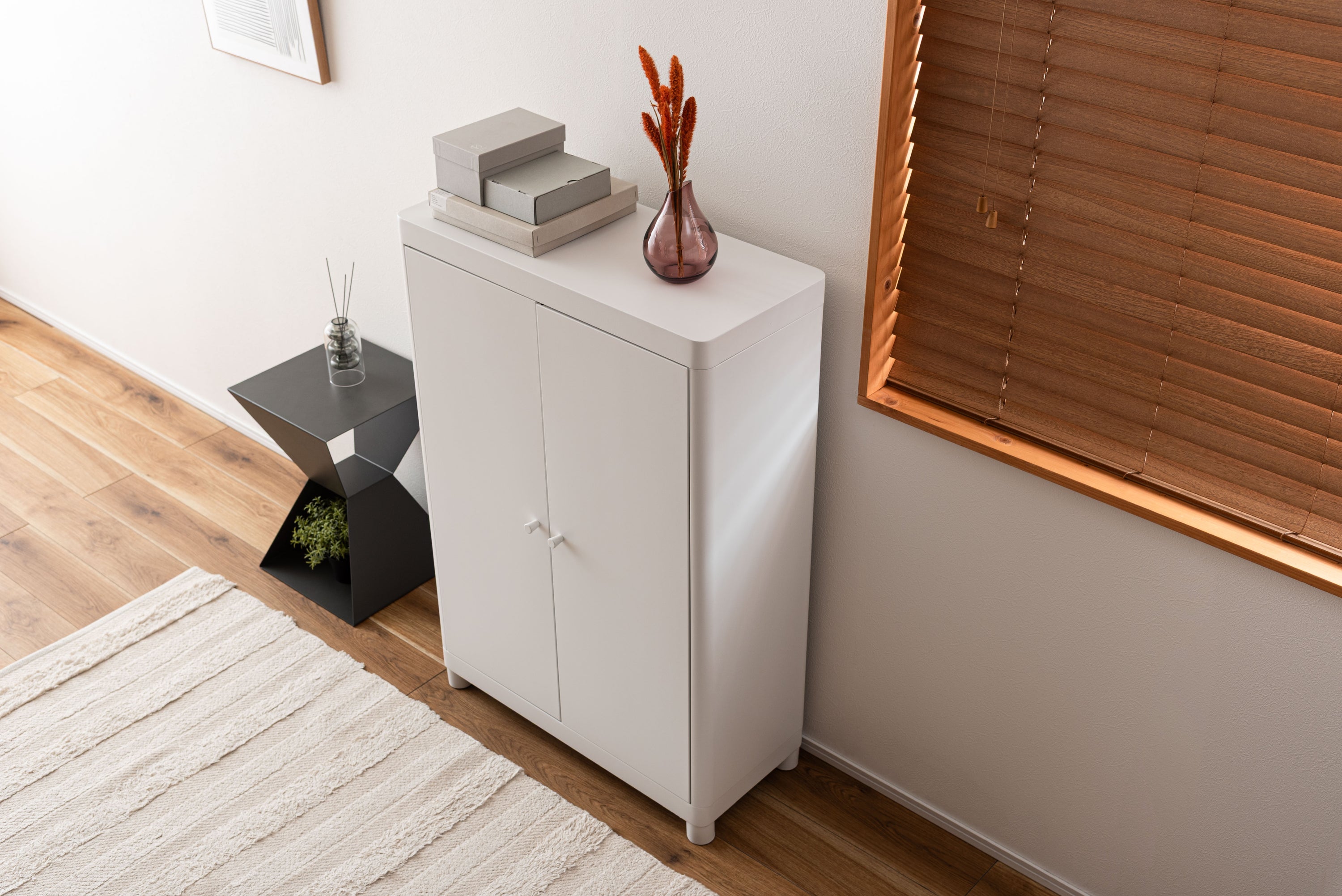 マットな質感と洗練されたシンプルデザイン。スチールを使用したシンプルでモダンなチェスト。マットな質感となめらかな曲線が美しく、空間に上品な印象を与えます。収納するものによって高さを変えることができる可動棚のため、スペースを活かして使用できます。マグネットキャッチを採用しているため、しっかりとドアを固定します。スチール素材のため磁石やマグネットクリップとの相性が良く、写真やメモを貼って使うこともできます。