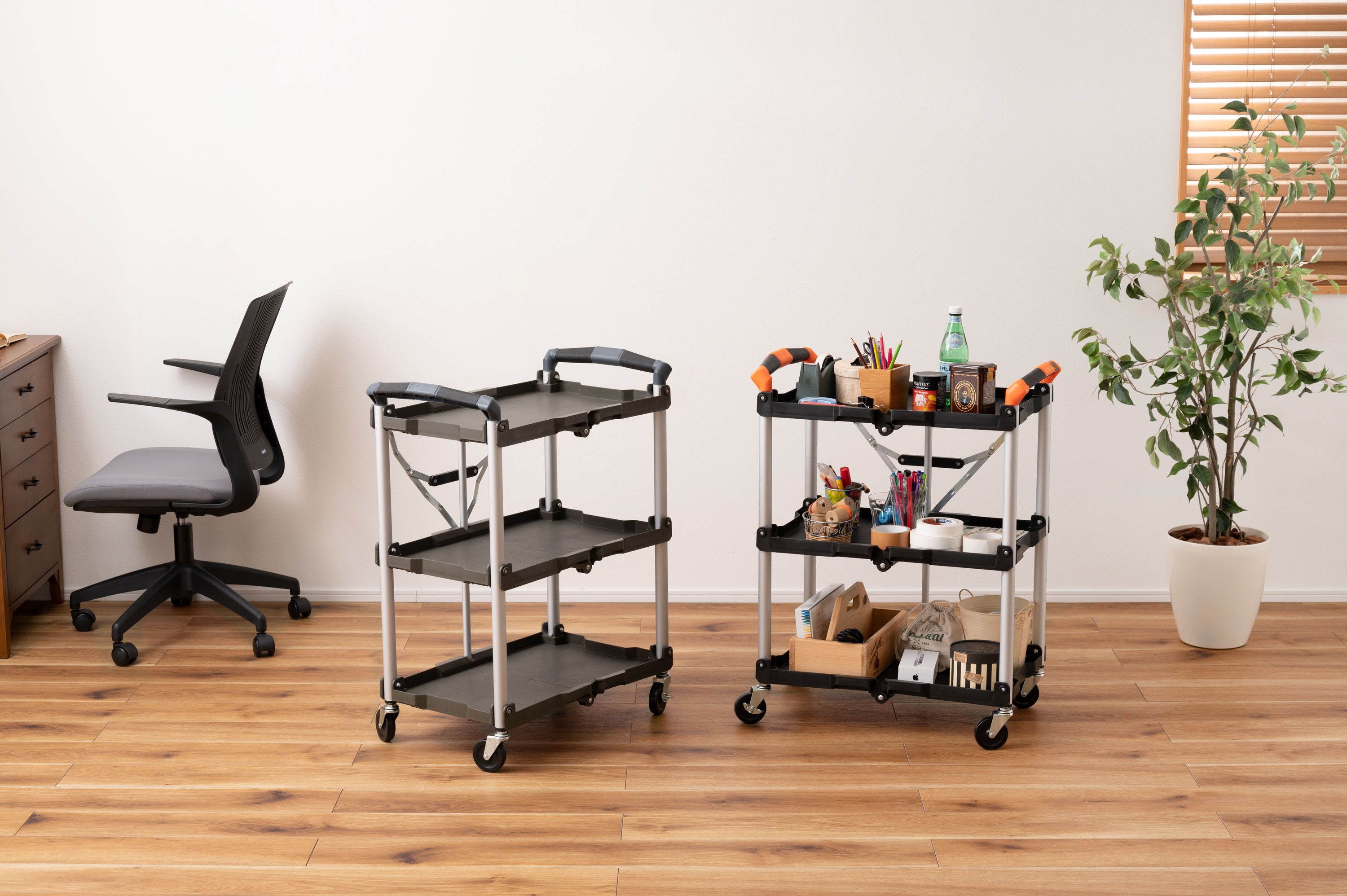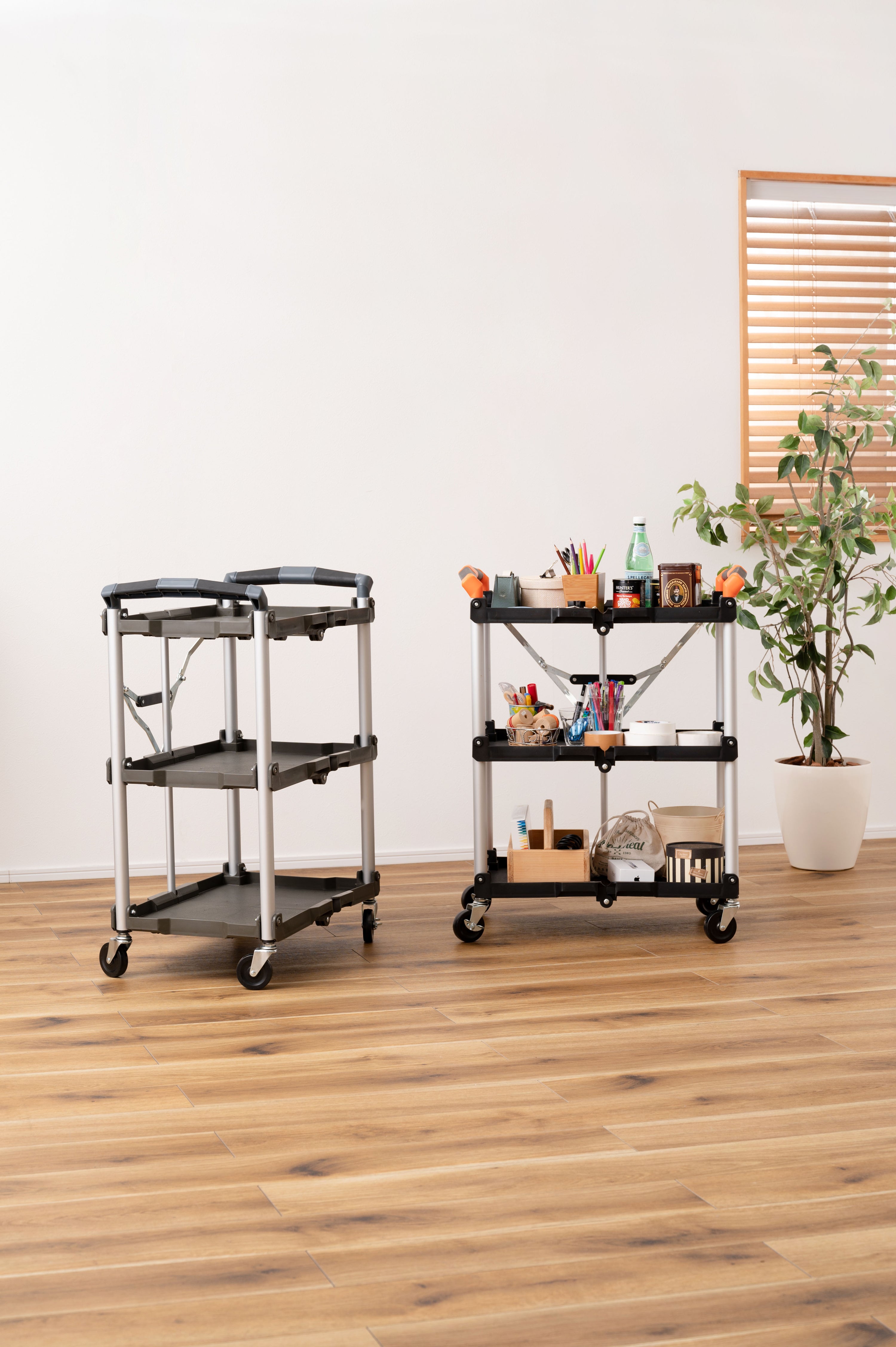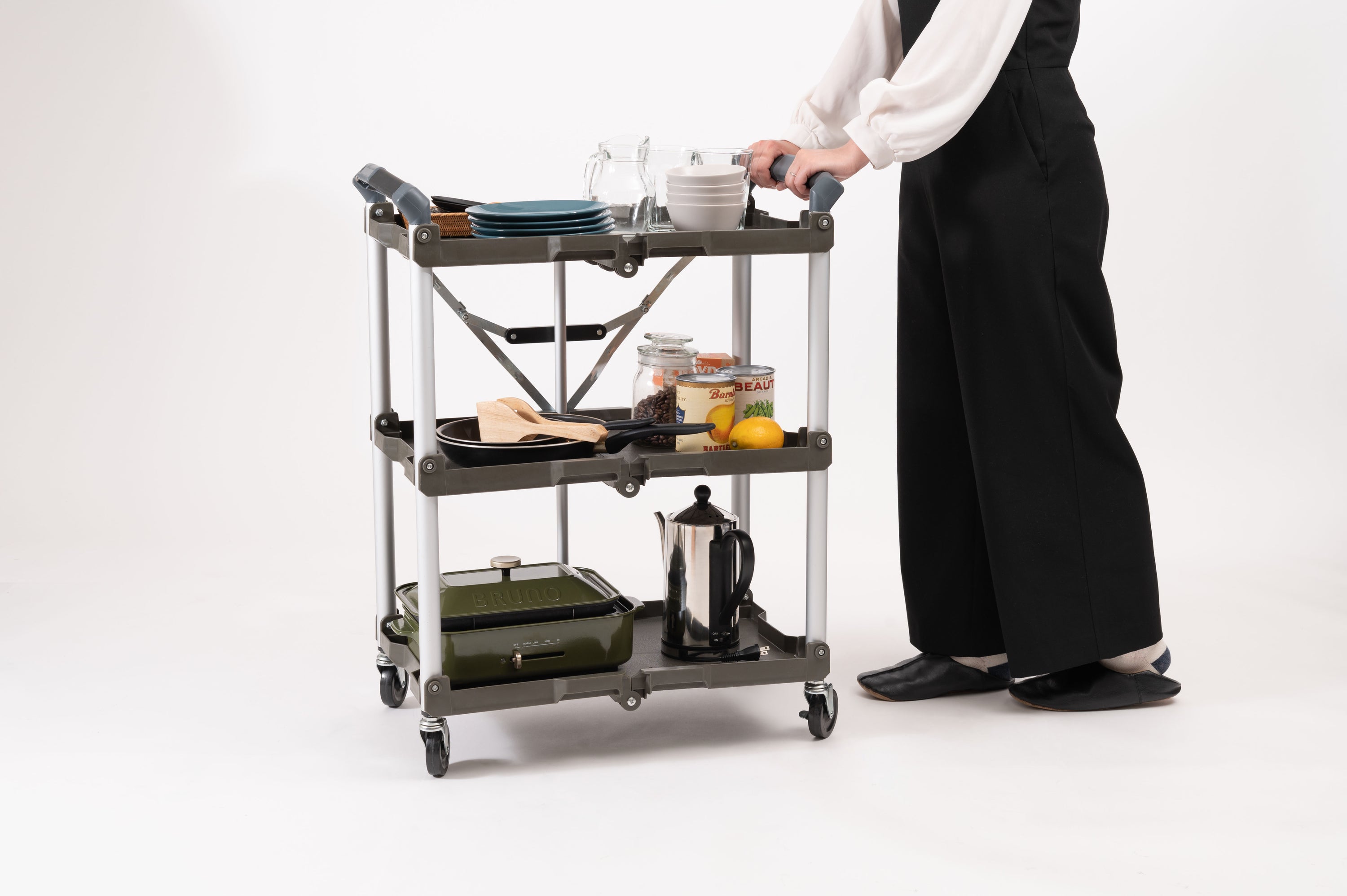 ROOMESSENCEのフォールディングワゴングリーンです。使い勝手の良さとデザイン性を両立を備え、幅広いシーンで活躍します。ブランドの美意識を感じる佇まいで、日常づかいから来客時まで幅広く対応。品番:WG-305KH。暮らしに上質なアクセントを添える一品です。