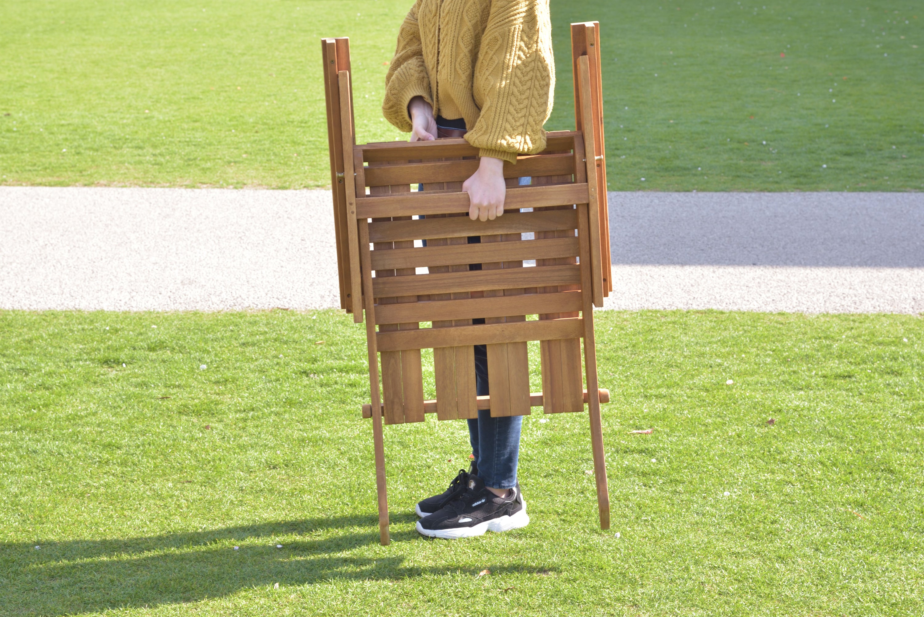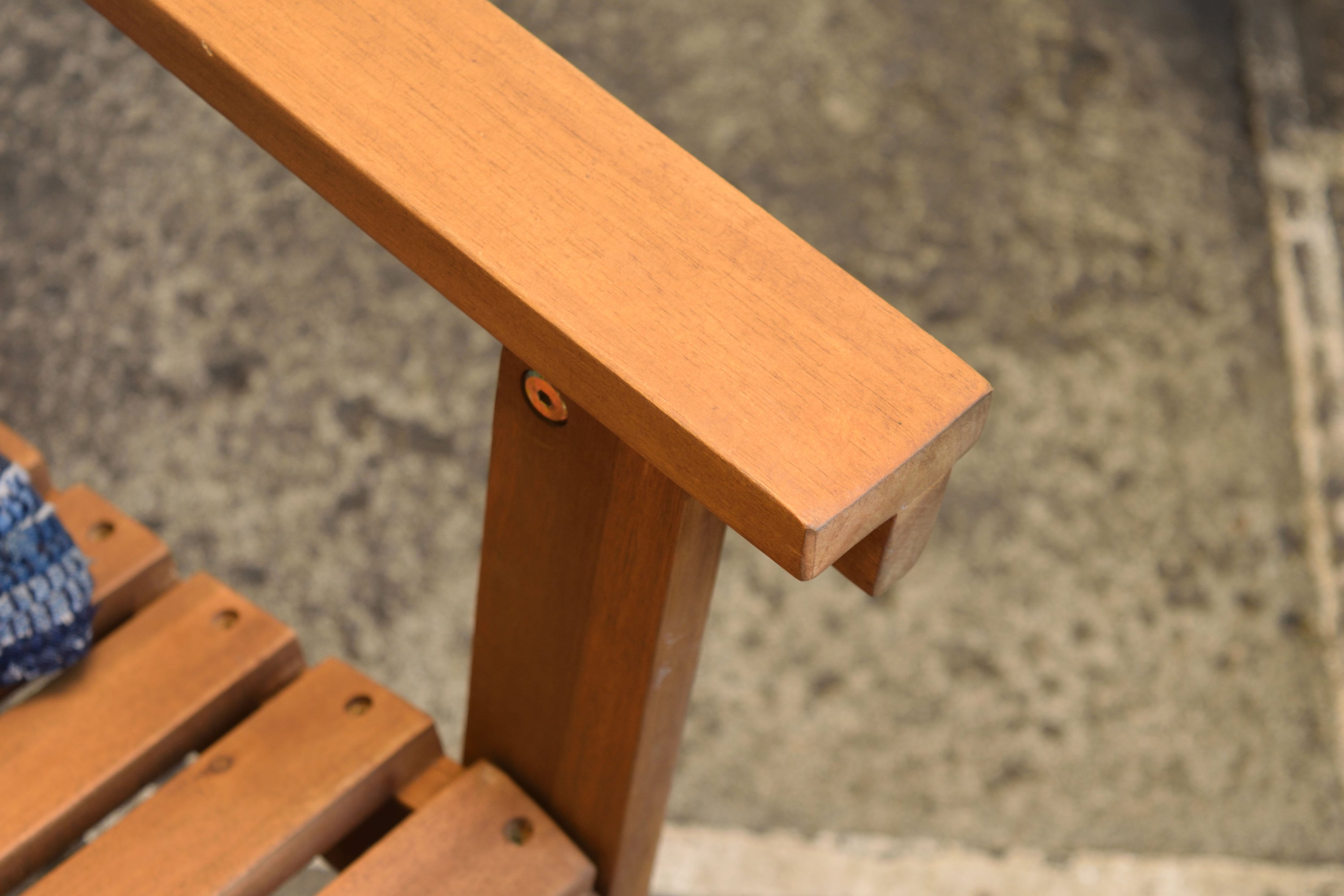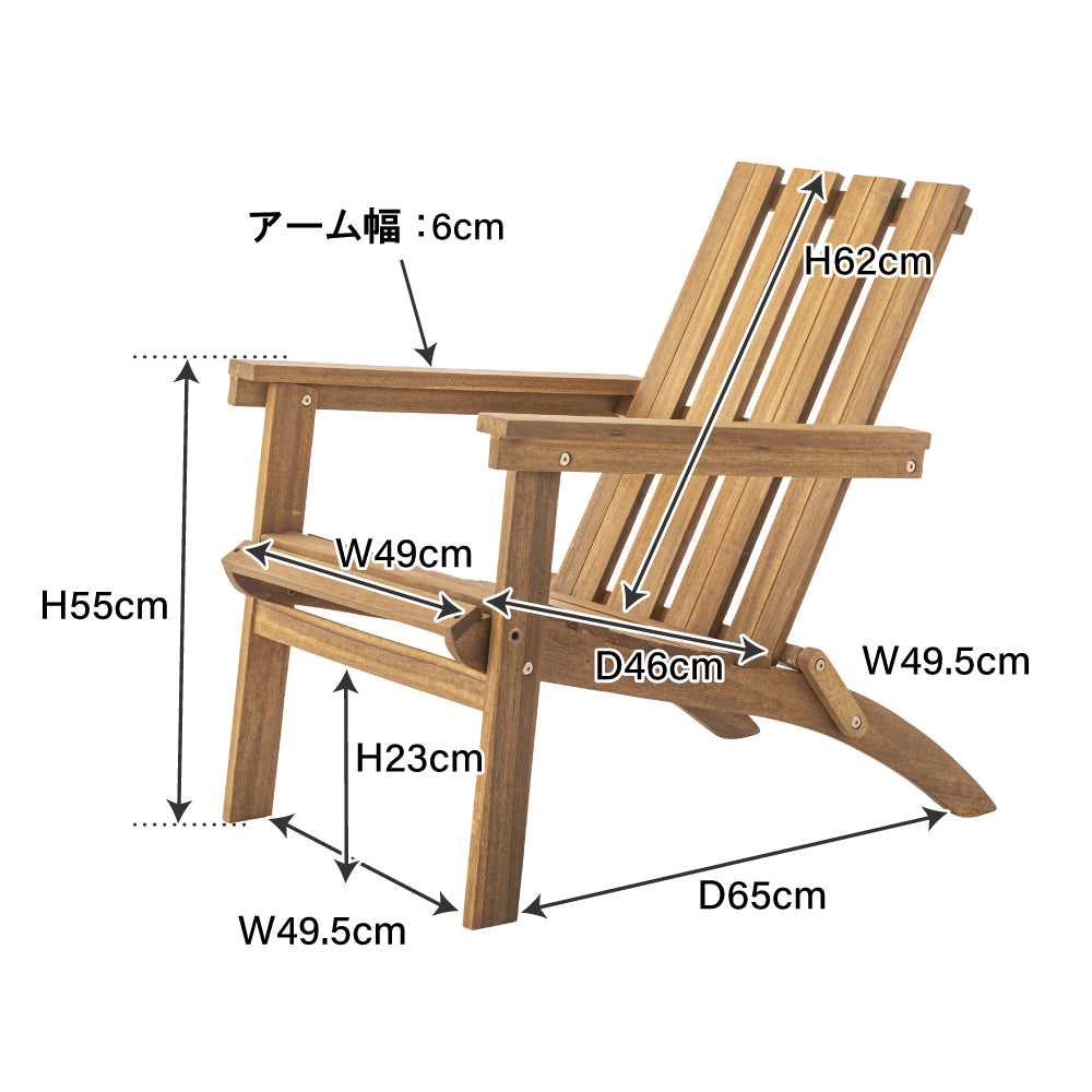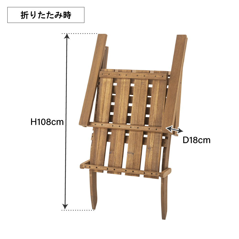 肘掛け付きでゆったりと座れる折りたたみチェア。 アカシアの木目が美しく、室内外問わずインテリアとして、折りたたみ可能なので持ち運んでキャンプ用としても最適です。